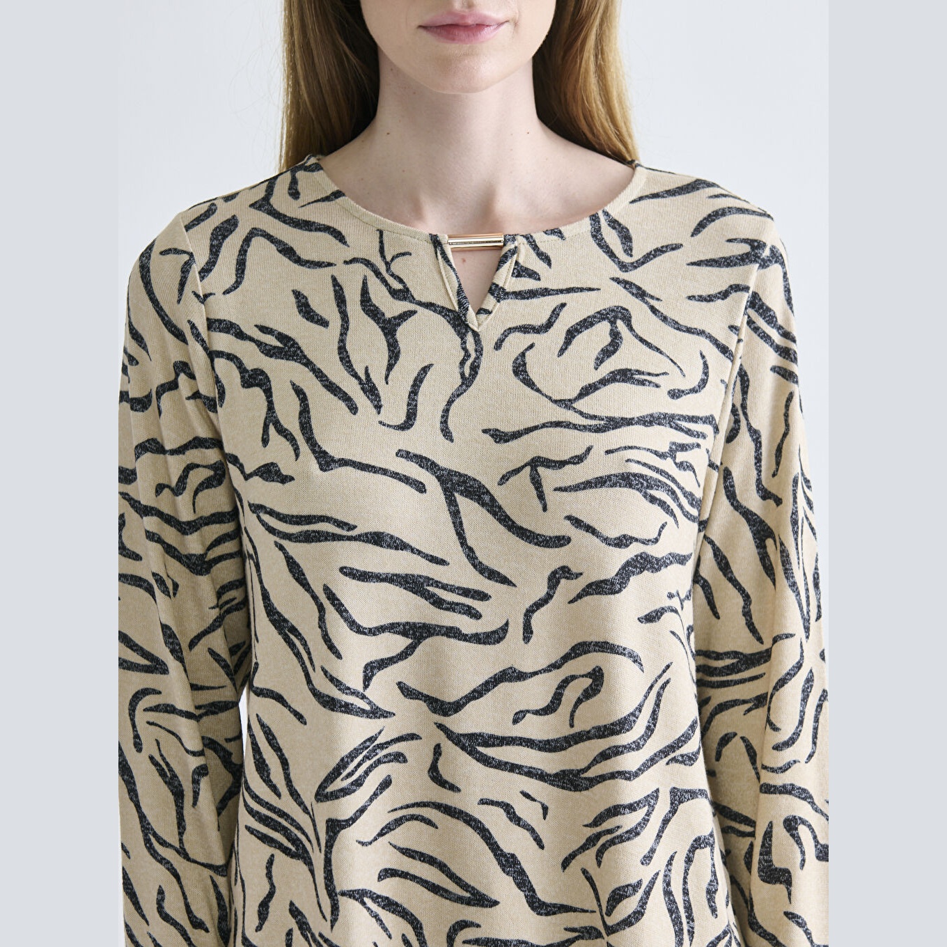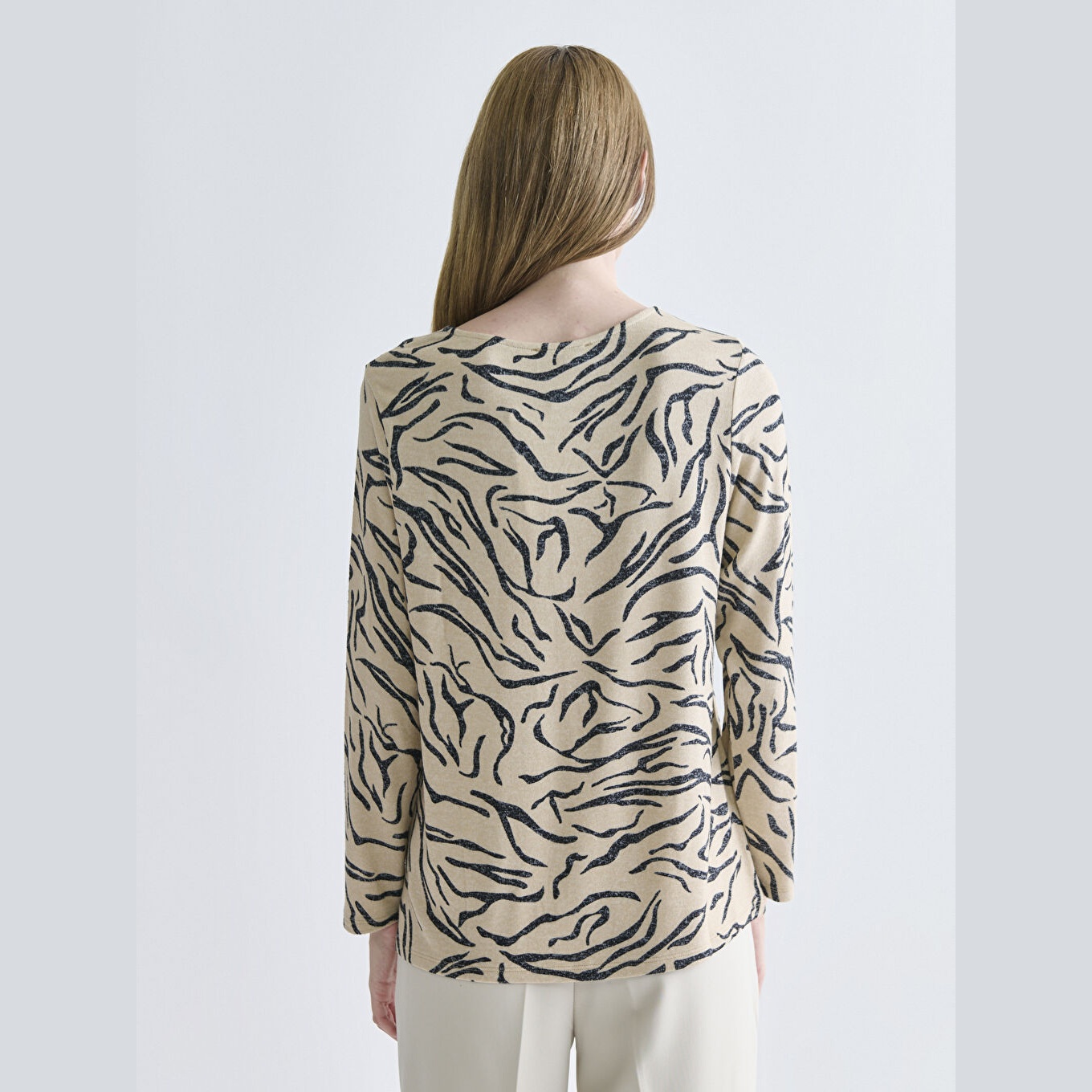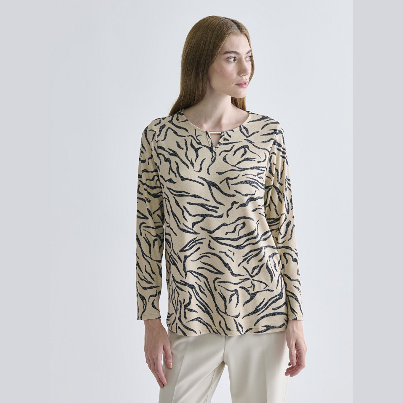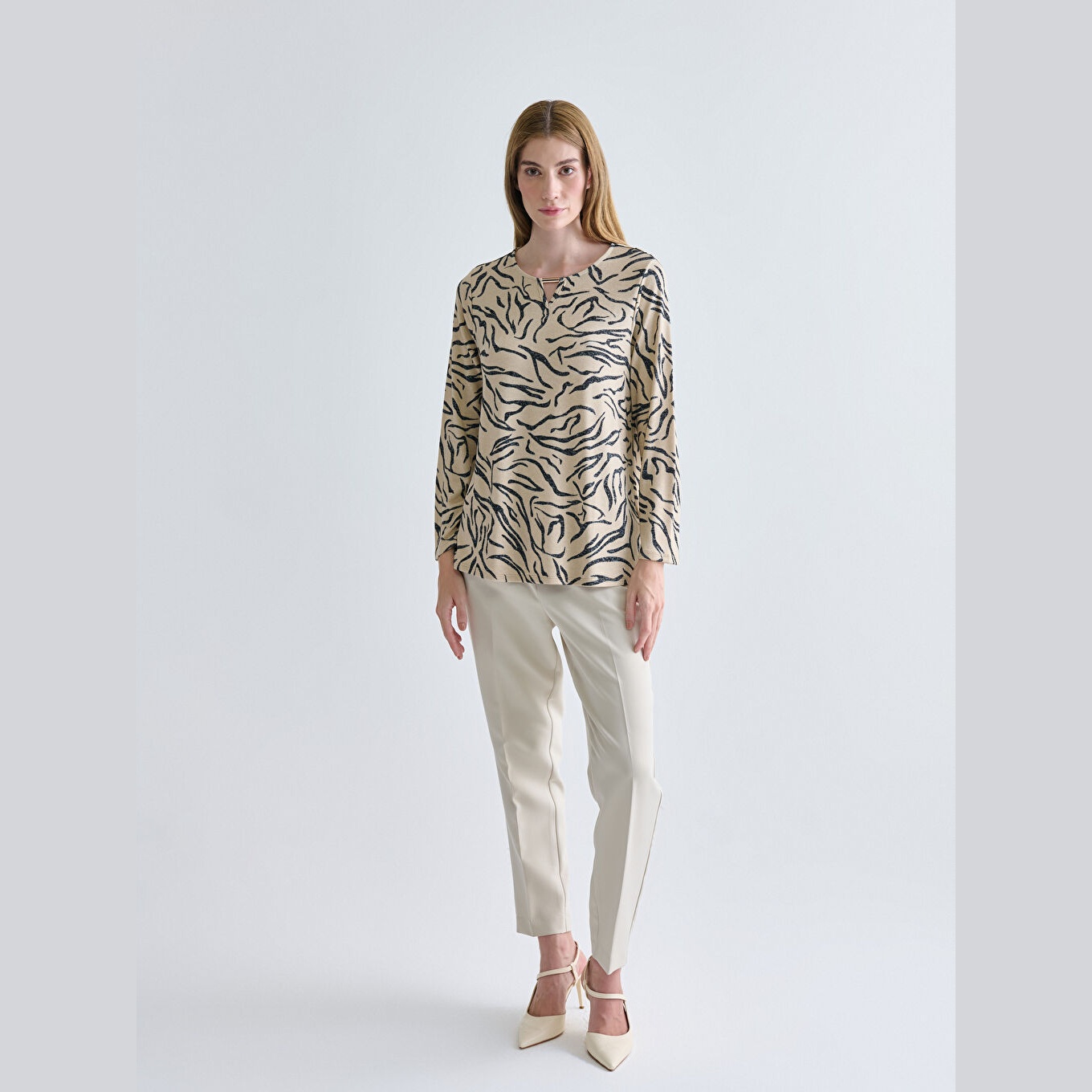 بلوز نسائي بياقة دائرية – بيج مزين بنقشة ناعمة (ياقة دائرية، خامة بوليستر، قصة قياسية، تصميم عملي، بطول الورك)