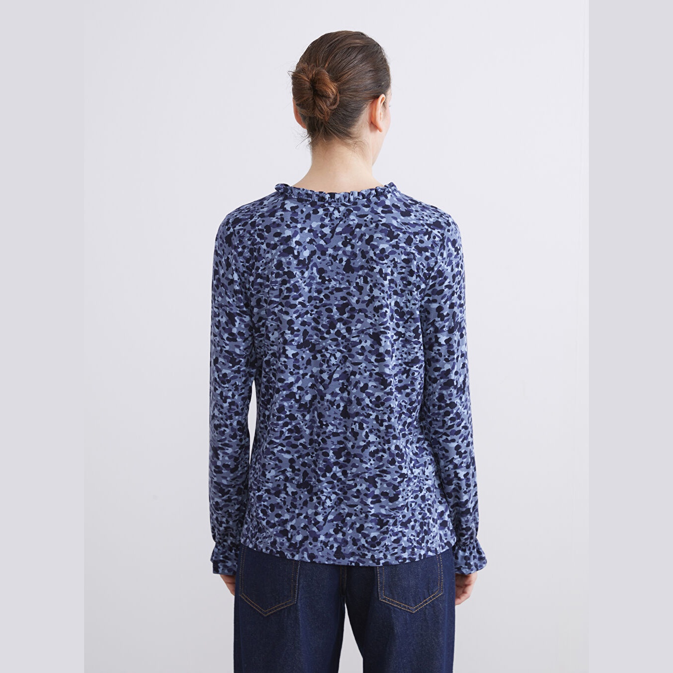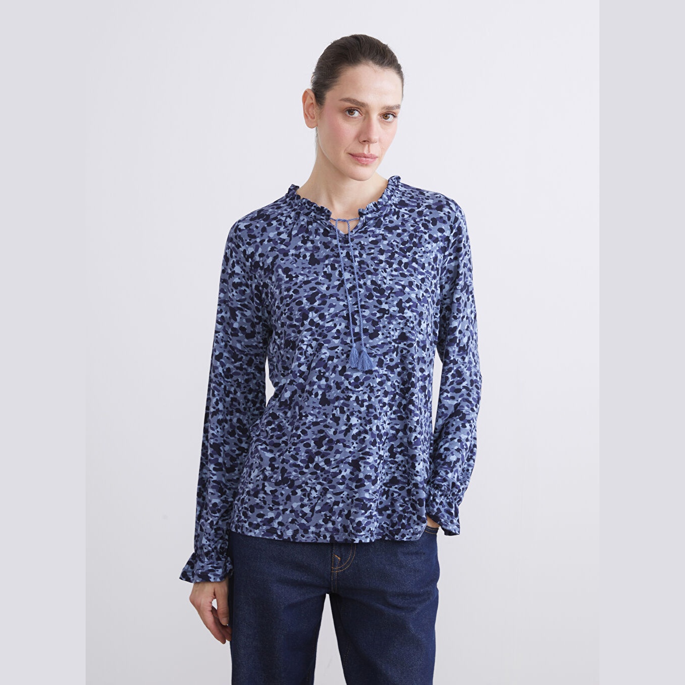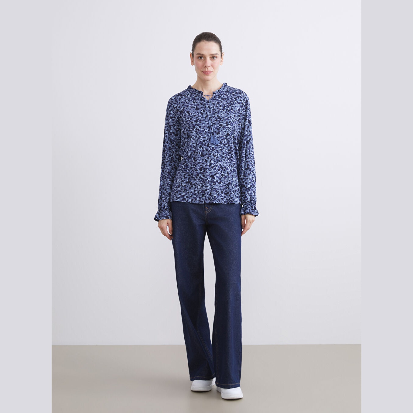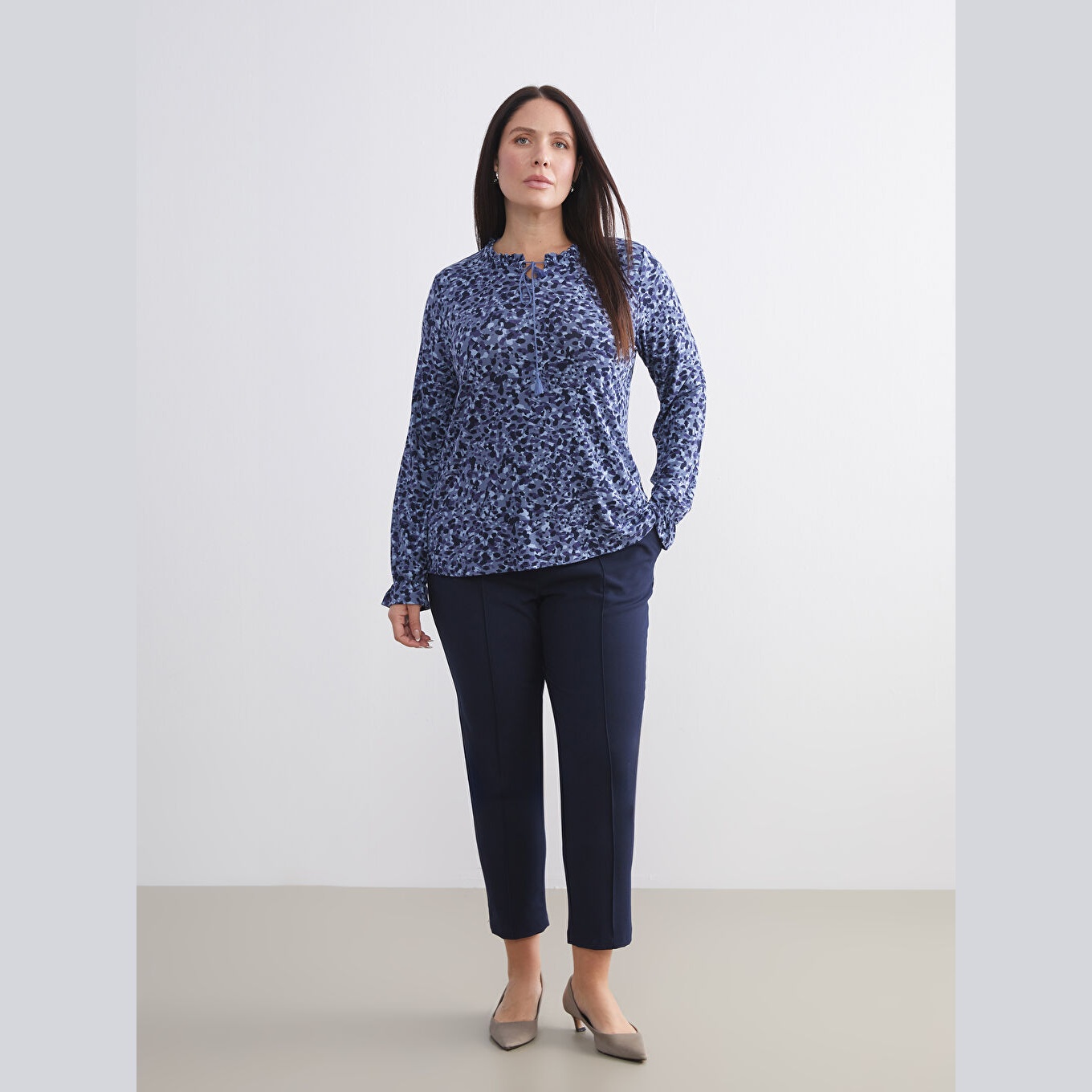 بلوز أنيق بلون كحلي مزين بنقشة ناعمة من مجموعة LCW Büyük Beden – الأزياء العملية للمقاسات الكبيرة، يتميز بياقة مربوطة أنثوية مع تفصيل كشكش أمامي يضفي لمسة ناعمة ومفعمة بالحيوية. القصة قياسية (Regular Fit) تمنحك مظهرًا متوازنًا ومريحًا. مصنوع من خامة فيسكوز مرنة وخفيفة بتركيبة %97 فيسكوز، %3 إيلاستان، بأكمام طويلة، بسماكة خفيفة، بطول يصل إلى الورك، مثالي للتنسيق مع البنطال القماشي أو الجينز في الإطلالات اليومية أو العملية.