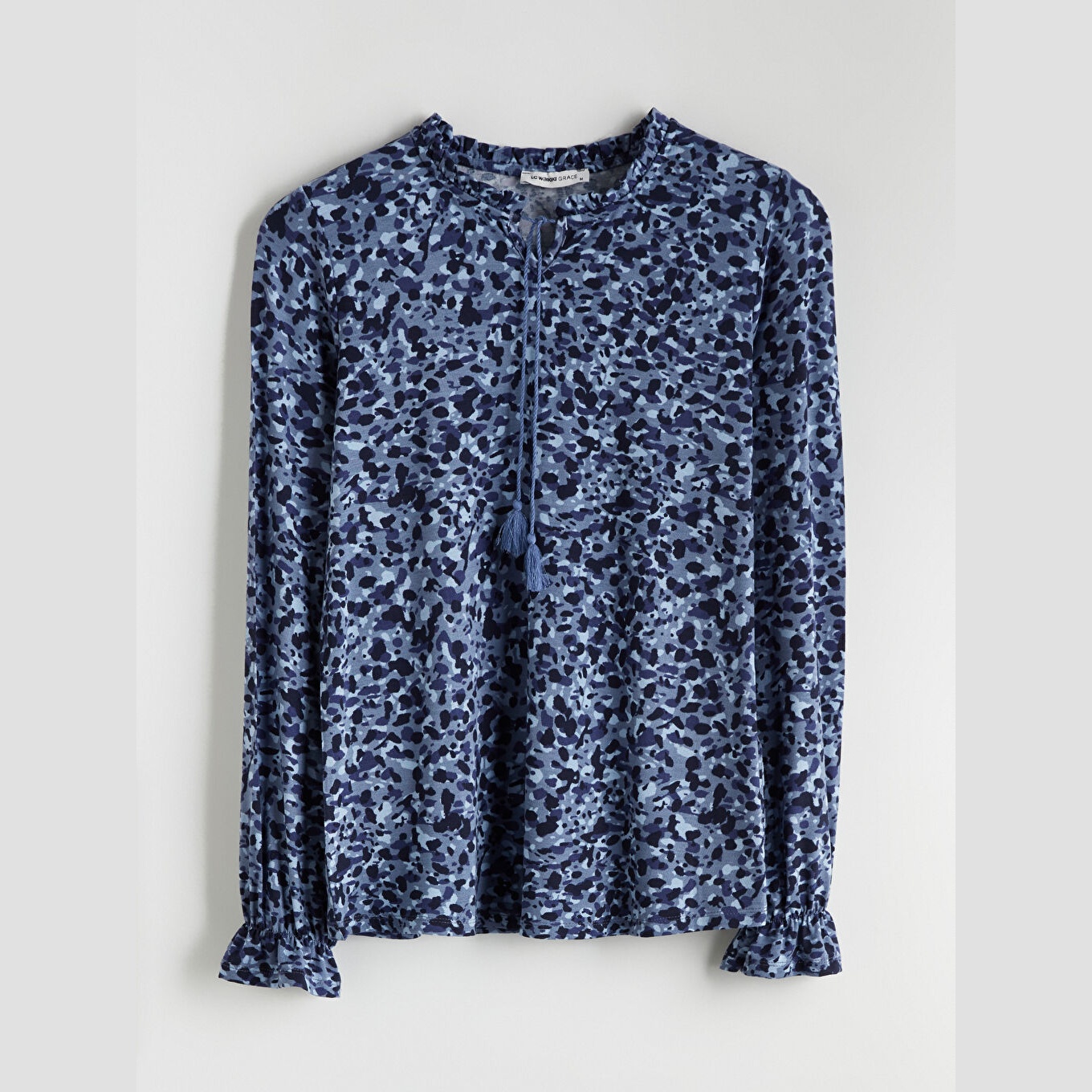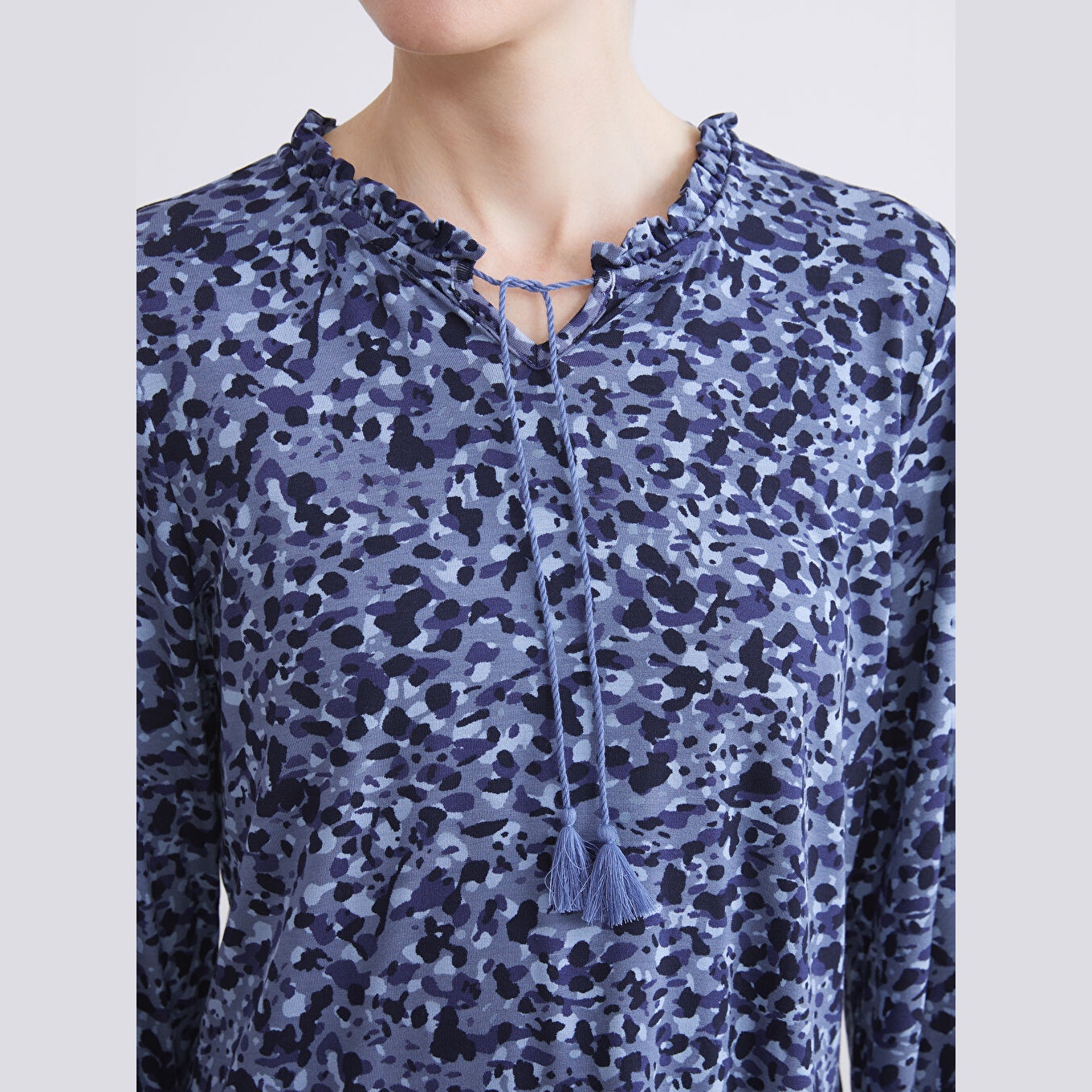 بلوز نسائي فيسكوز بياقة مربوطة بكشكش – كحلي مزين بنقشة ناعمة (ياقة قابلة للربط، خامة مرنة، قصة قياسية، تصميم عملي، بطول الورك)