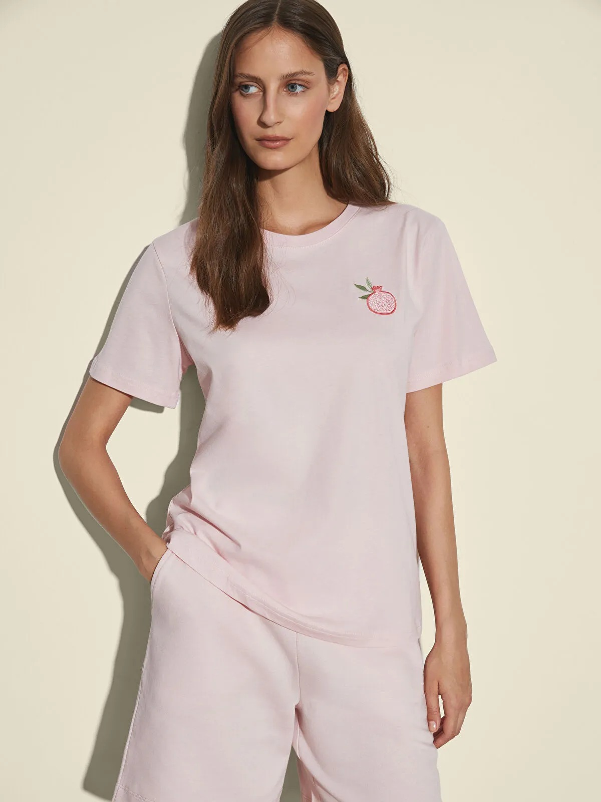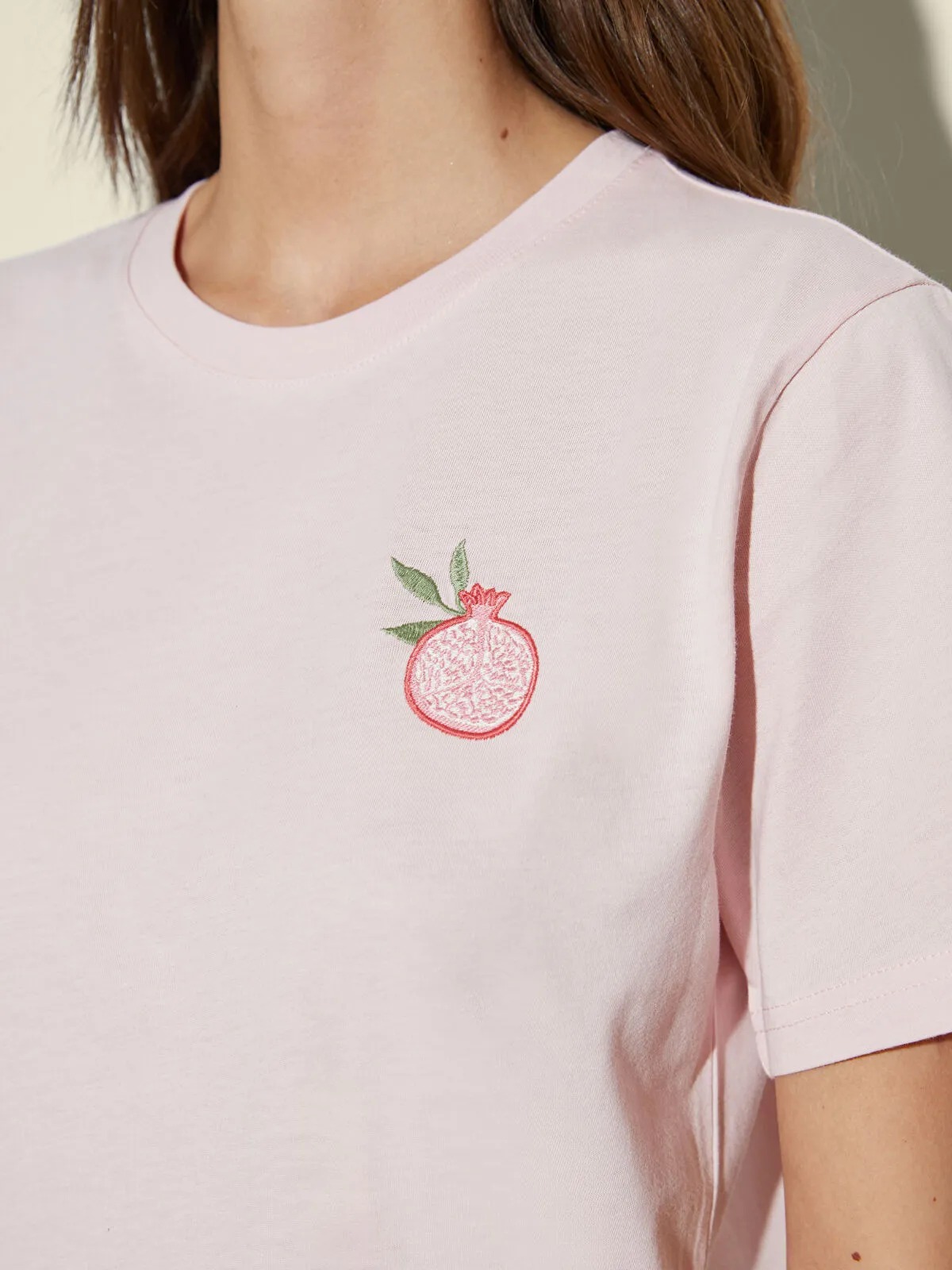 تيشيرت نسائي بياقة دائرية قصيرة وأكمام قصيرة، مزين بتطريز أنيق يبرز بتفاصيل زخرفية تضفي لمسة أنثوية فاخرة. تصميم Regular Fit يمنح حرية حركة وراحة طوال اليوم، مثالي للإطلالات اليومية الكاجوال بأسلوب راقٍ ومريح.
