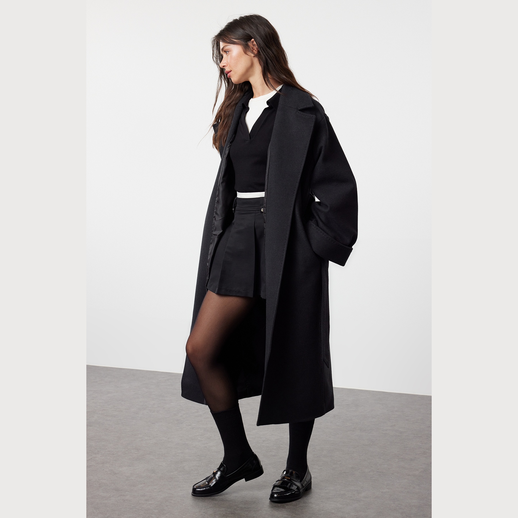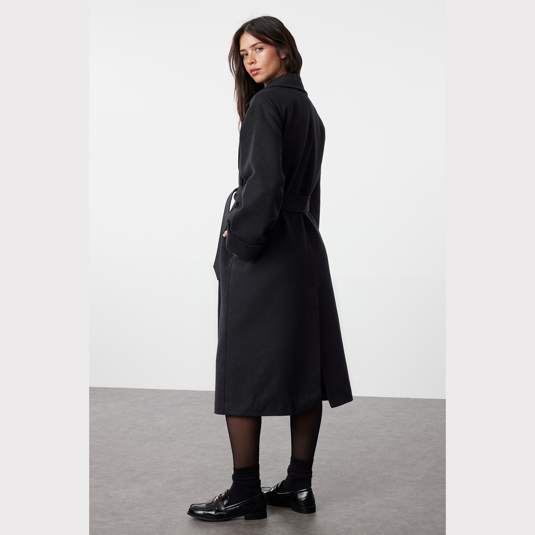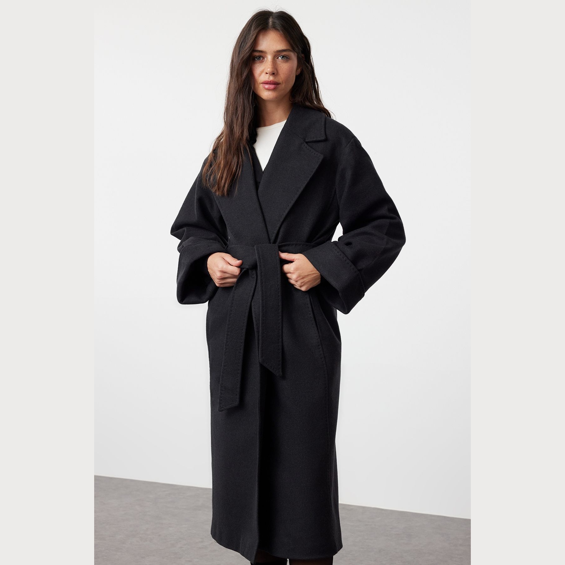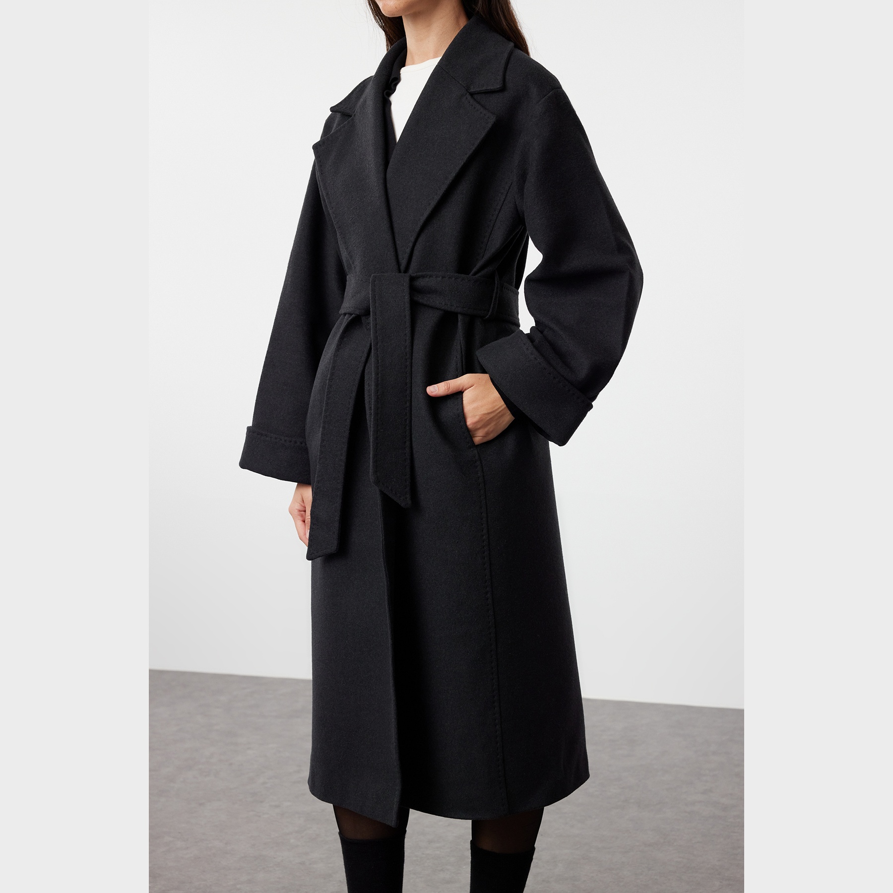 كاب شتوي أنيق بلون أنْتراسيت رمادي غامق من مجموعة Trendyolmilla – لأناقة شتوية ناعمة بلمسة خياطة مميزة، يتميز بقصة Oversize واسعة وطول ماكسي مع ياقة كروڤاز مزدوجة، وأكمام طويلة، وتفاصيل خياطة بارزة تضيف طابعًا عصريًا، مصنوع من خامة ناعمة الملمس (Örme Kumaş) بتركيبة تشمل 61% بوليستر، 36% قطن، 3% إيلاستان، ومبطن بالكامل، ما يجعله مثاليًا لأيام الشتاء الباردة.