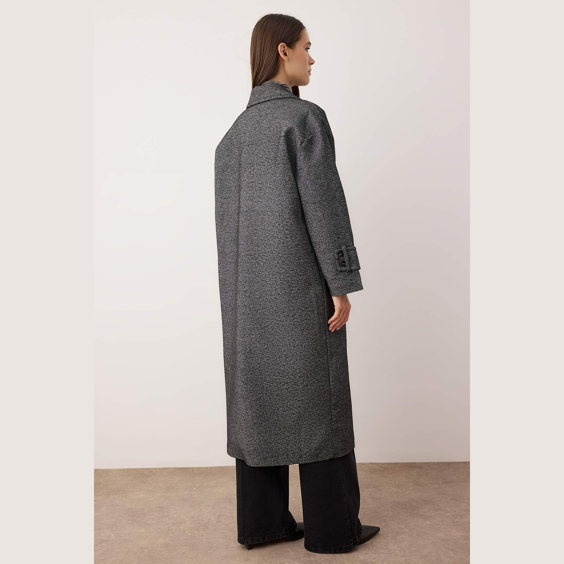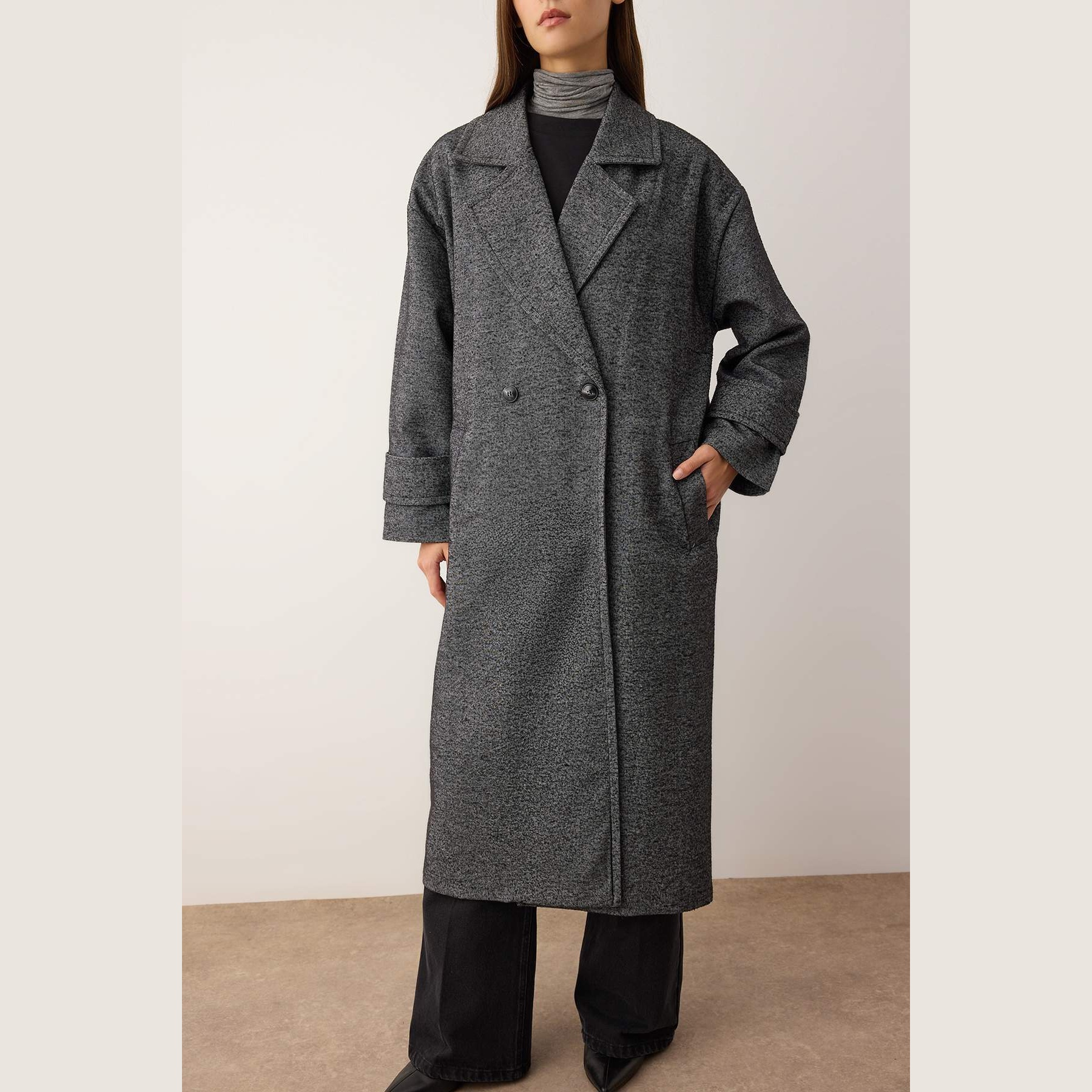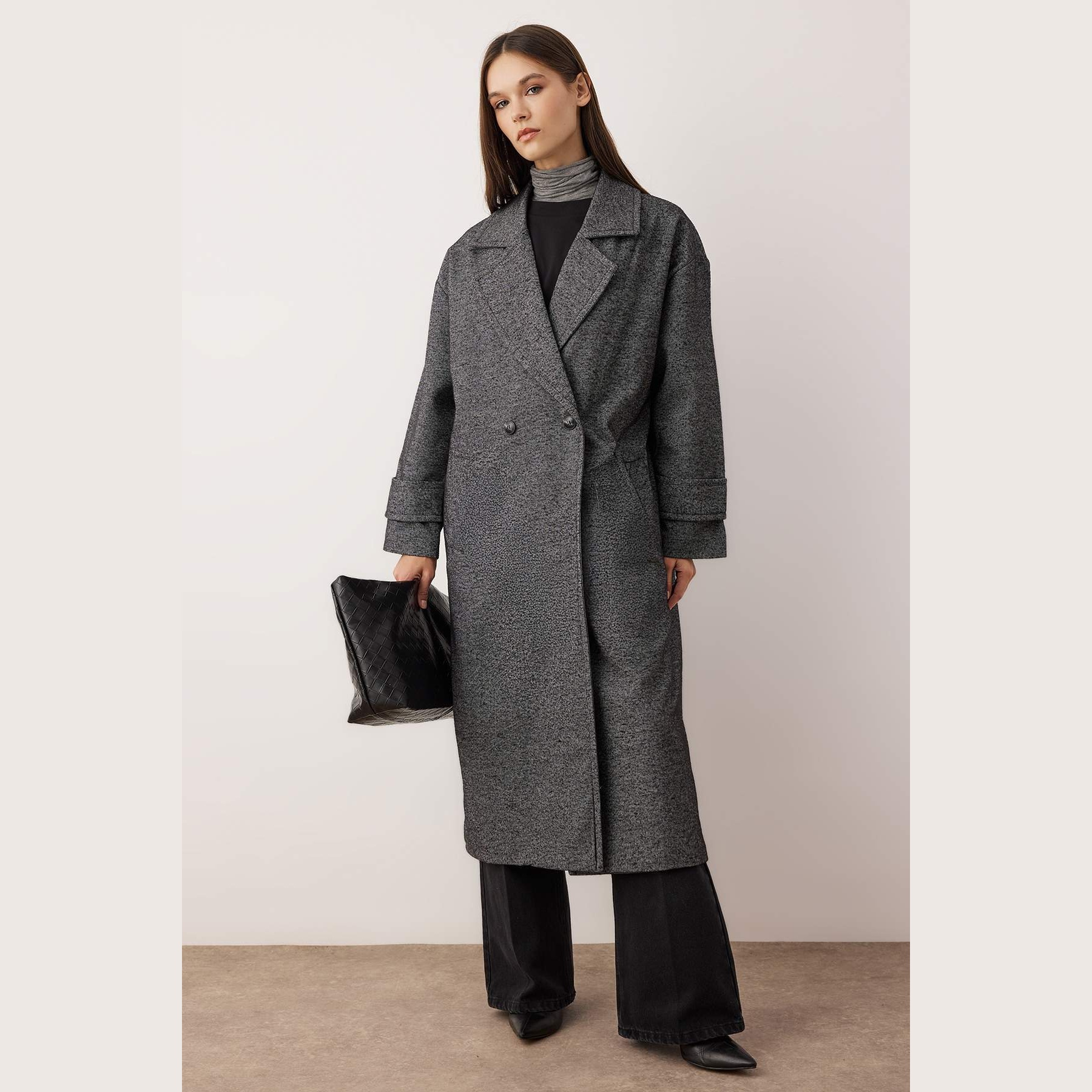 كاب شتوي أنيق بلون رمادي غامق (Koyu Gri) من مجموعة Trendyolmilla – لأناقة شتوية بلمسة كلاسيكية واسعة، يتميز بقصة Oversize واسعة وطويلة مع ياقة كروڤاز مزدوجة، وأكمام طويلة، وإغلاق أمامي مزدوج، مصنوع من خامة كاشمير صوفي (Kaşe Dokuma) بتركيبة 100% بوليستر، ومبطن بالكامل، ما يجعله مثاليًا لأيام الشتاء الباردة.