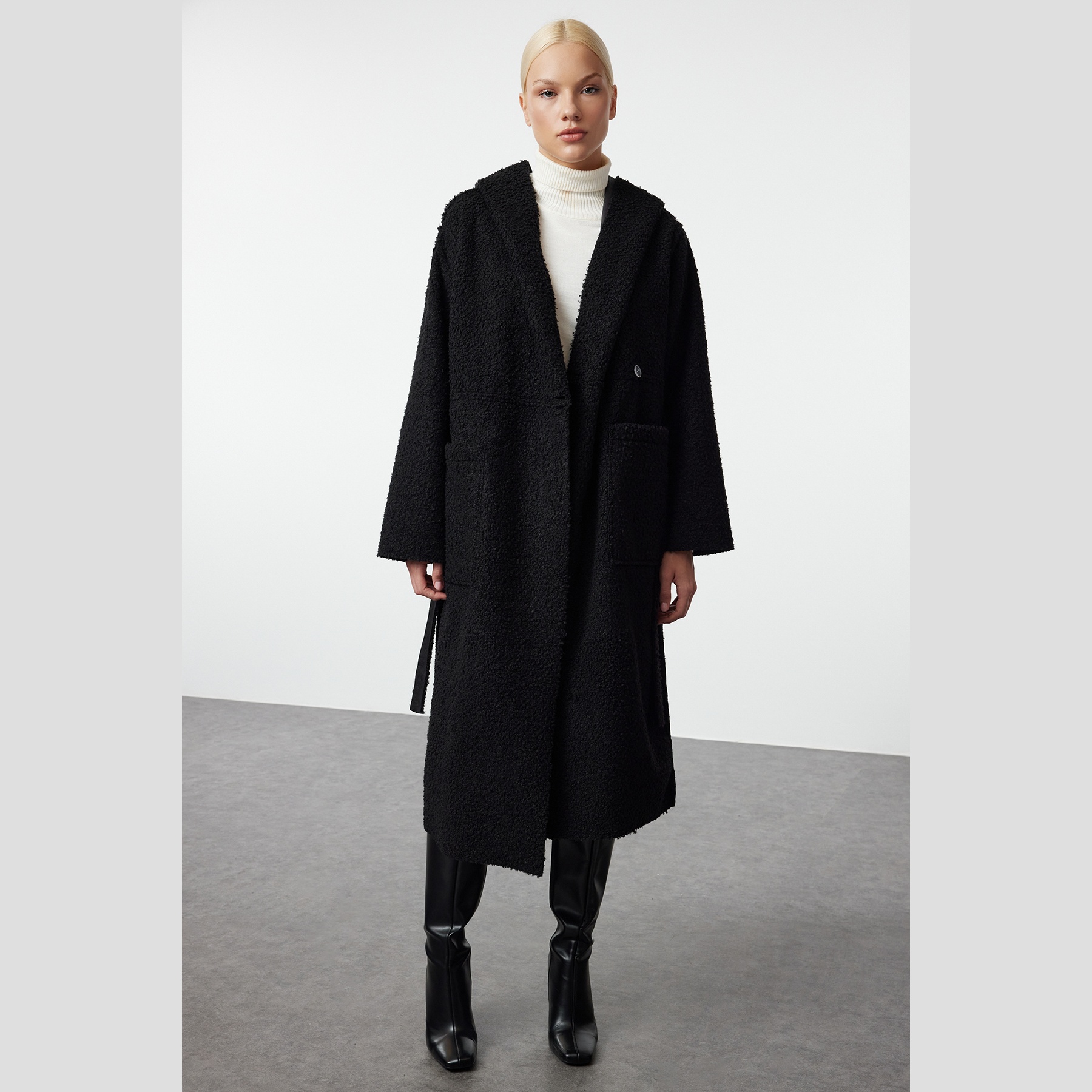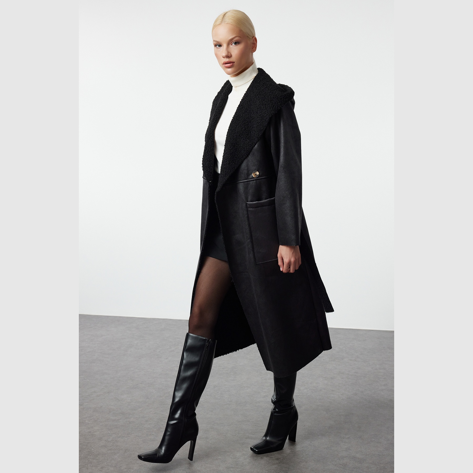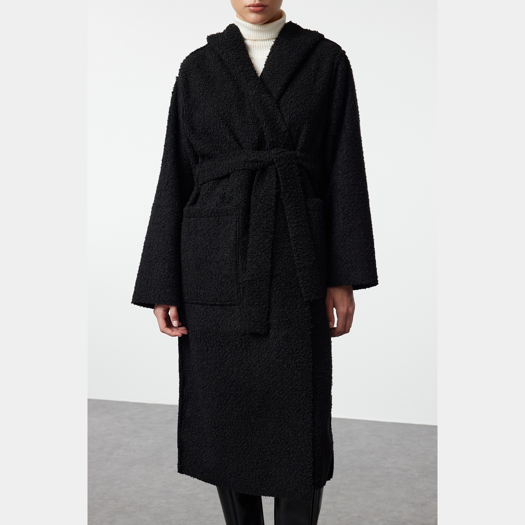 كاب شتوي أنيق بلون أسود موحد من مجموعة Trendyolmilla – لأناقة عملية بلمسة متعددة الاستخدام، يتميز بقصة Oversize واسعة وطويلة مع ياقة كروڤاز مزدوجة، وأكمام طويلة، وتصميم قابل للارتداء من الجهتين (Çift Taraflı)، مصنوع من خامة بولسترية ناعمة (Dokuma Kumaş) بتركيبة 100% بوليستر، بدون بطانة، ما يجعله مثاليًا لأيام الشتاء المعتدلة ويمنحك تنوعًا في الإطلالة.
