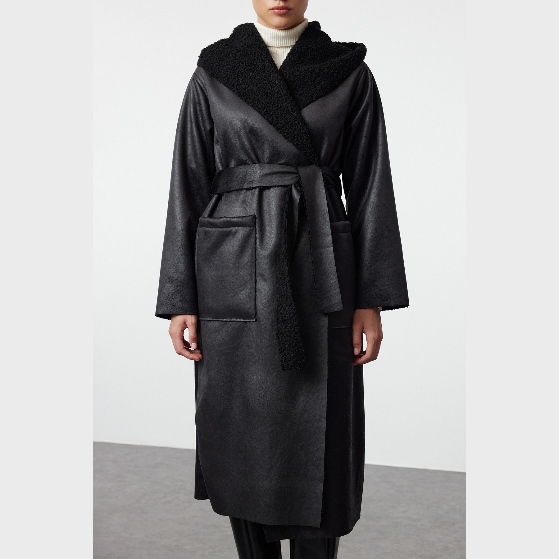 كاب نسائي – أسود مزدوج الوجه بقصة واسعة وطول كامل (تصميم شتوي)