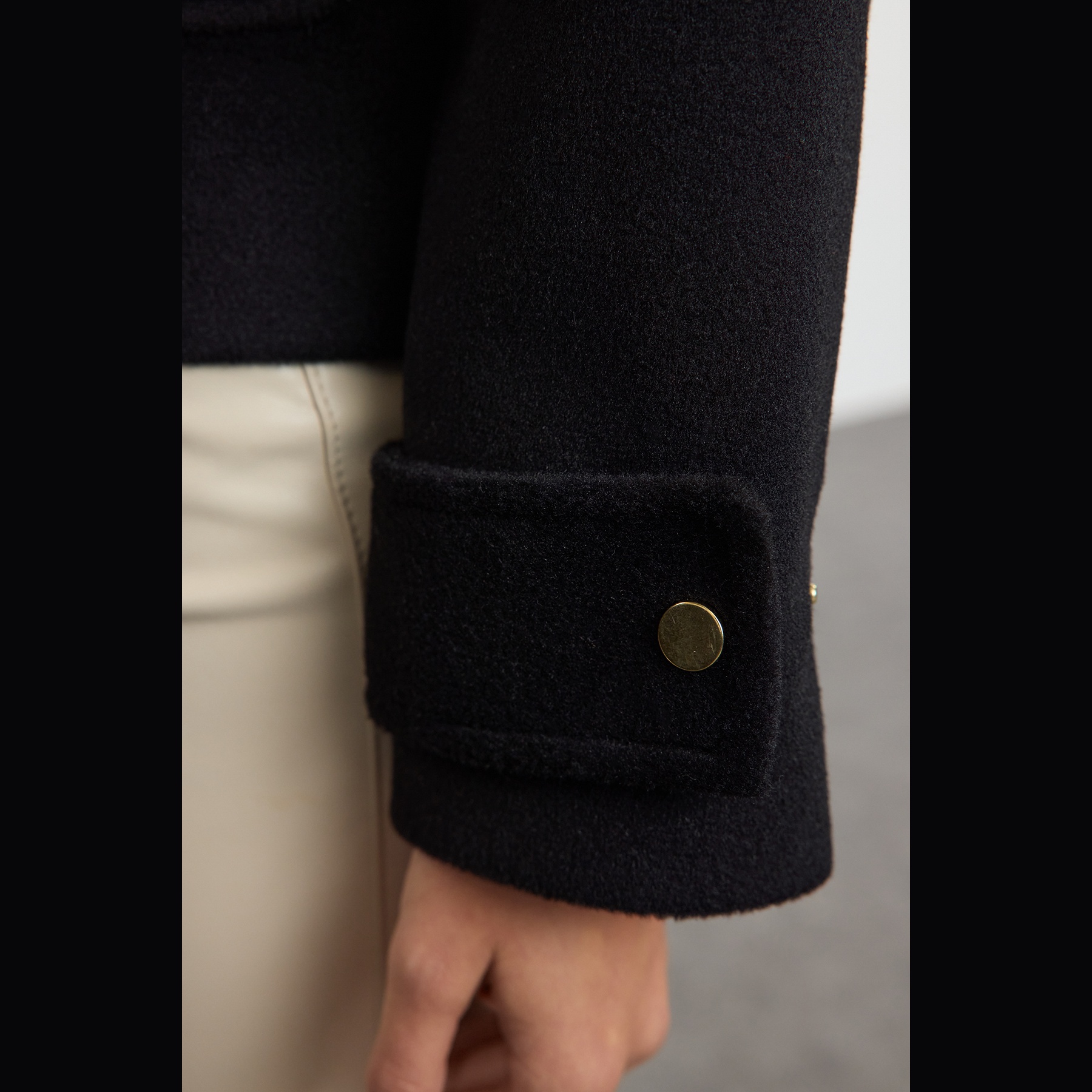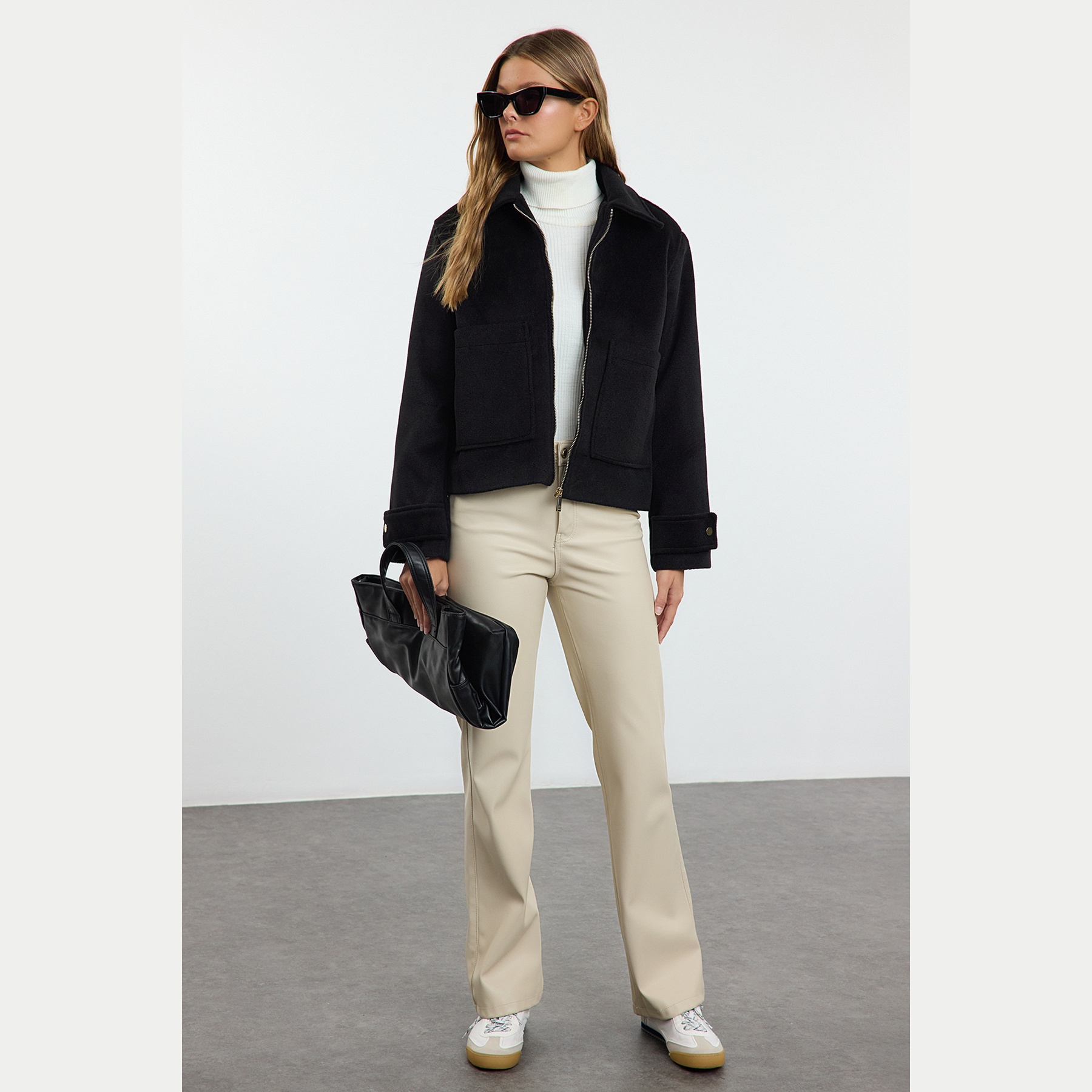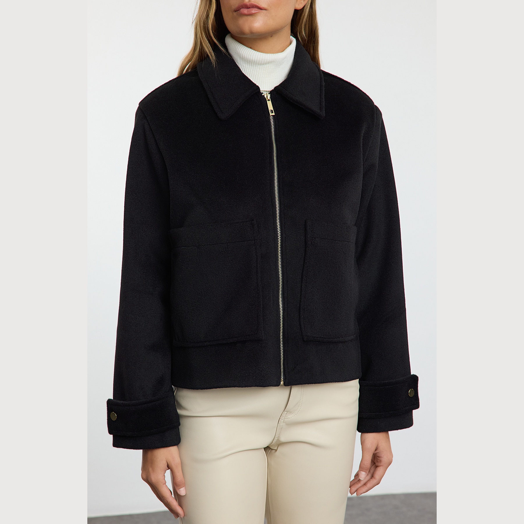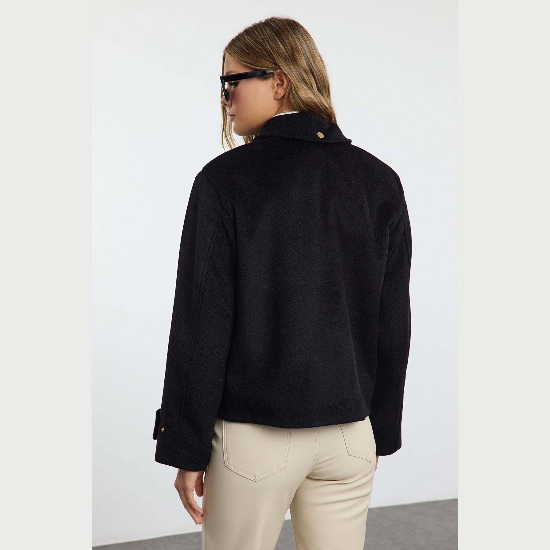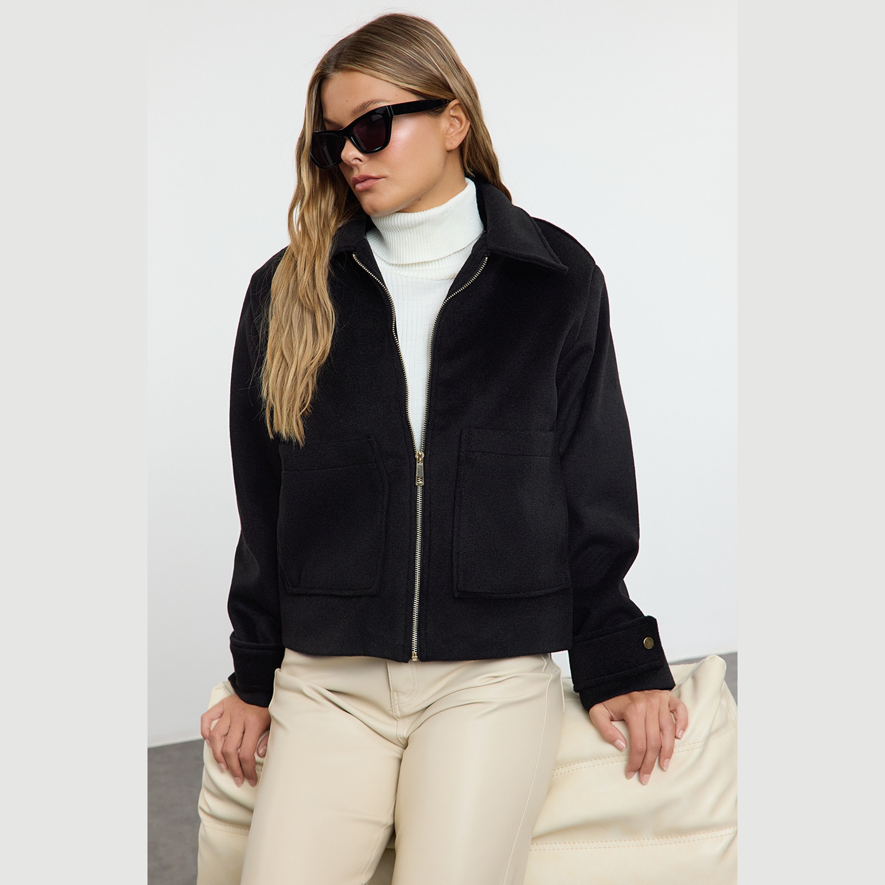 جاكيت أنيق بلون أسود كلاسيكي من مجموعة Trendyolmilla – لأناقة يومية بلمسة عملية خفيفة، يتميز بقصة Oversize واسعة بطول منتظم، مع ياقة قميص كلاسيكية، وأكمام طويلة، وإغلاق أمامي بسحاب، مصنوع من خامة كاشمير خفيف (Kaşe Dokuma) بتركيبة 100% بوليستر، ومبطن بالكامل، ما يجعله مثاليًا لأيام الربيع والخريف أو الأجواء المعتدلة.
