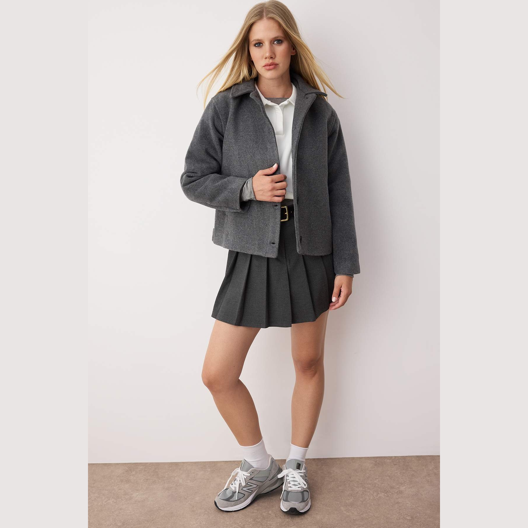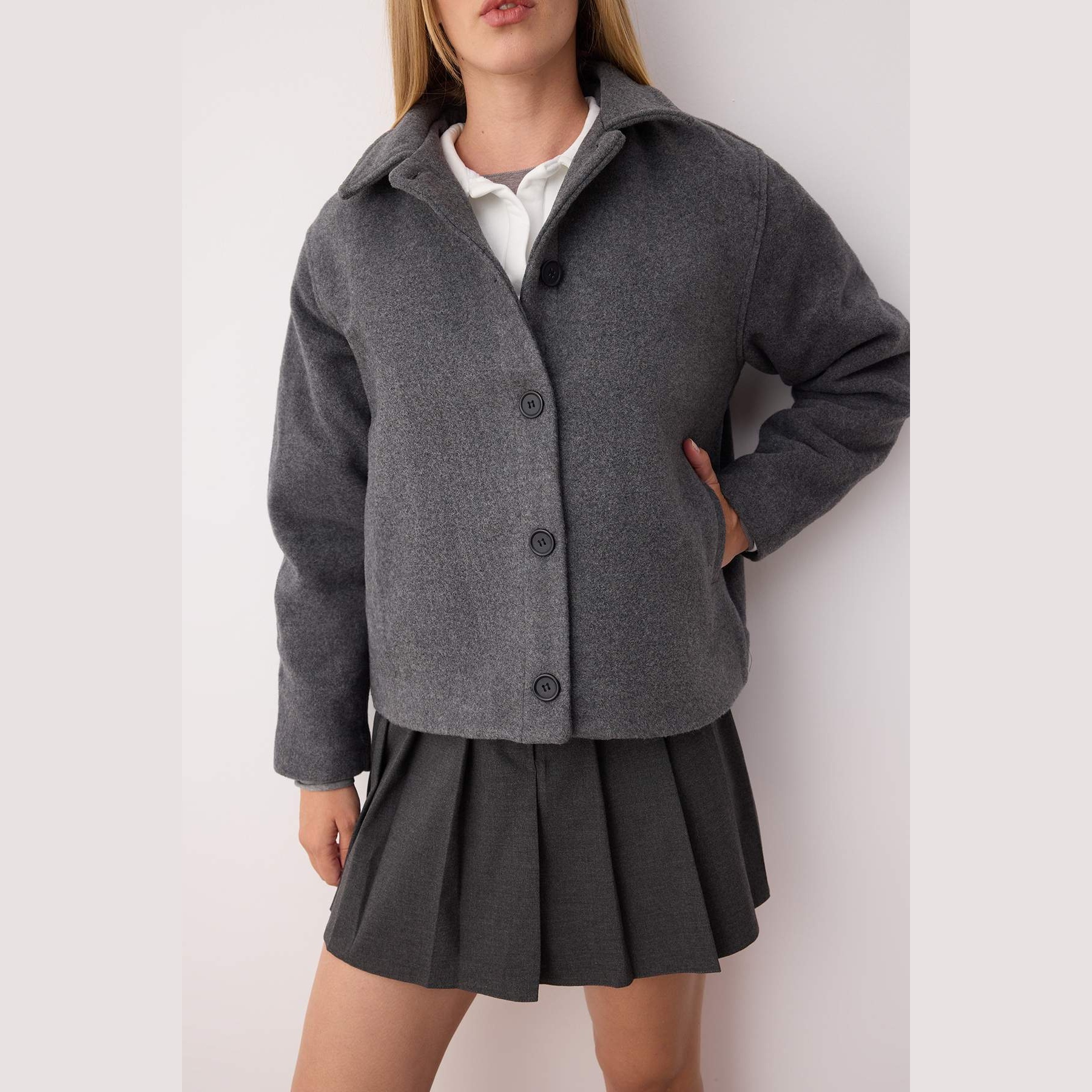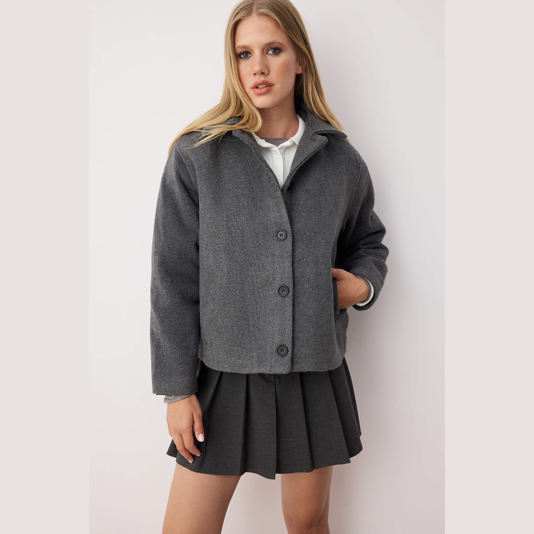 جاكيت أنيق بلون رمادي داكن (أنْتراسيت) من مجموعة Trendyolmilla – لأناقة يومية بلمسة خفيفة وعملية، يتميز بقصة منتظمة (Regular Fit) بطول عملي، مع ياقة مستقيمة، وأكمام طويلة، وإغلاق أمامي مفرد، مصنوع من خامة قماش كاشمير خفيف بتركيبة متعددة تشمل 69% أكريليك، 13% بوليستر، 12% صوف، 2% قطن، 2% فيسكوز، 2% بولياميد، ومبطن بالكامل، ما يجعله مثاليًا لأيام الربيع والخريف أو الأجواء المعتدلة.