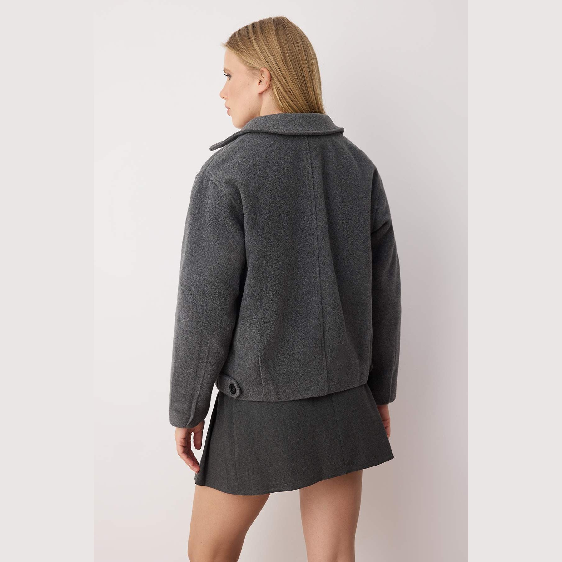 جاكيت نسائي – رمادي داكن بقصة منتظمة وخامة خفيفة (تصميم عملي لموسم الانتقال)