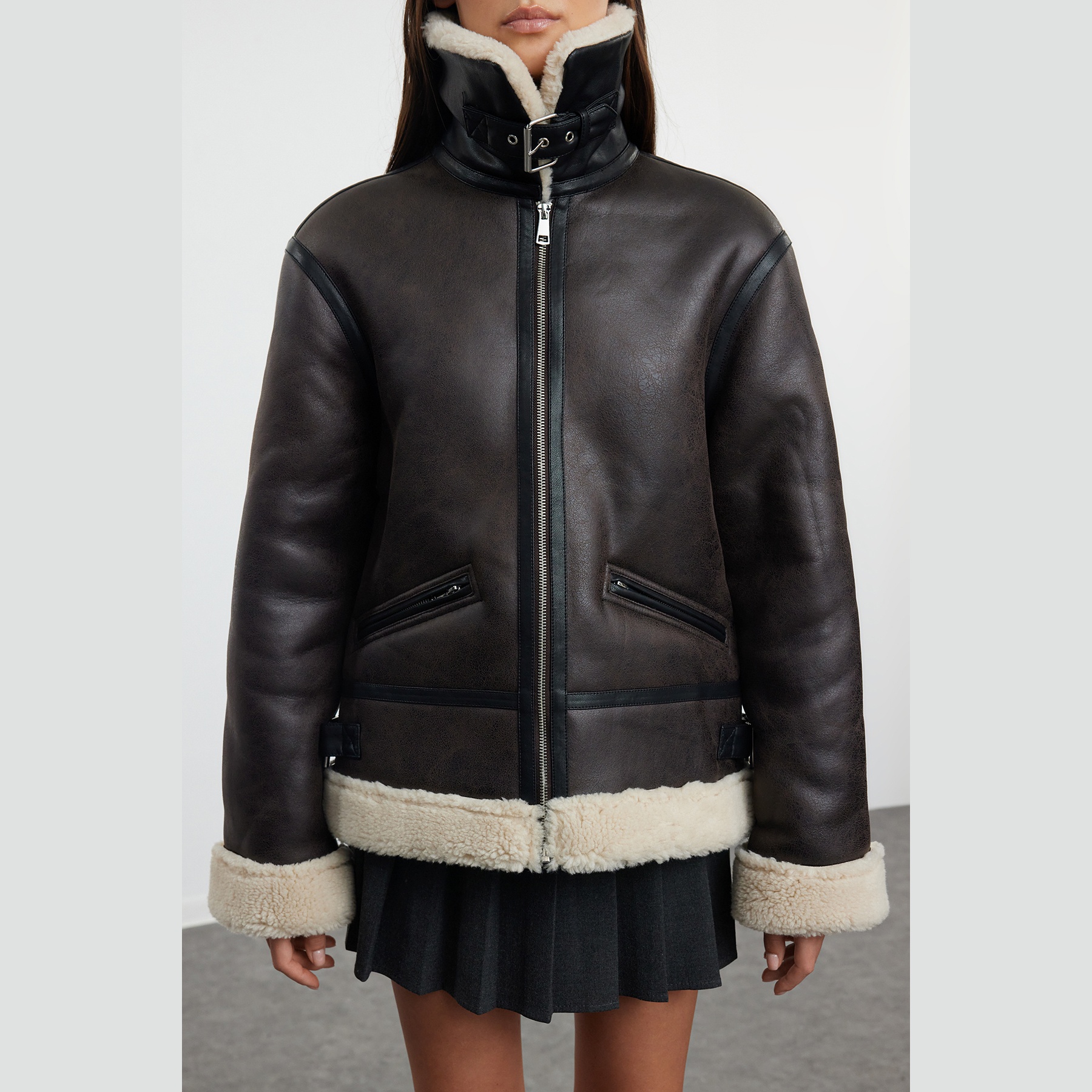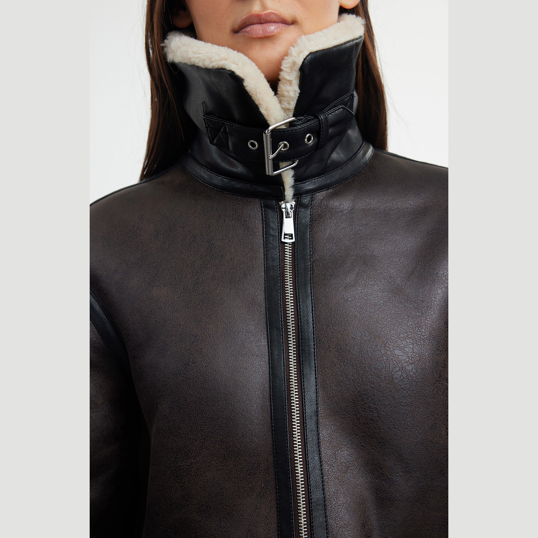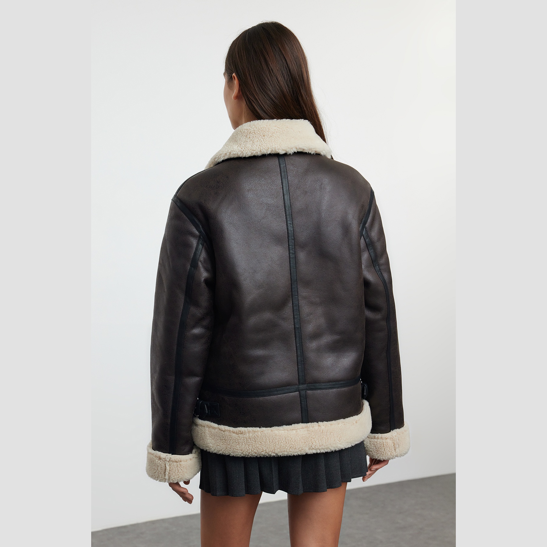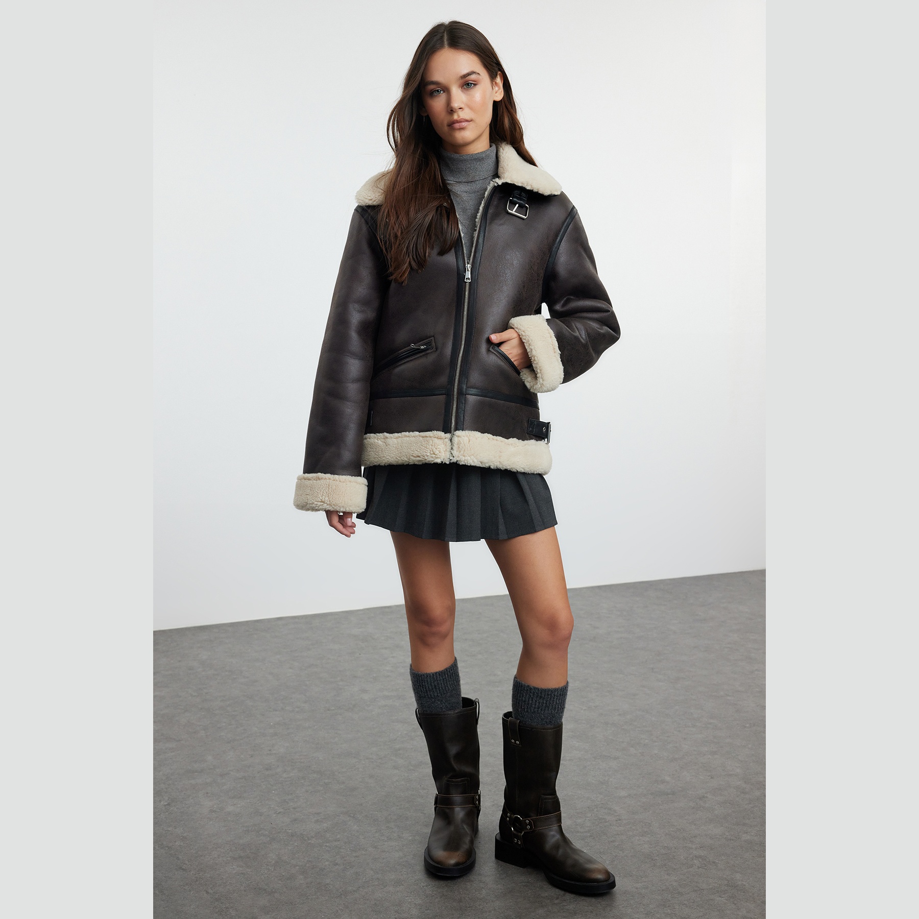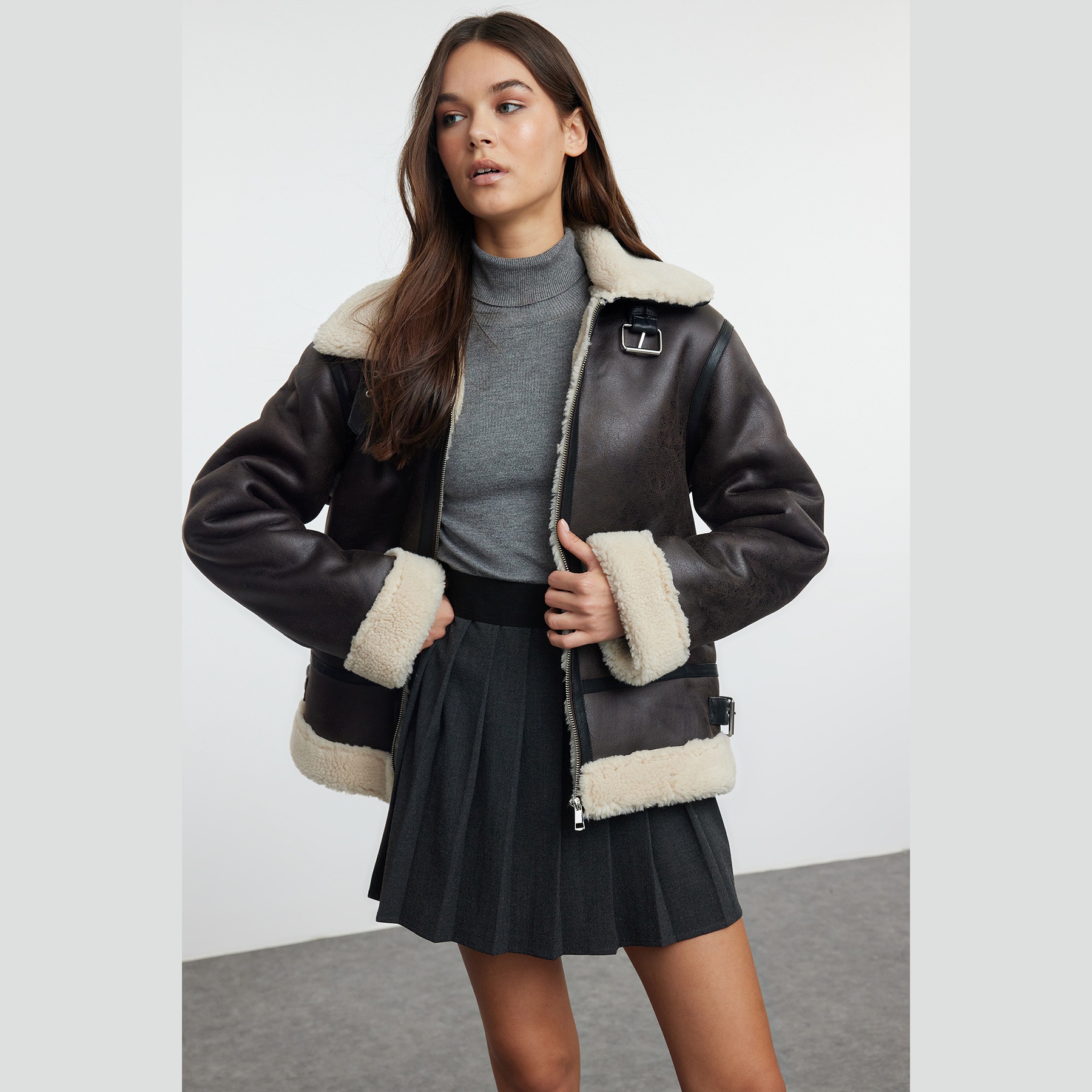 جاكيت شتوي بلون بني داكن من مجموعة Trendyolmilla – تصميم بستايل Biker يجمع بين الأناقة والدفء، يتميز بقصة منتظمة (Regular Fit) بطول عملي، مع ياقة قميص كلاسيكية مزيّنة بحزام معدني، وأكمام طويلة، وإغلاق أمامي بسحاب، مصنوع من خامة جلد صناعي مبطّن بتركيبة 100% بوليستر، ويأتي مزوّدًا بتفاصيل بيلوش ناعم على الياقة والبطانة تضيف لمسة فاخرة ودفئًا مثاليًا لأيام الشتاء الباردة.