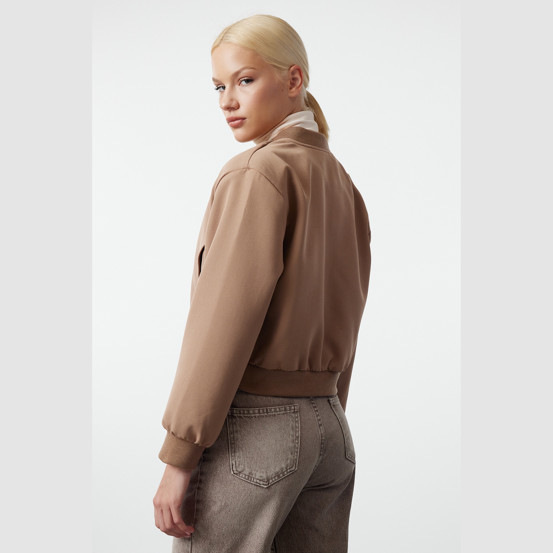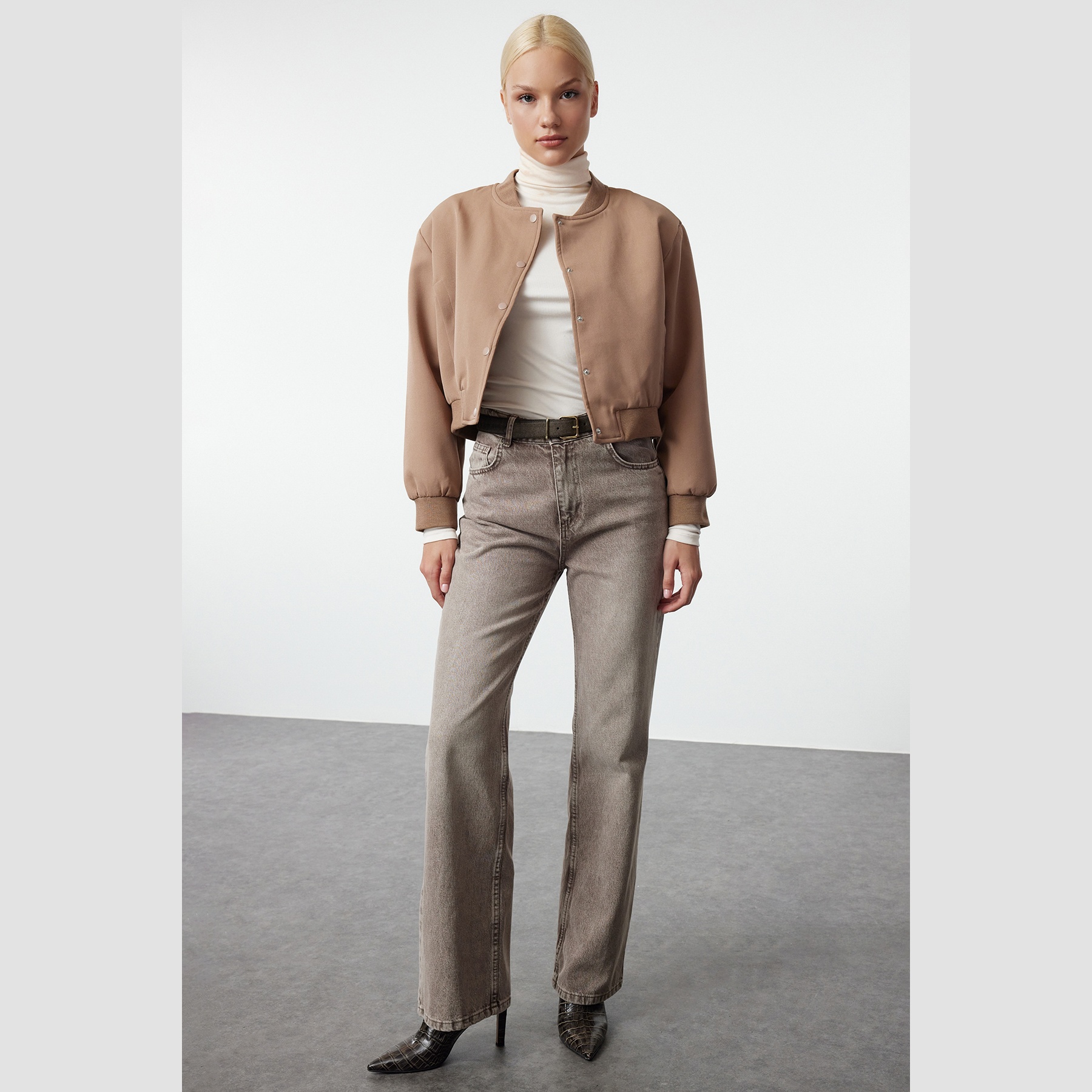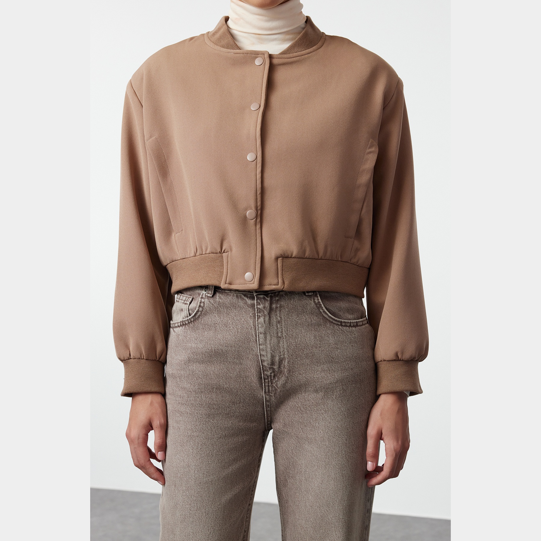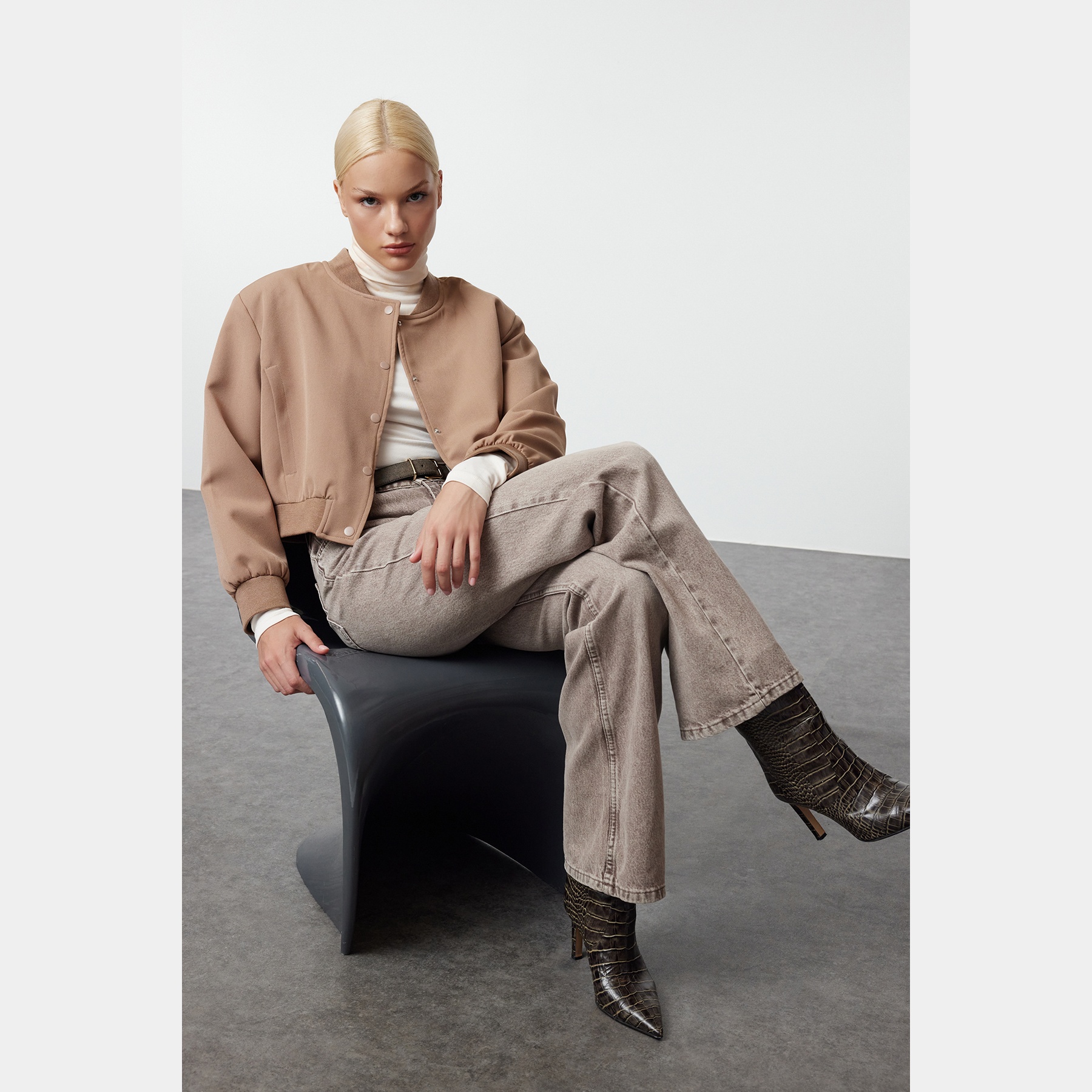 جاكيت عملي بلون فِيزُون هادئ من مجموعة Trendyolmilla – تصميم عصري بستايل بومبر بقصة قصيرة ومريحة، يتميز بقصة واسعة (Oversize) بطول Crop، مع ياقة مستقيمة (حكيم)، وأكمام طويلة، وإغلاق أمامي بكبسات، مصنوع من خامة منسوجة خفيفة بتركيبة 95% بوليستر، 5% إيلاستان، ومبطن بالكامل، ما يجعله مثاليًا لأيام الربيع والخريف.