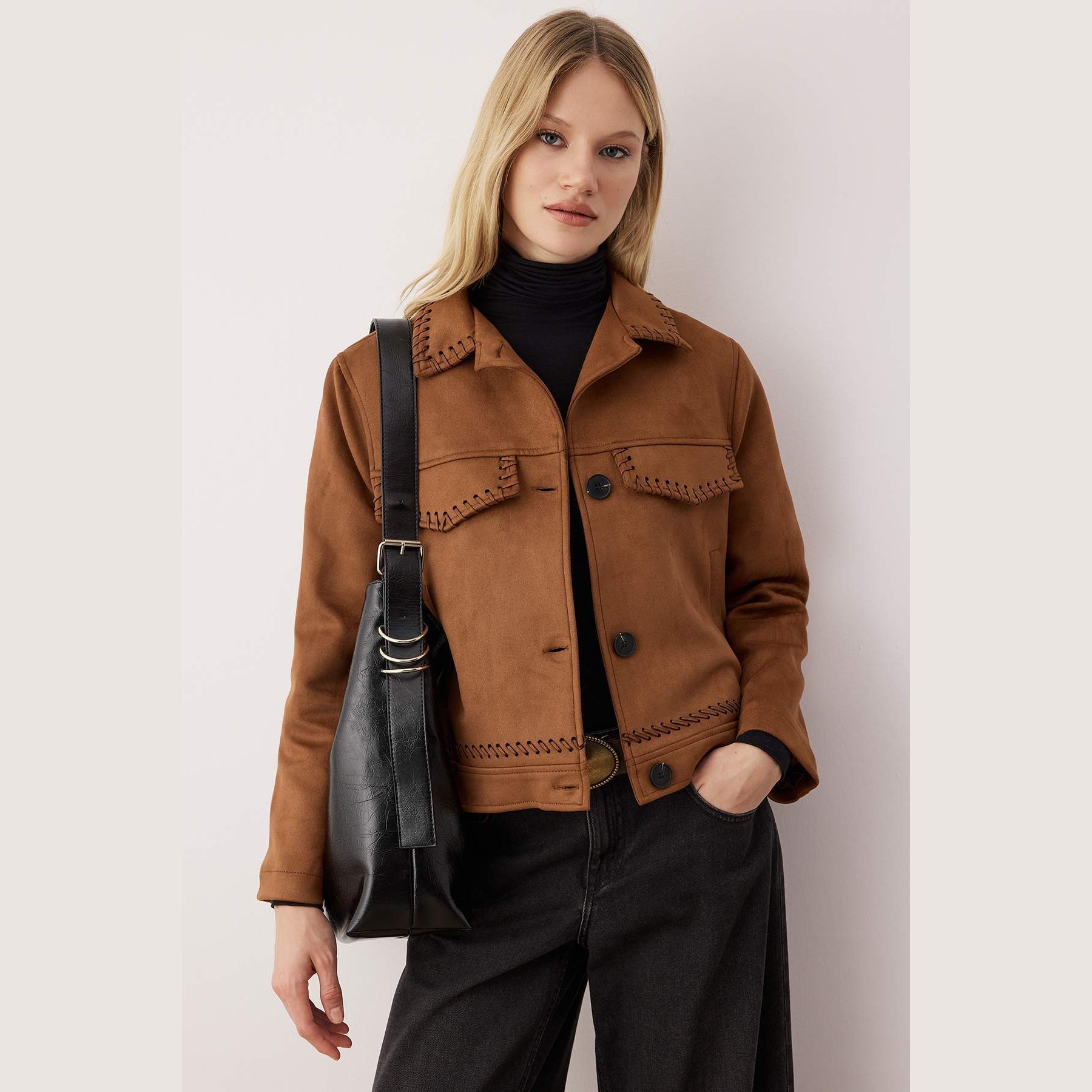 جاكيت أنيق بلون بني دافئ من مجموعة Trendyolmilla – تصميم عملي بلمسة شمواه ناعمة وتفاصيل ربط أنثوية، يتميز بقصة منتظمة (Regular Fit) بطول عملي، مع ياقة قميص كلاسيكية، وأكمام طويلة، وإغلاق أمامي بكبسات، مصنوع من خامة شمواه صناعي منسوج بتركيبة 100% بوليستر، ومبطن بالكامل، ما يجعله مثاليًا لأيام الربيع والخريف أو الأجواء المعتدلة.