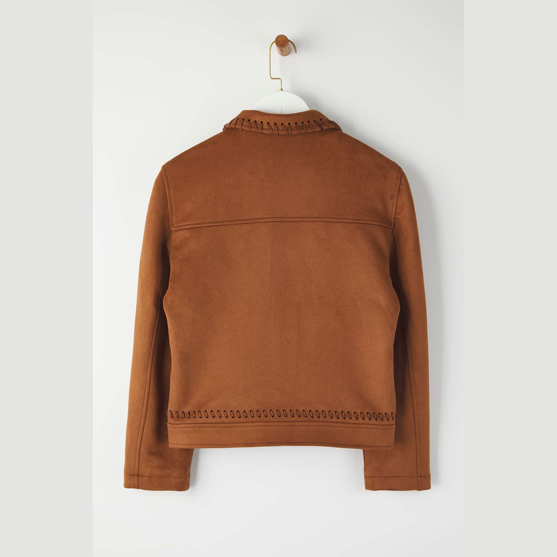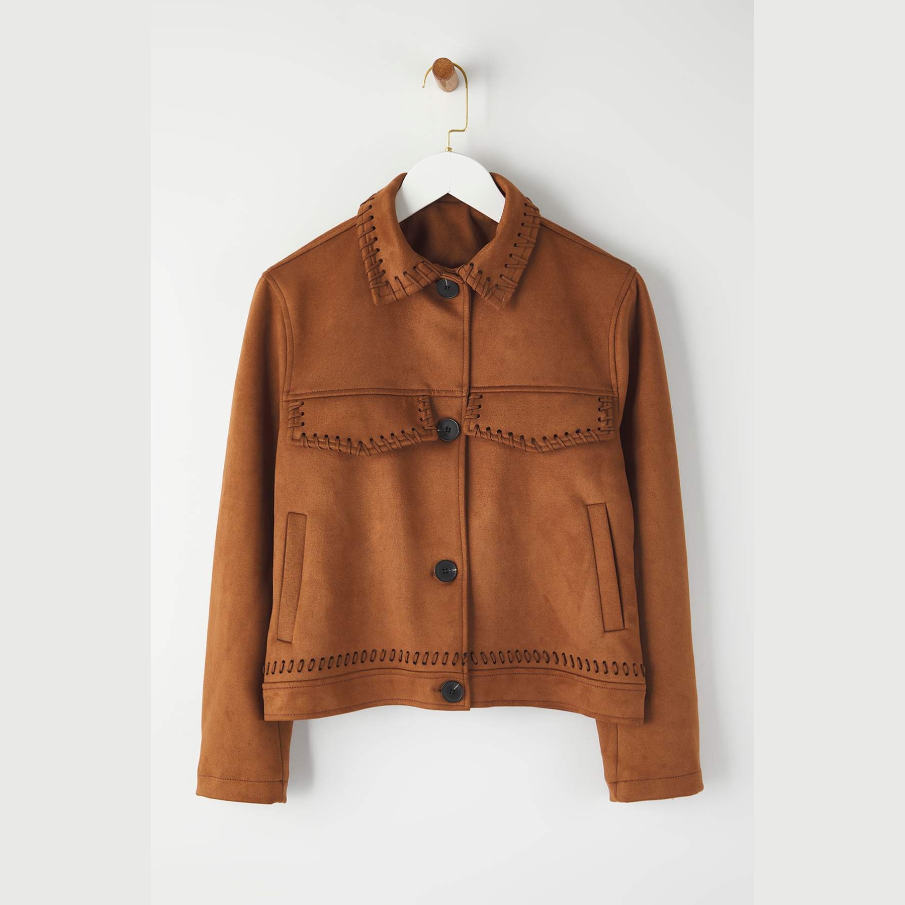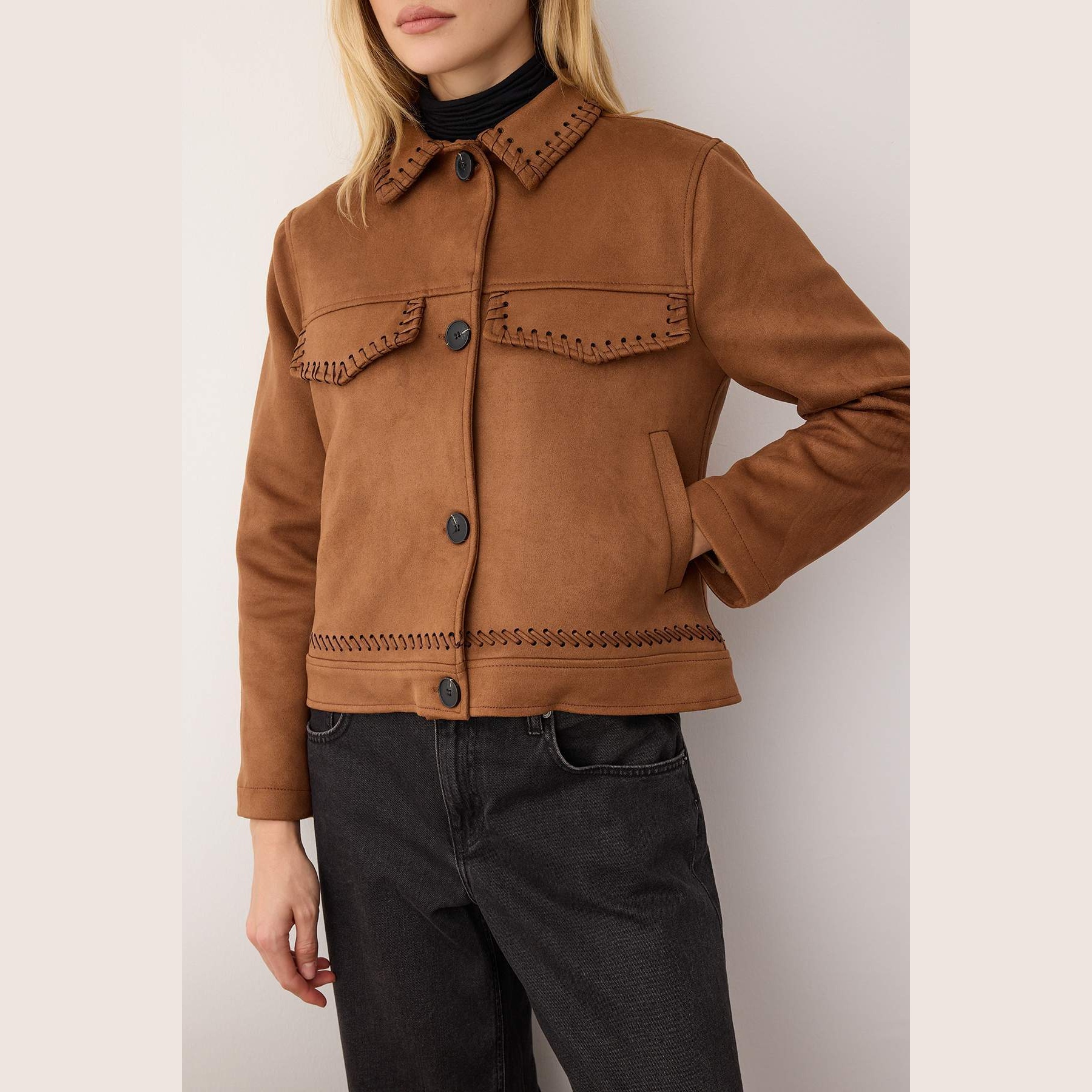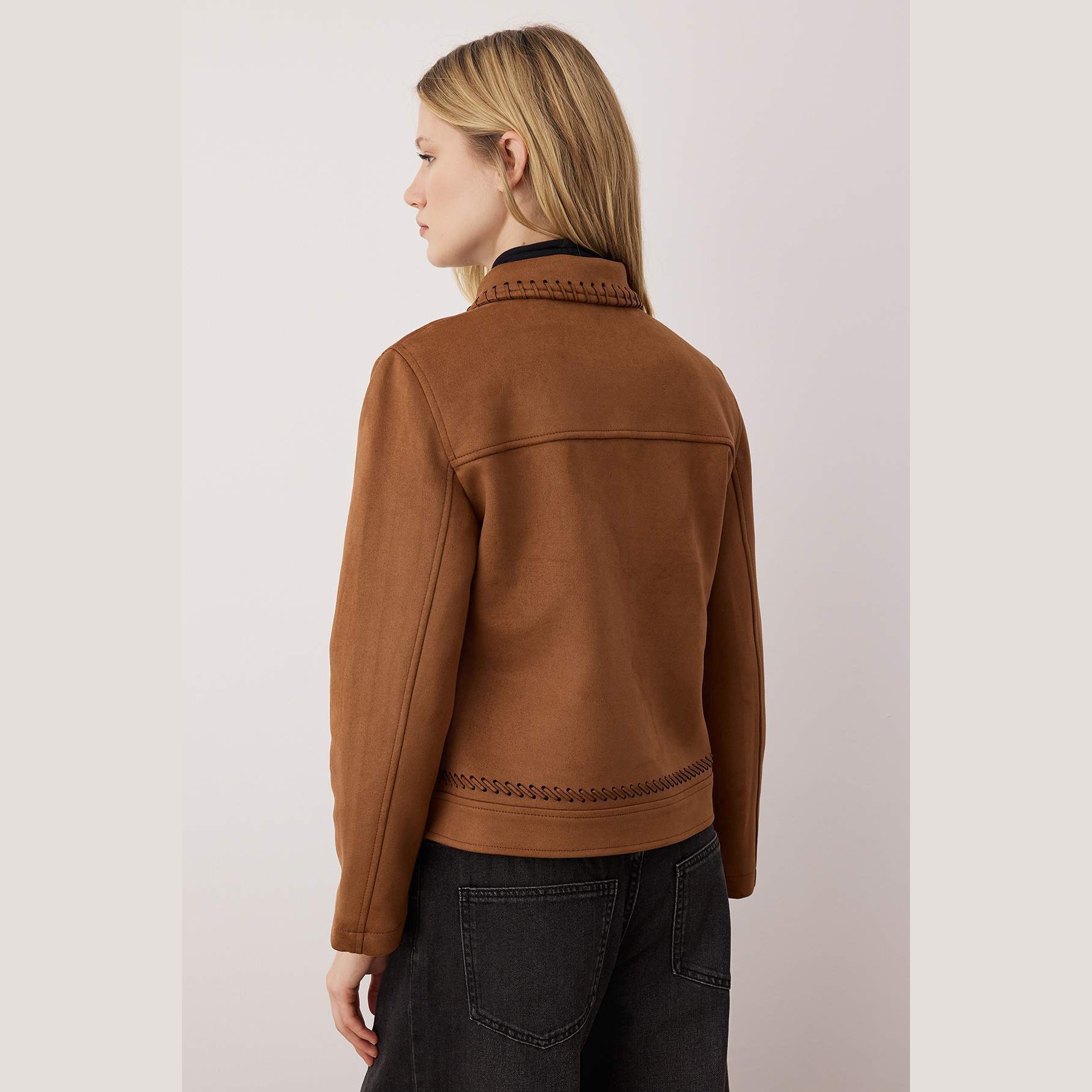 جاكيت نسائي – بني بقصة منتظمة وتفاصيل ربط من الشمواه (تصميم موسمي ناعم)
