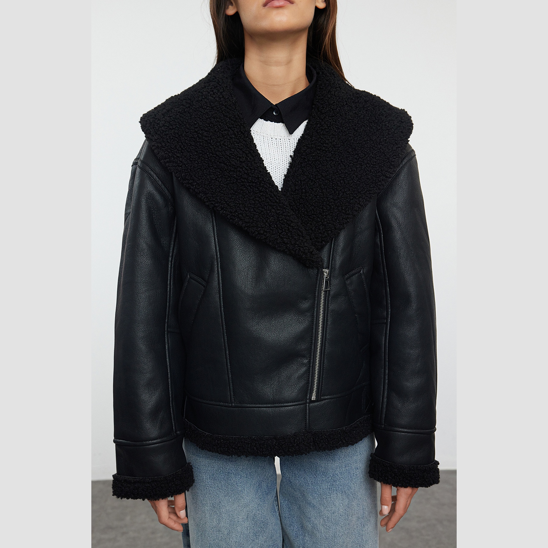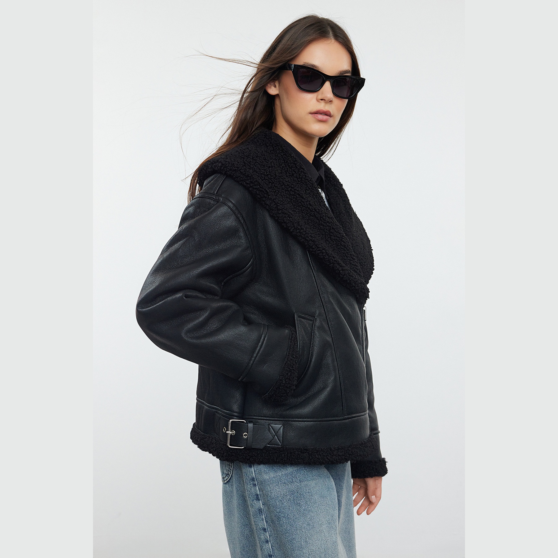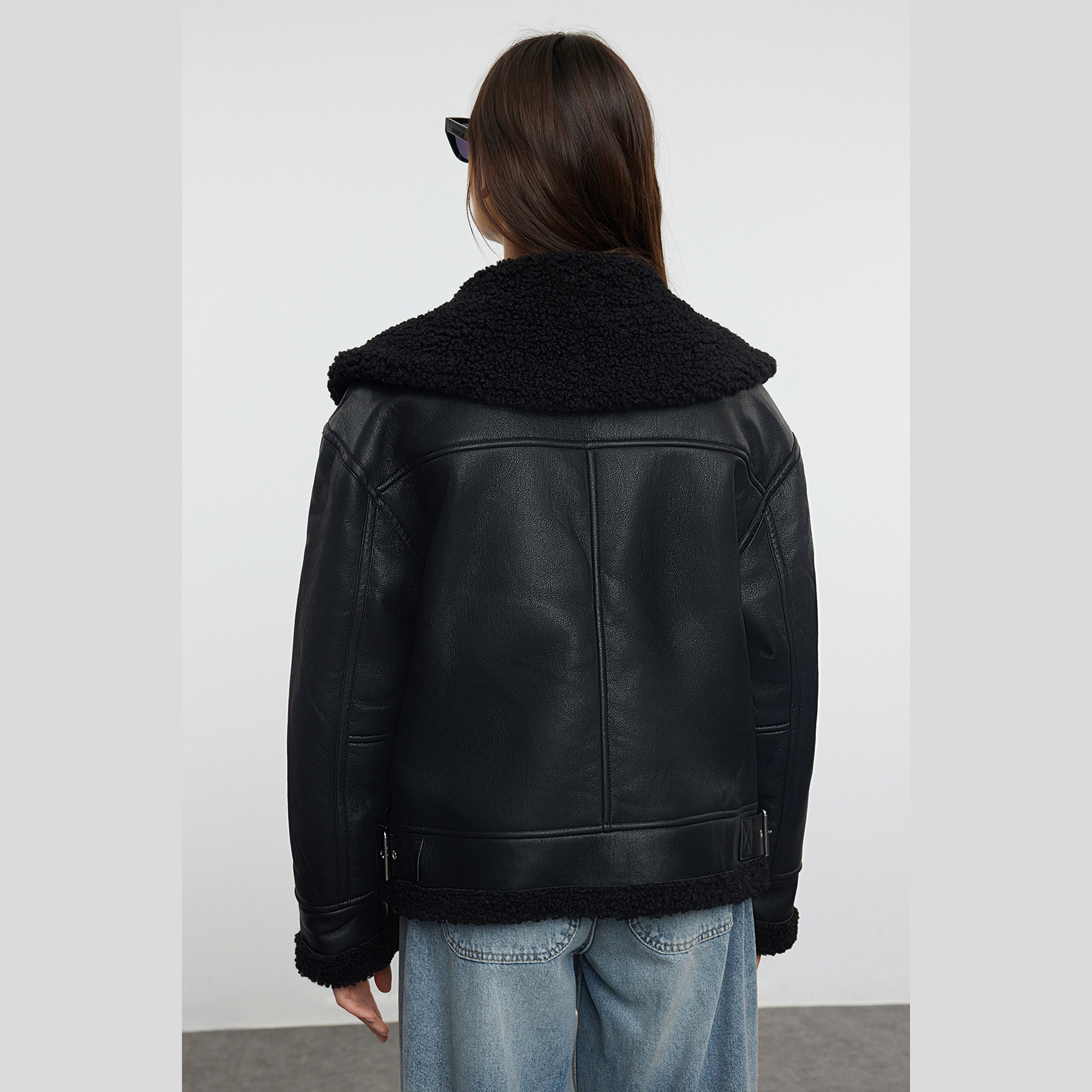 جاكيت نسائي – أسود بقصة منتظمة وتفاصيل بيلوش من الجلد الصناعي (تصميم عصري دافئ)