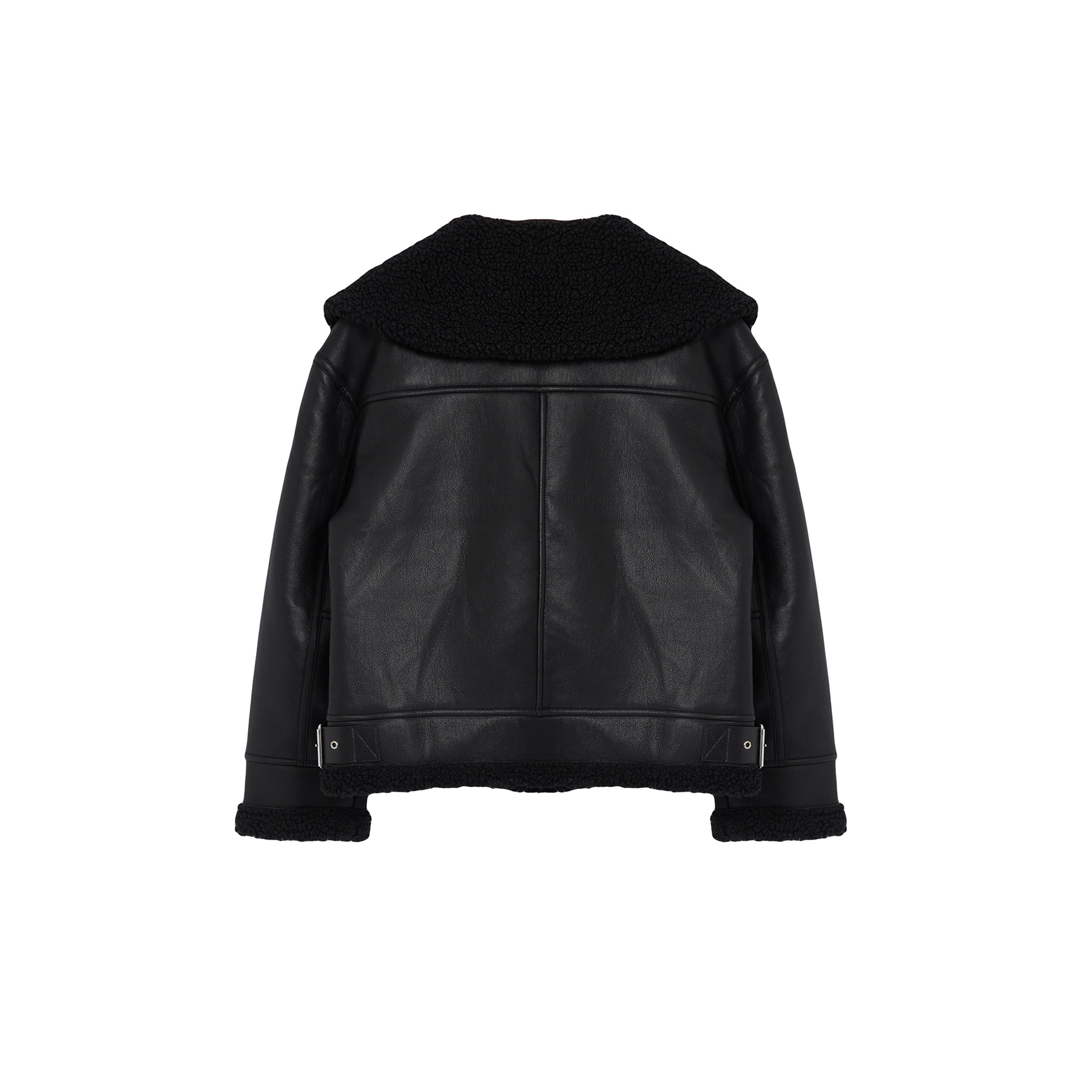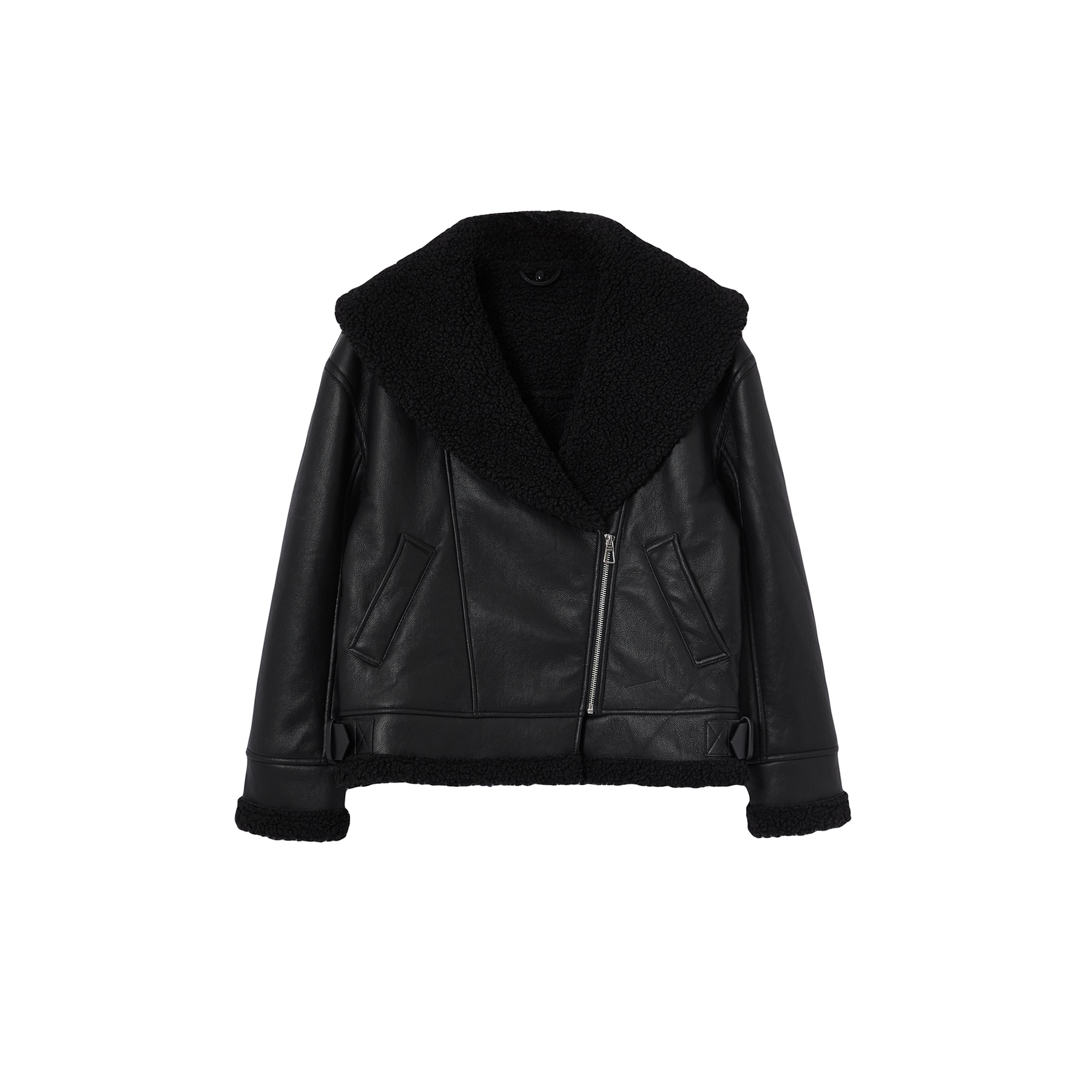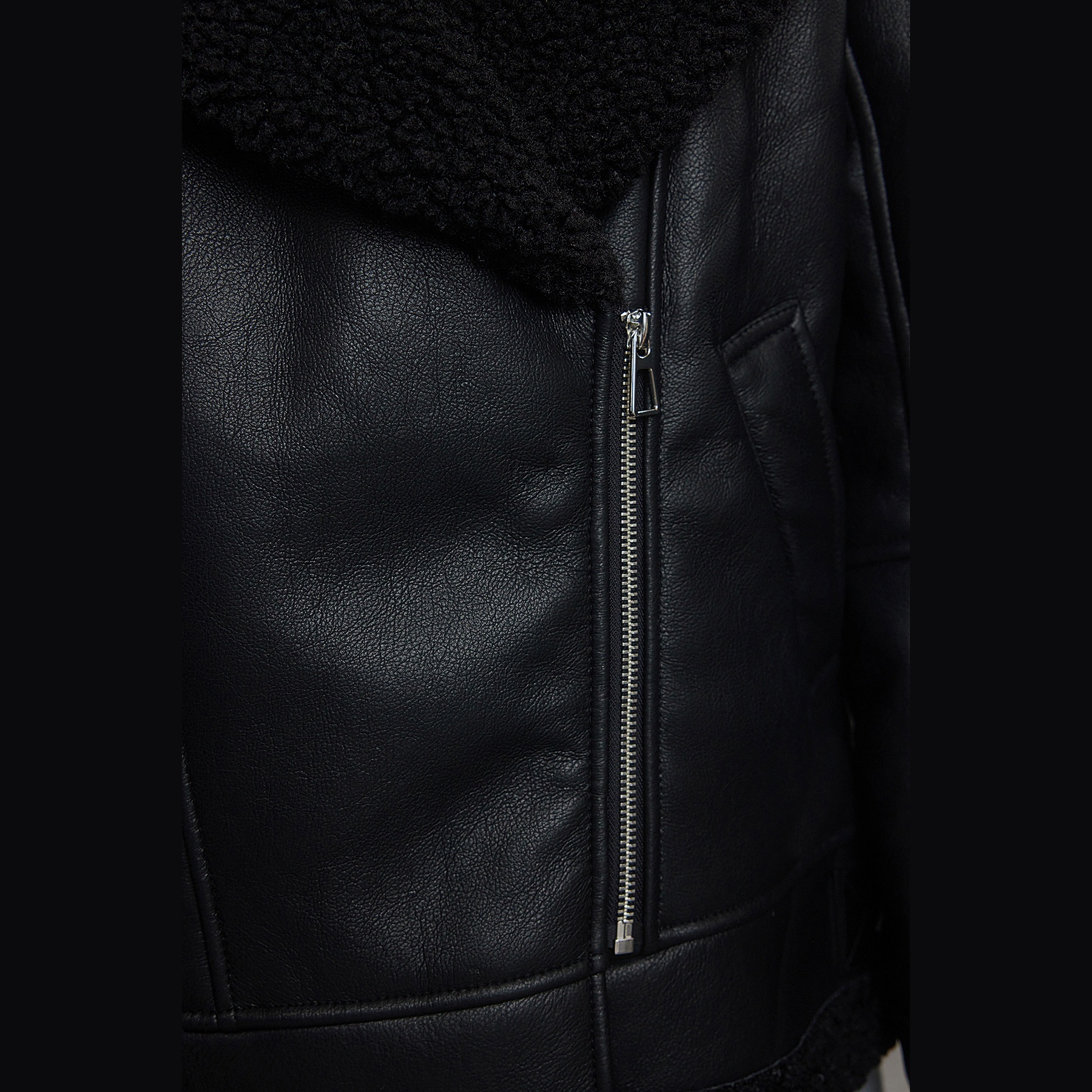 جاكيت نسائي – أسود بقصة منتظمة وتفاصيل بيلوش من الجلد الصناعي (تصميم عصري دافئ)
