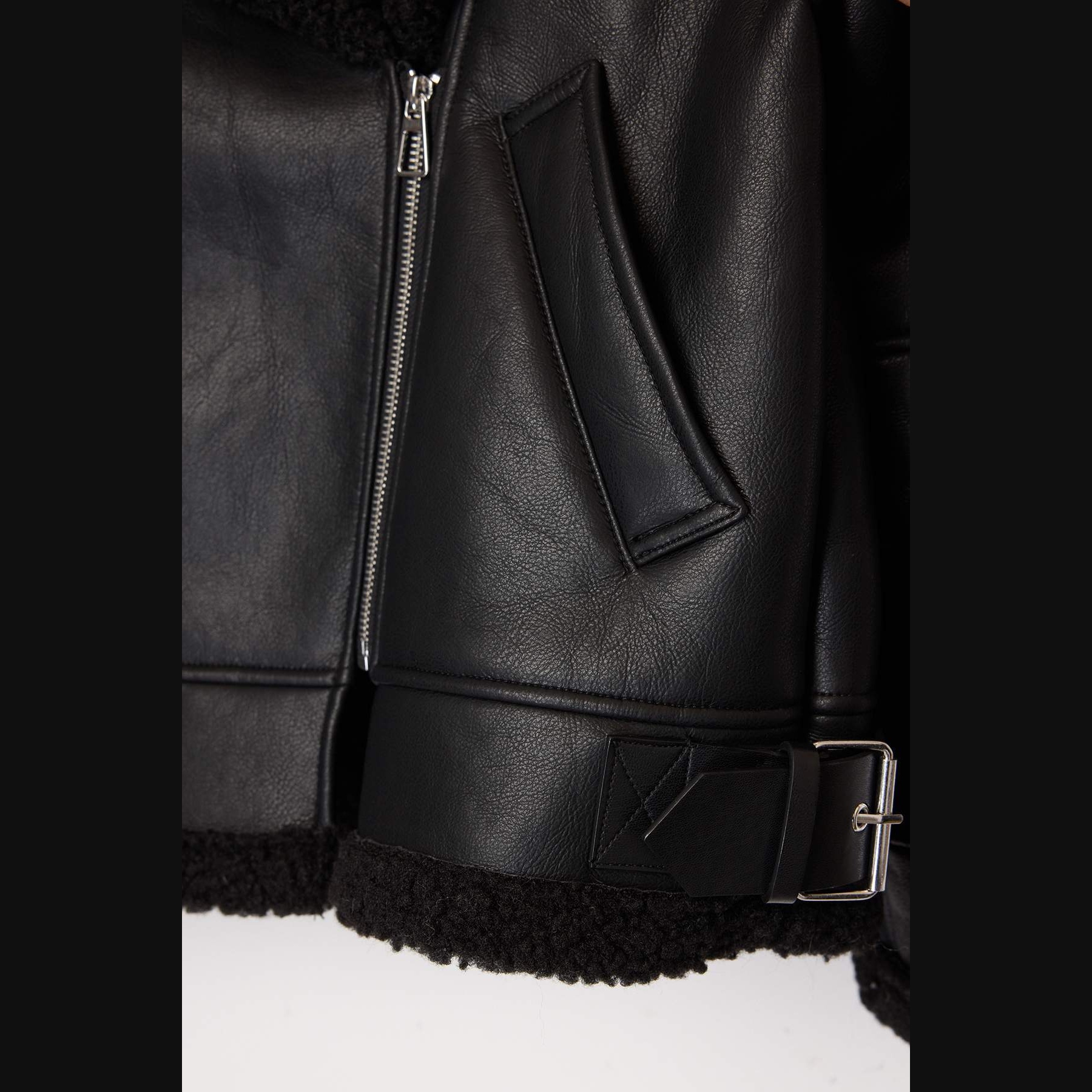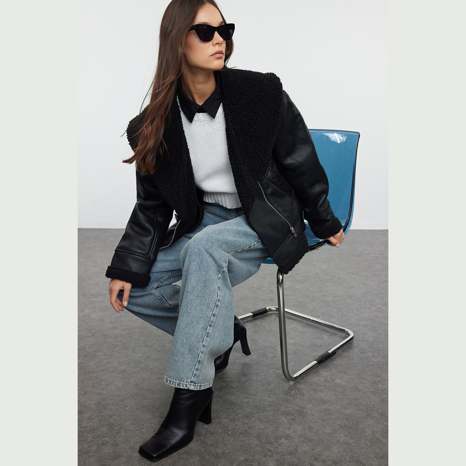 جاكيت شتوي بلون أسود كلاسيكي من مجموعة Trendyolmilla – تصميم بستايل Biker يجمع بين الأناقة والدفء، يتميز بقصة منتظمة (Regular Fit) بطول عملي، مع ياقة قميص كلاسيكية مزيّنة ببيلوش ناعم، وأكمام طويلة، وإغلاق أمامي بسحاب، مصنوع من خامة جلد صناعي مبطّن بتركيبة 100% بوليستر، ومبطن بالكامل، ما يجعله مثاليًا لأيام الشتاء الباردة.