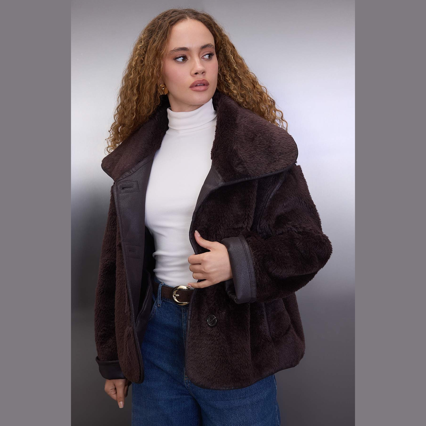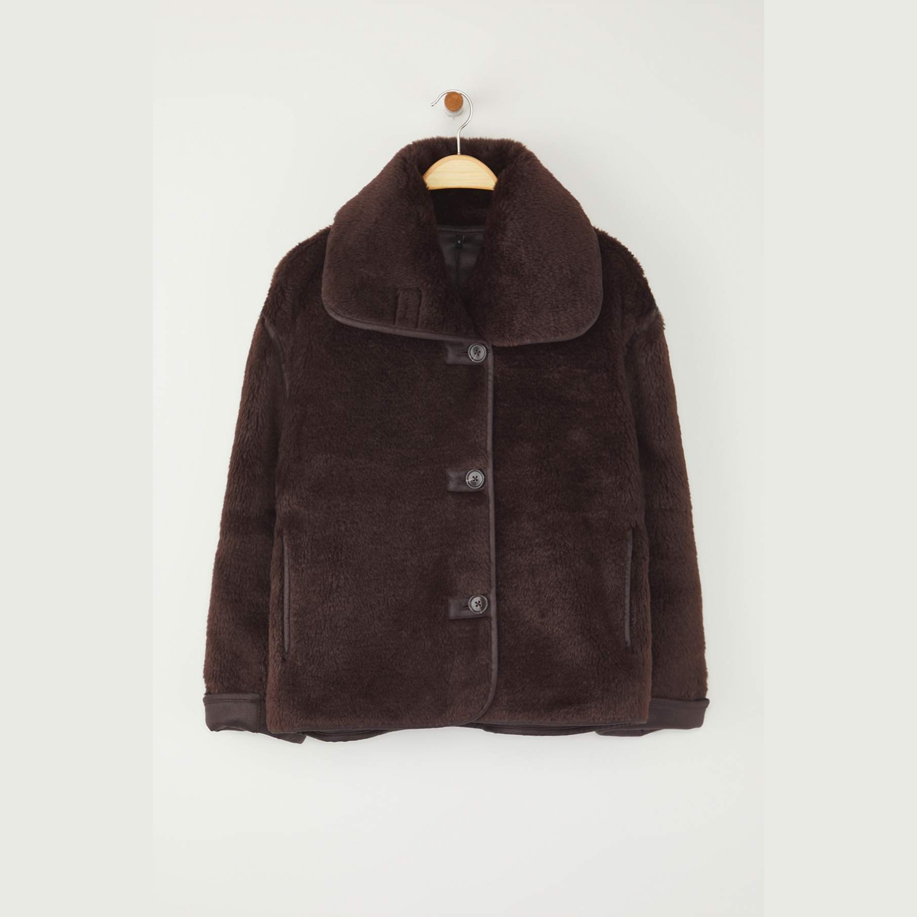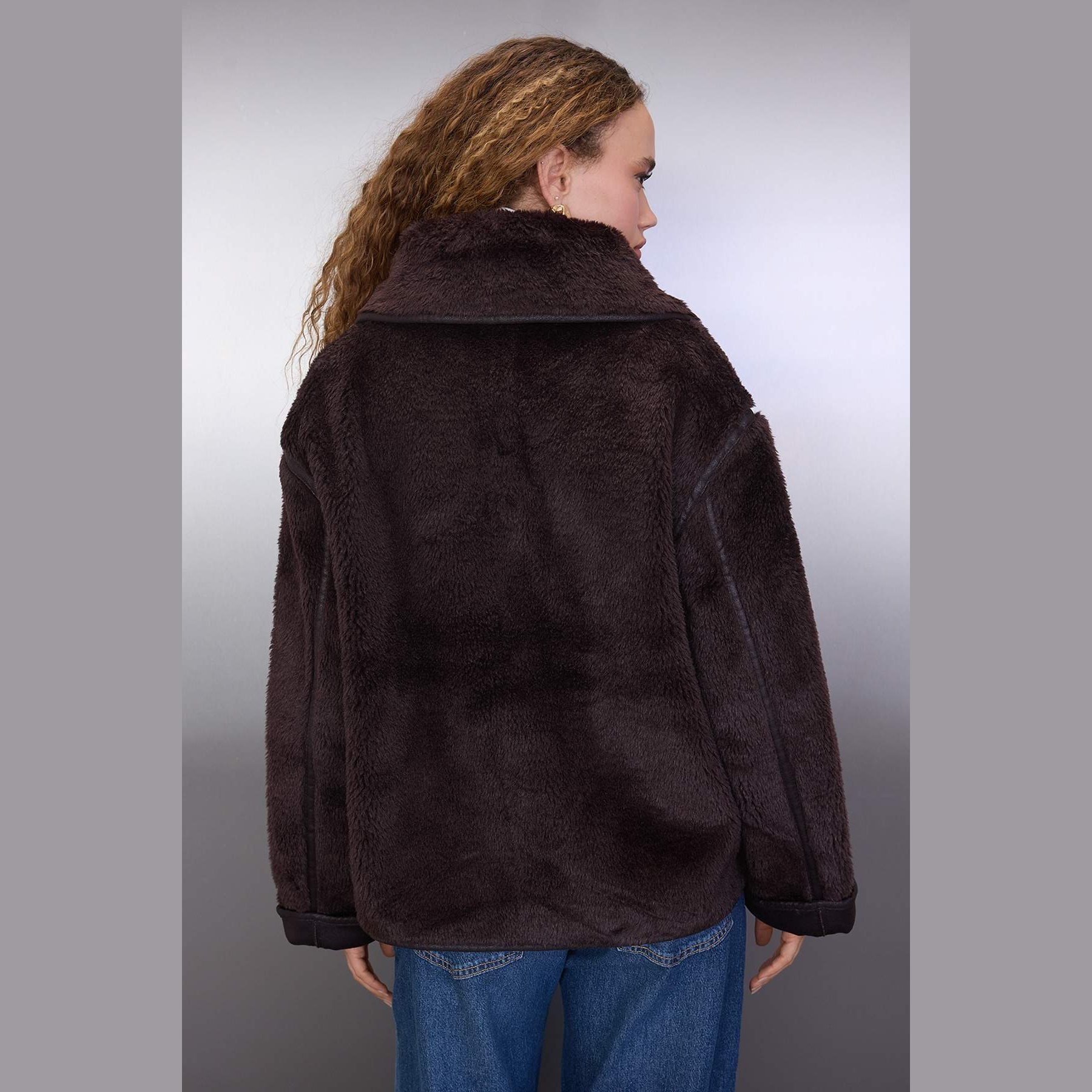جاكيت نسائي – بني بقصة واسعة وخامة بيلوش ناعمة (تصميم يومي مثالي للأجواء الباردة)
