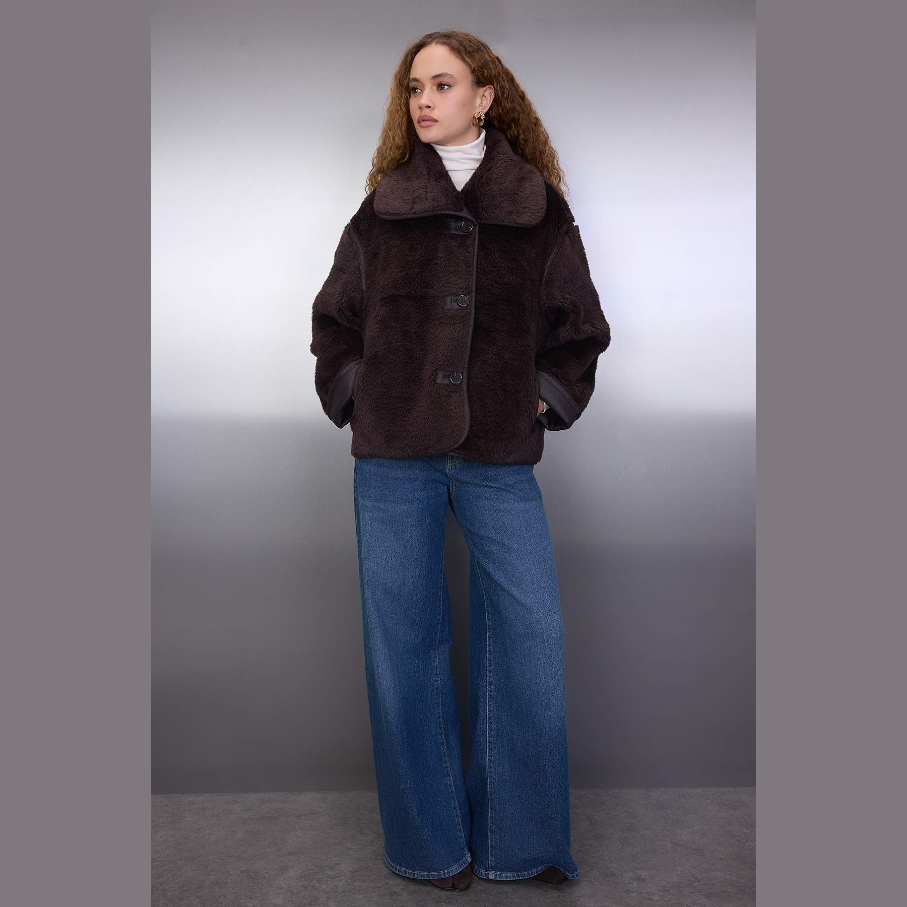 جاكيت شتوي بلون بني دافئ من مجموعة Trendyolmilla – تصميم عملي يجمع بين الراحة والدفء بلمسة ناعمة، يتميز بقصة واسعة (Oversize) بطول منتظم، مع ياقة V مفتوحة، وأكمام طويلة، وإغلاق أمامي بسحاب، مصنوع من خامة بيلوش صناعي منسوج بتركيبة 100% بوليستر، ومبطن بالكامل، ما يجعله مثاليًا لأيام الشتاء الباردة.