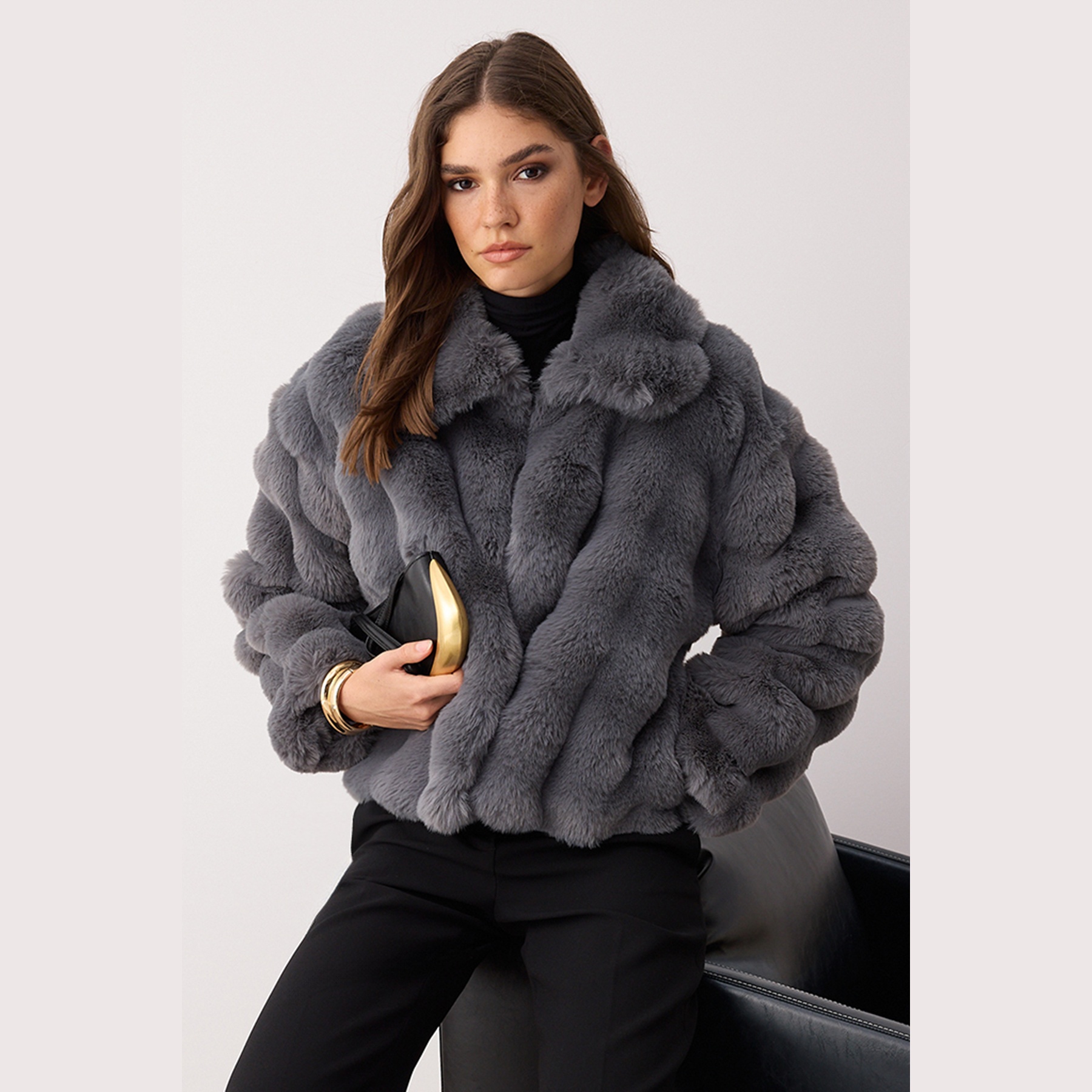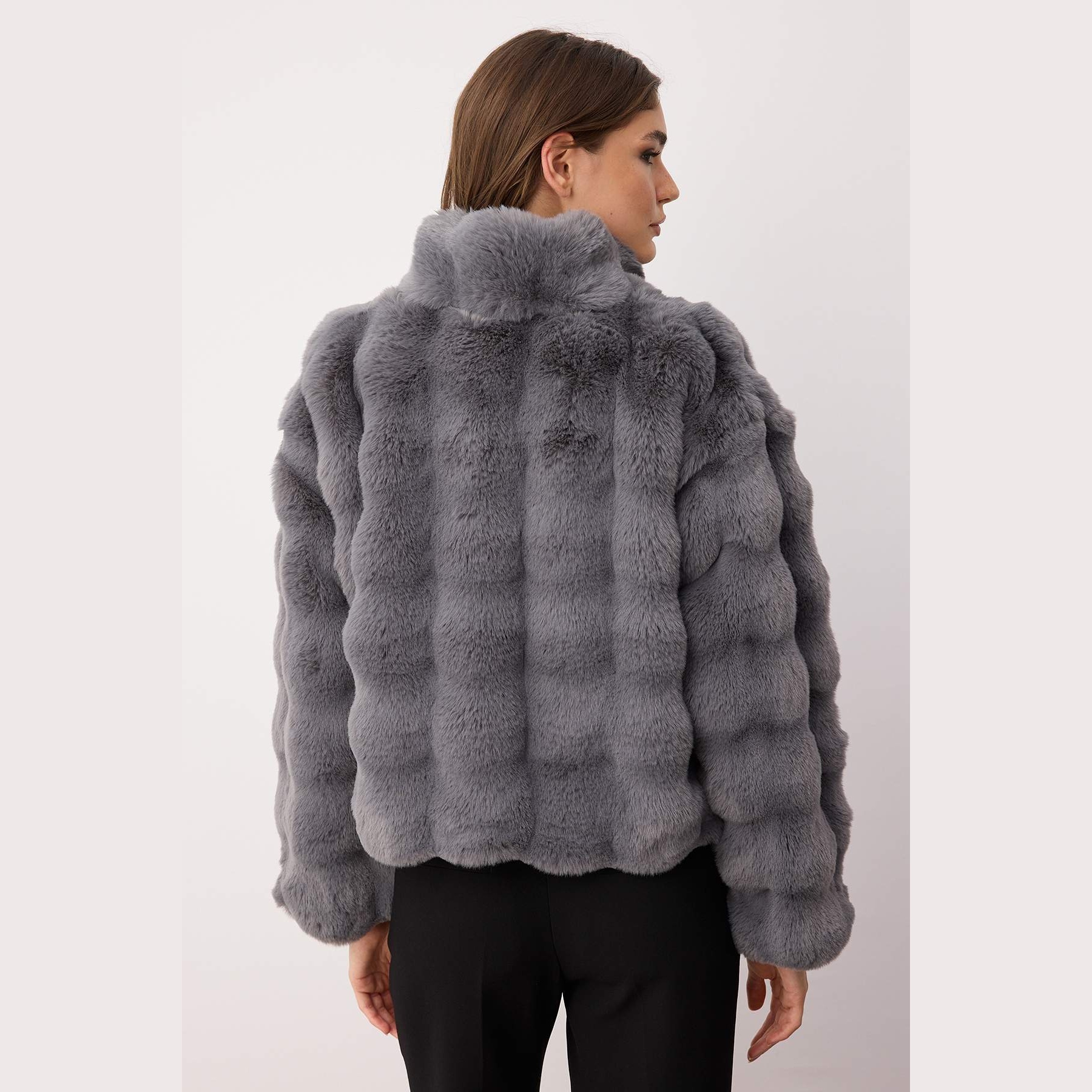 جاكيت نسائي – رمادي بقصة واسعة وخامة فرو صناعي (تصميم يومي مثالي للأجواء الباردة)