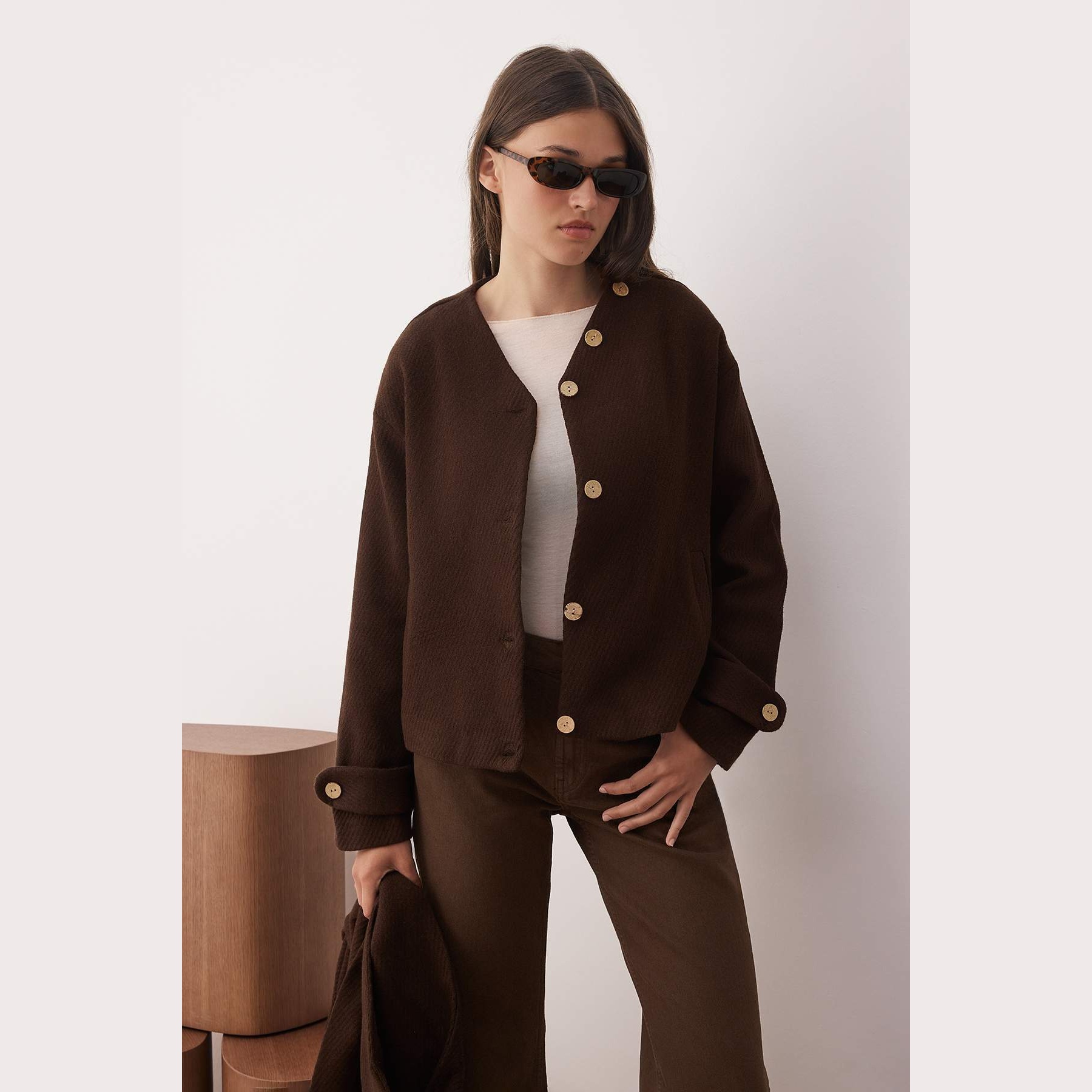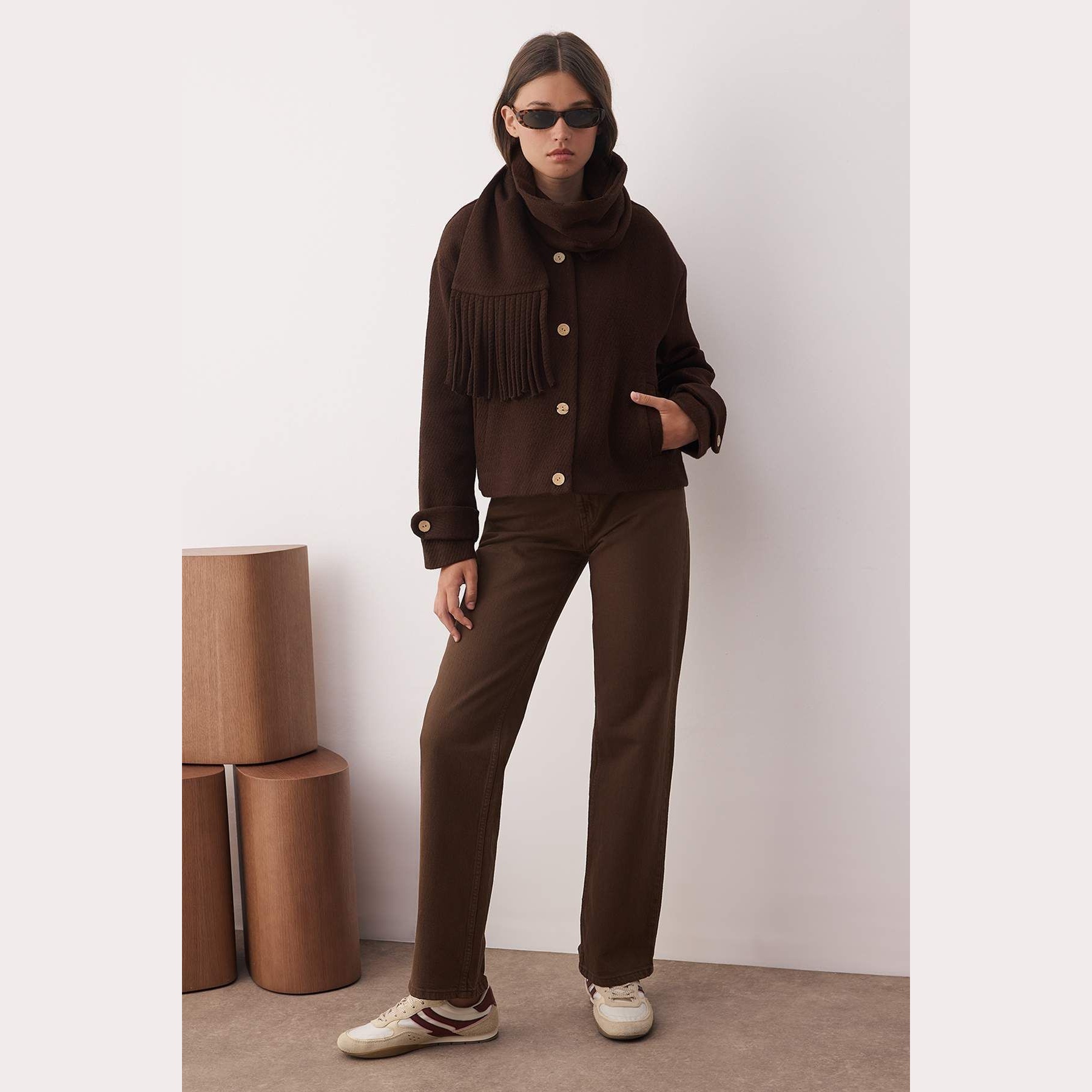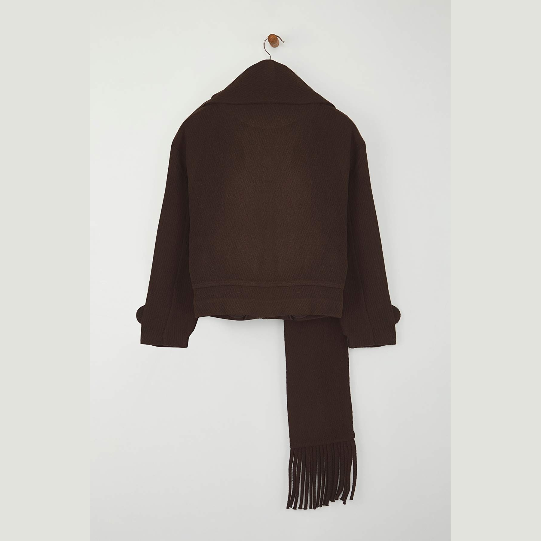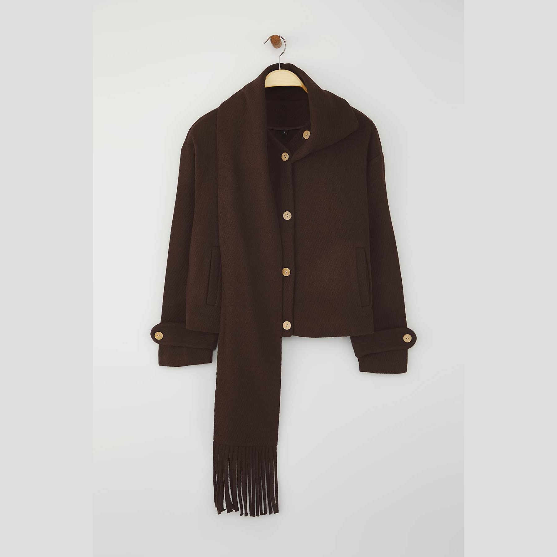جاكيت أنيق بلون بني دافئ من مجموعة Trendyolmilla – تصميم عملي بلمسة كاشمير ناعمة وشال قابل للإزالة يمنحك تنوعًا في الإطلالة، يتميز بقصة واسعة (Oversize Fit) بطول منتظم، مع ياقة مستقيمة (حكيم)، وأكمام طويلة، وإغلاق أمامي بكبسات، مصنوع من خامة منسوجة خفيفة بنمط كاشمير بتركيبة 70% أكريليك، 15% صوف، 15% قطن، غير مبطّن، ما يجعله مثاليًا لأيام الربيع والخريف أو الأجواء المعتدلة.
