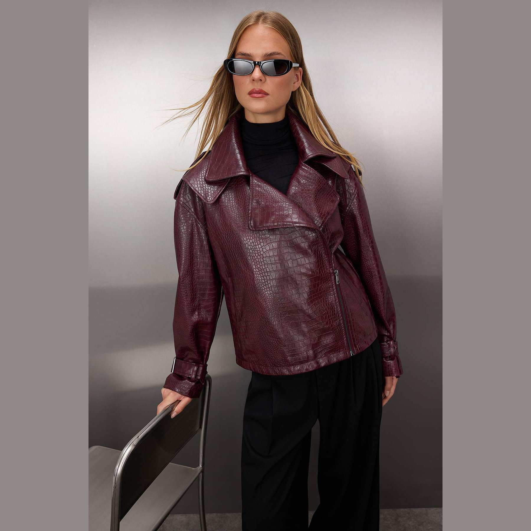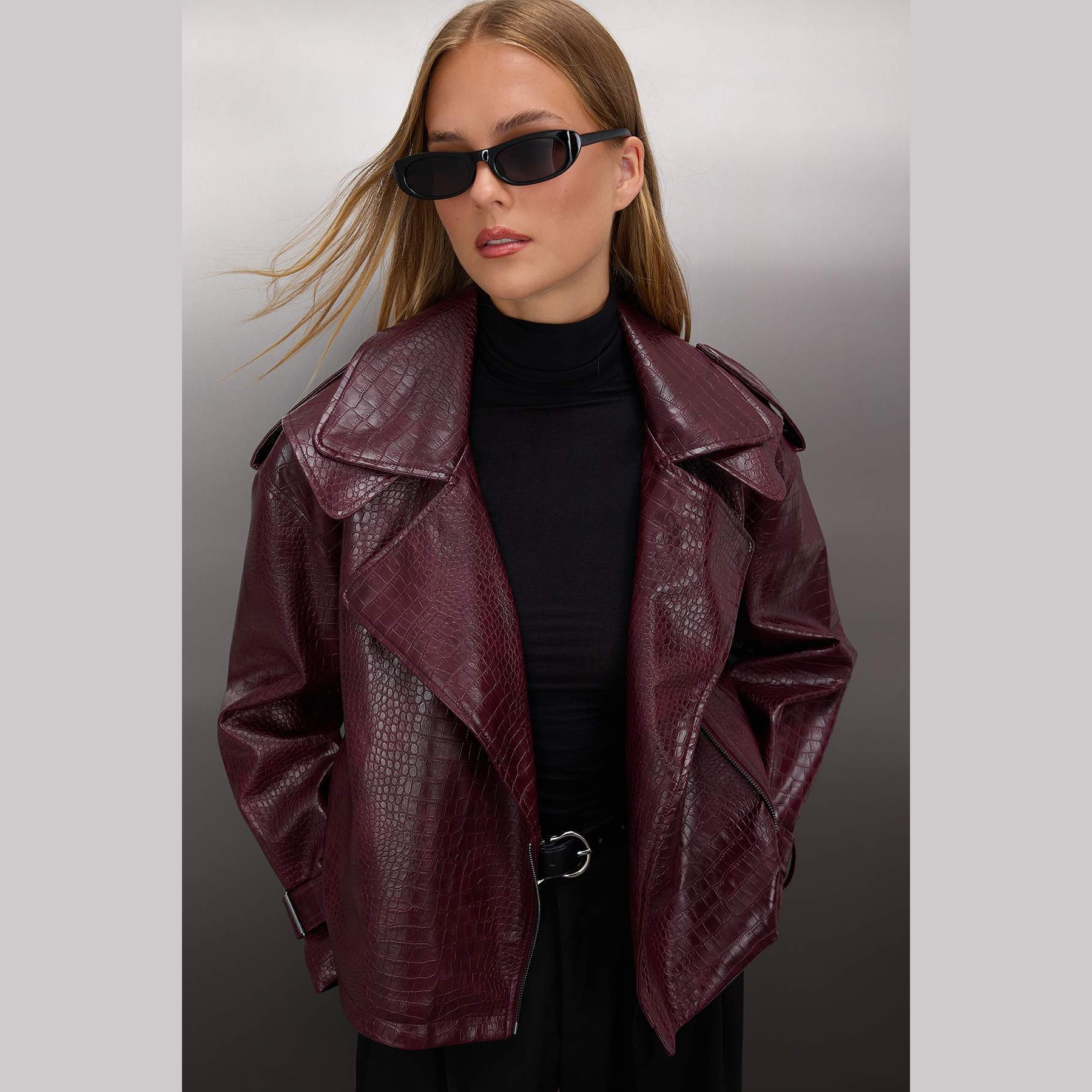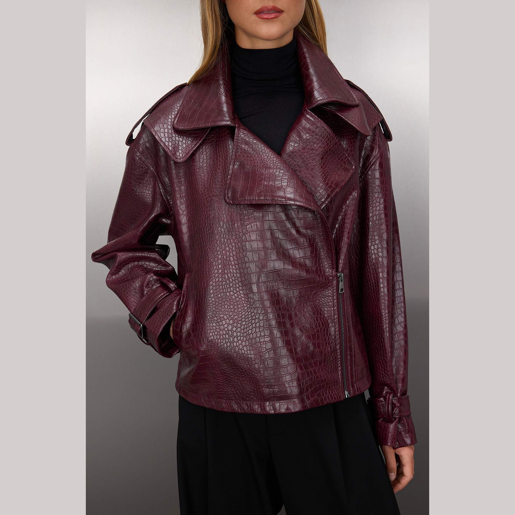 جاكيت نسائي – بوردو بقصة منتظمة من الجلد الصناعي بستايل Biker (تصميم عصري خفيف)