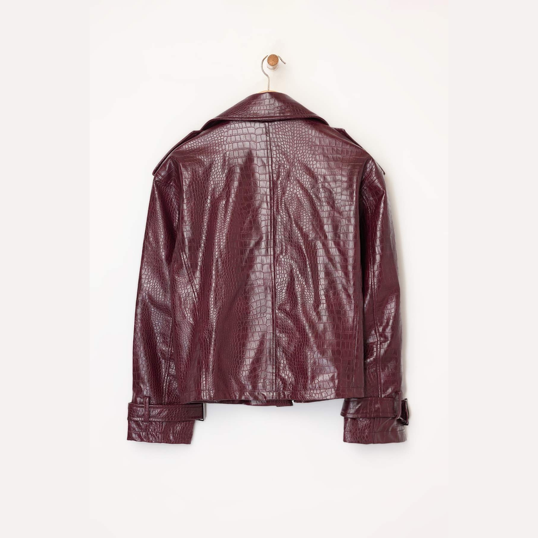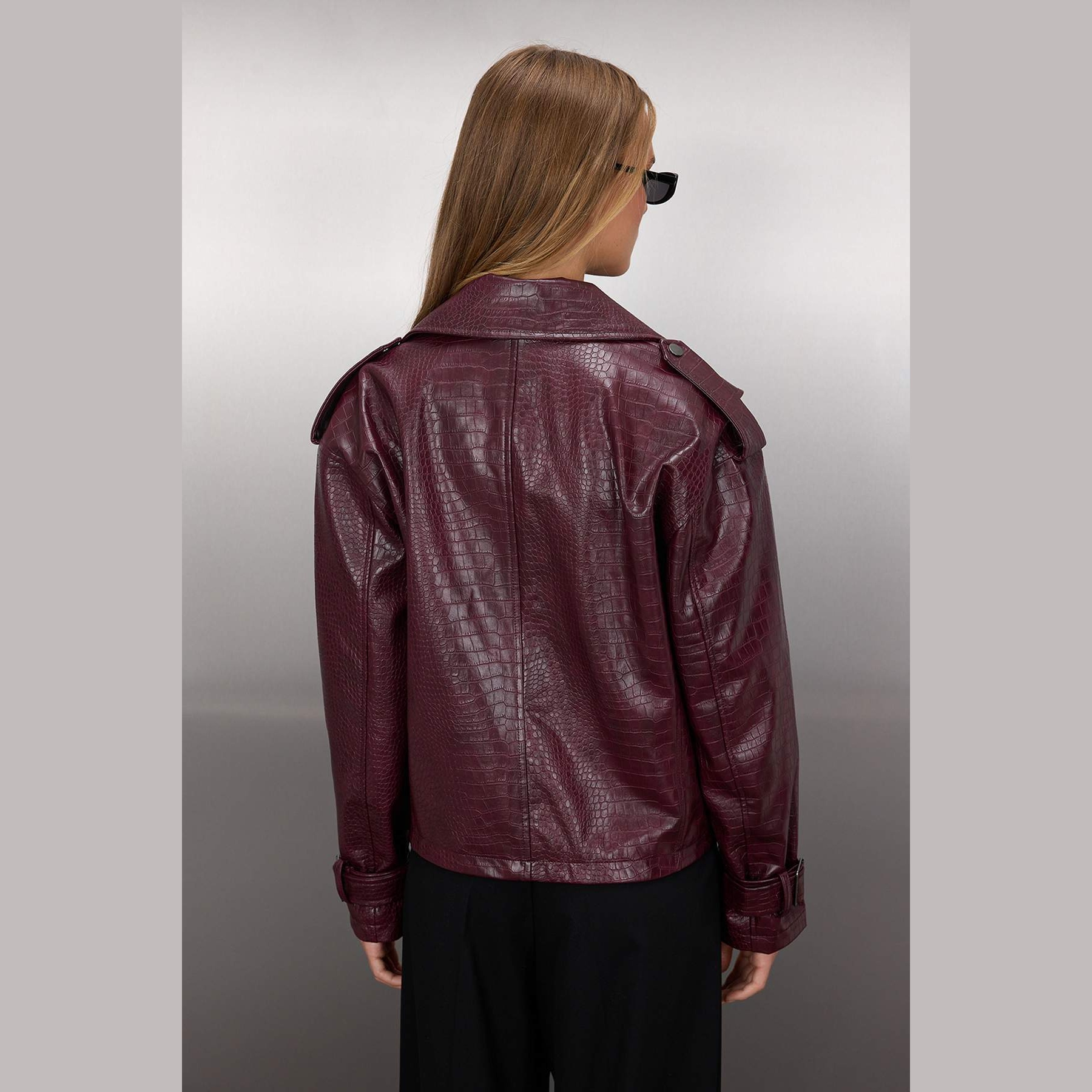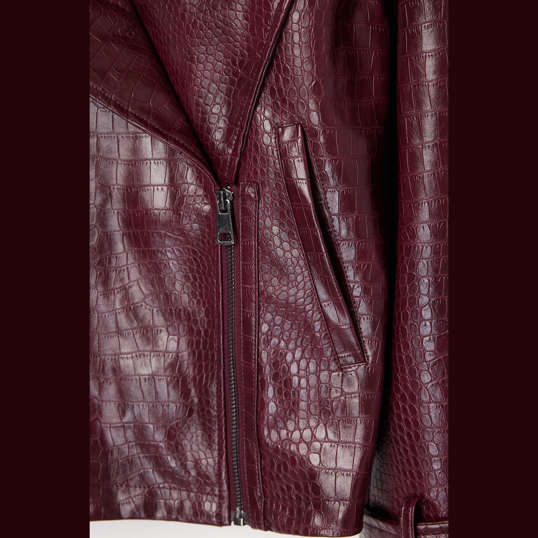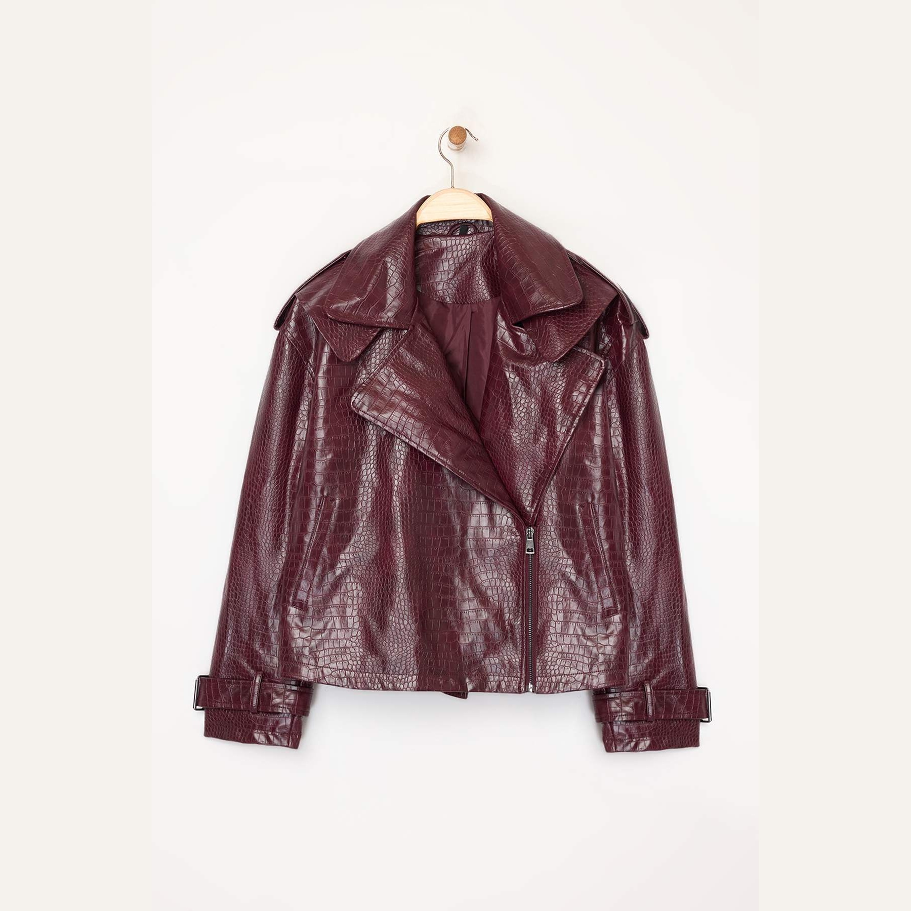 جاكيت نسائي – بوردو بقصة منتظمة من الجلد الصناعي بستايل Biker (تصميم عصري خفيف)
