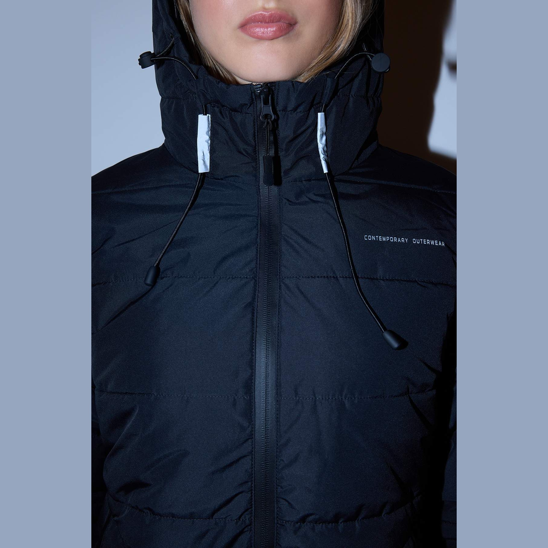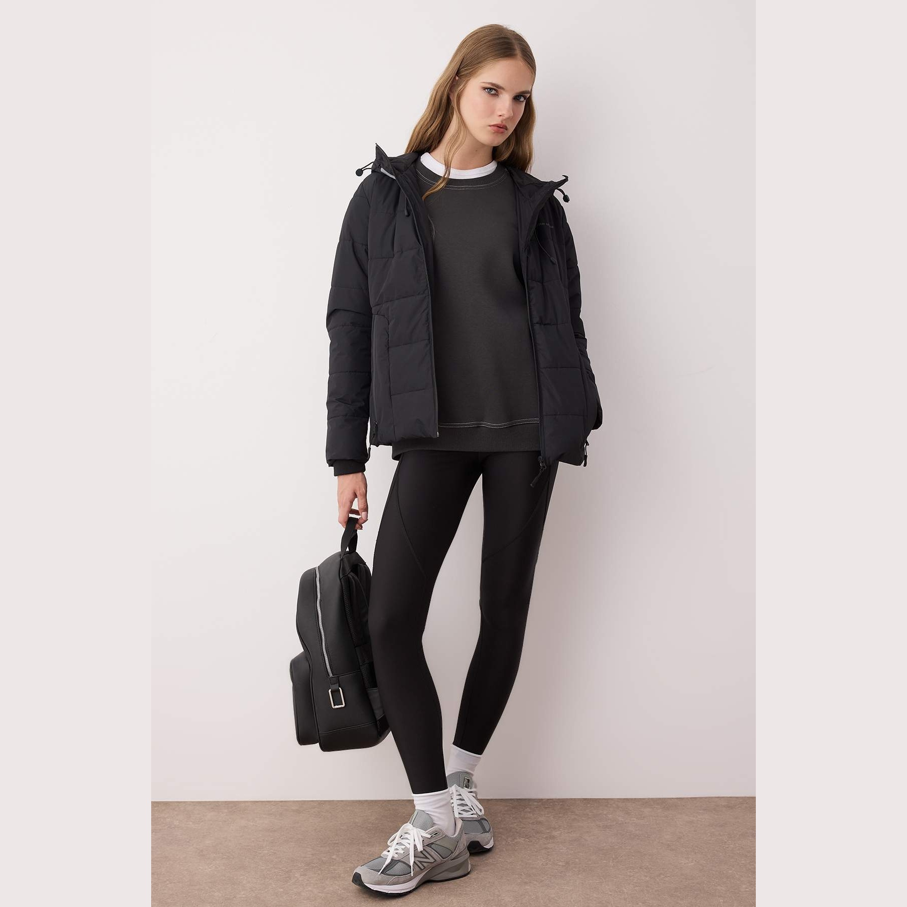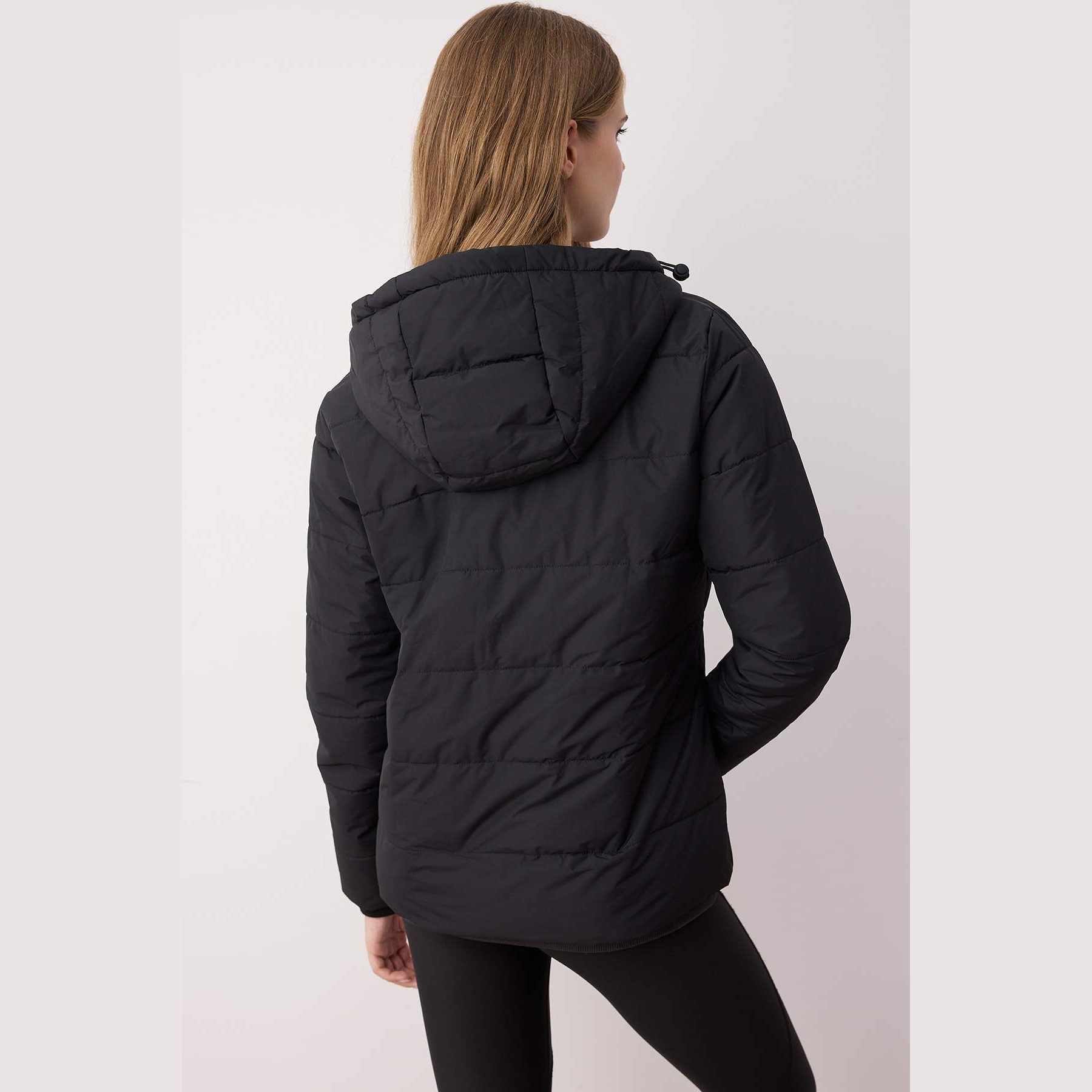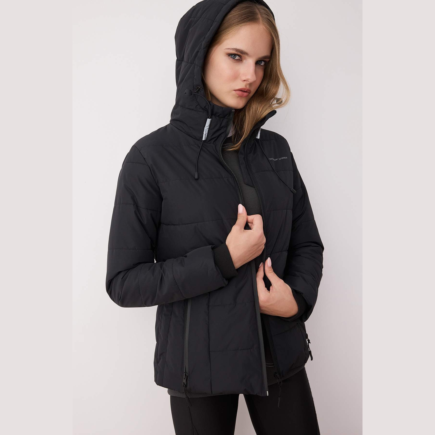 جاكيت نسائي – أسود بقصة منتظمة مع قبعة وخامة مبطنة مقاومة للماء (تصميم مثالي للأجواء الباردة)