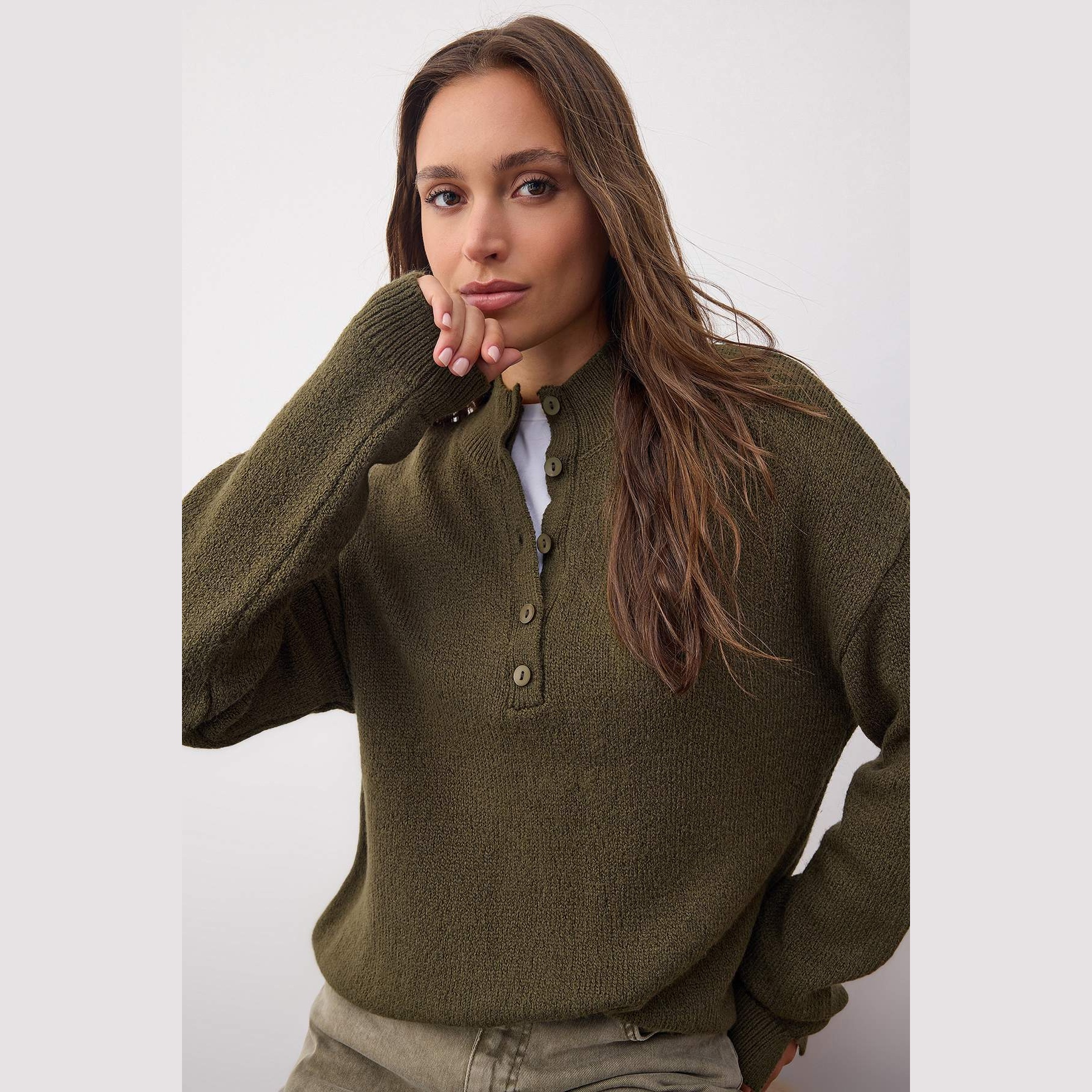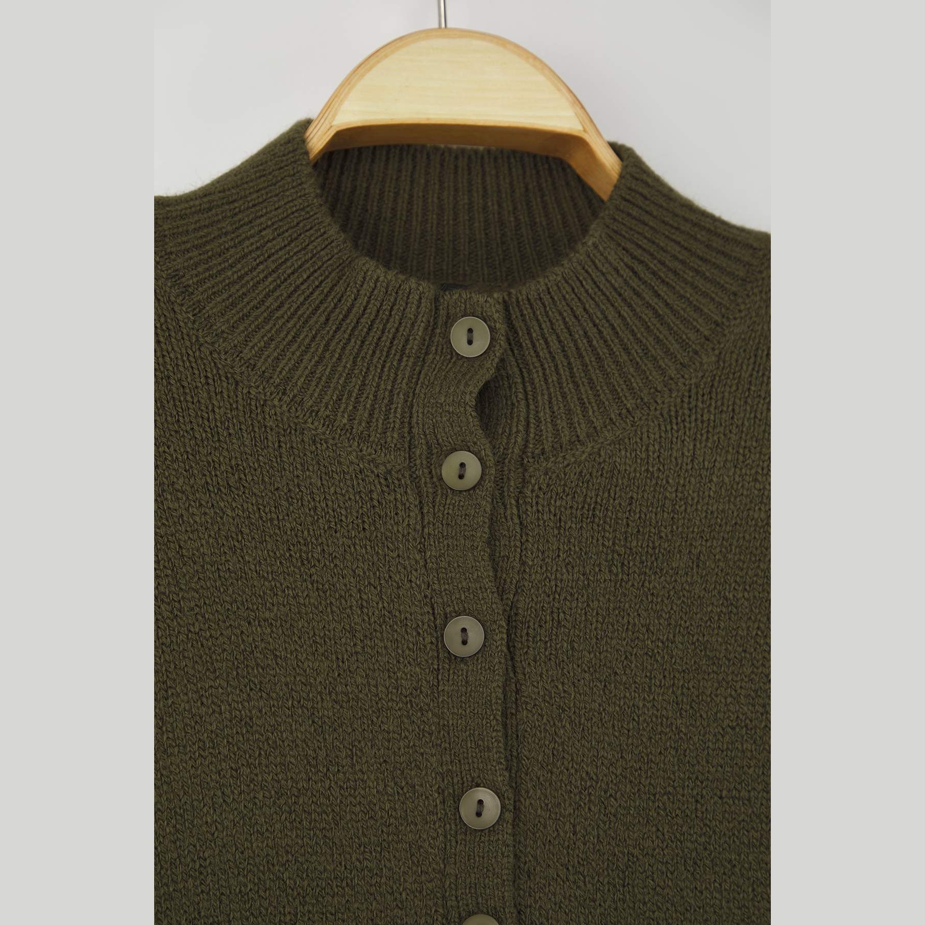 كنزة نسائية – زيتي بقصة منتظمة وخامة تريكو ناعمة (تصميم يومي أنيق بلمسة دافئة)