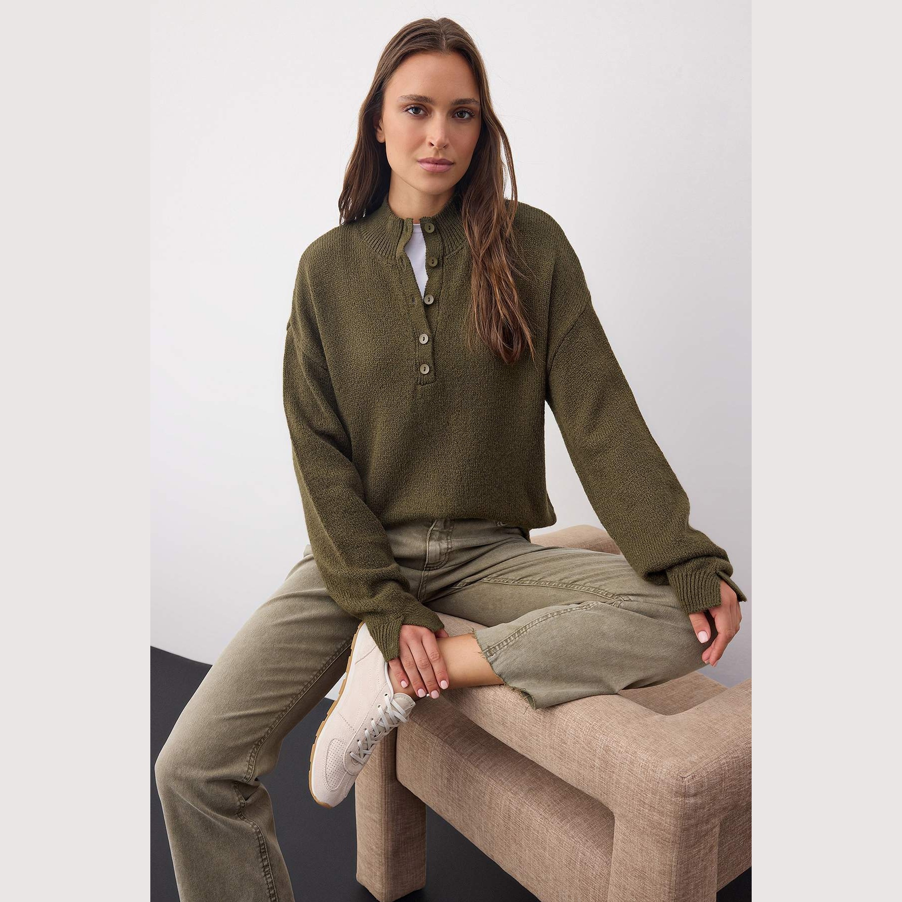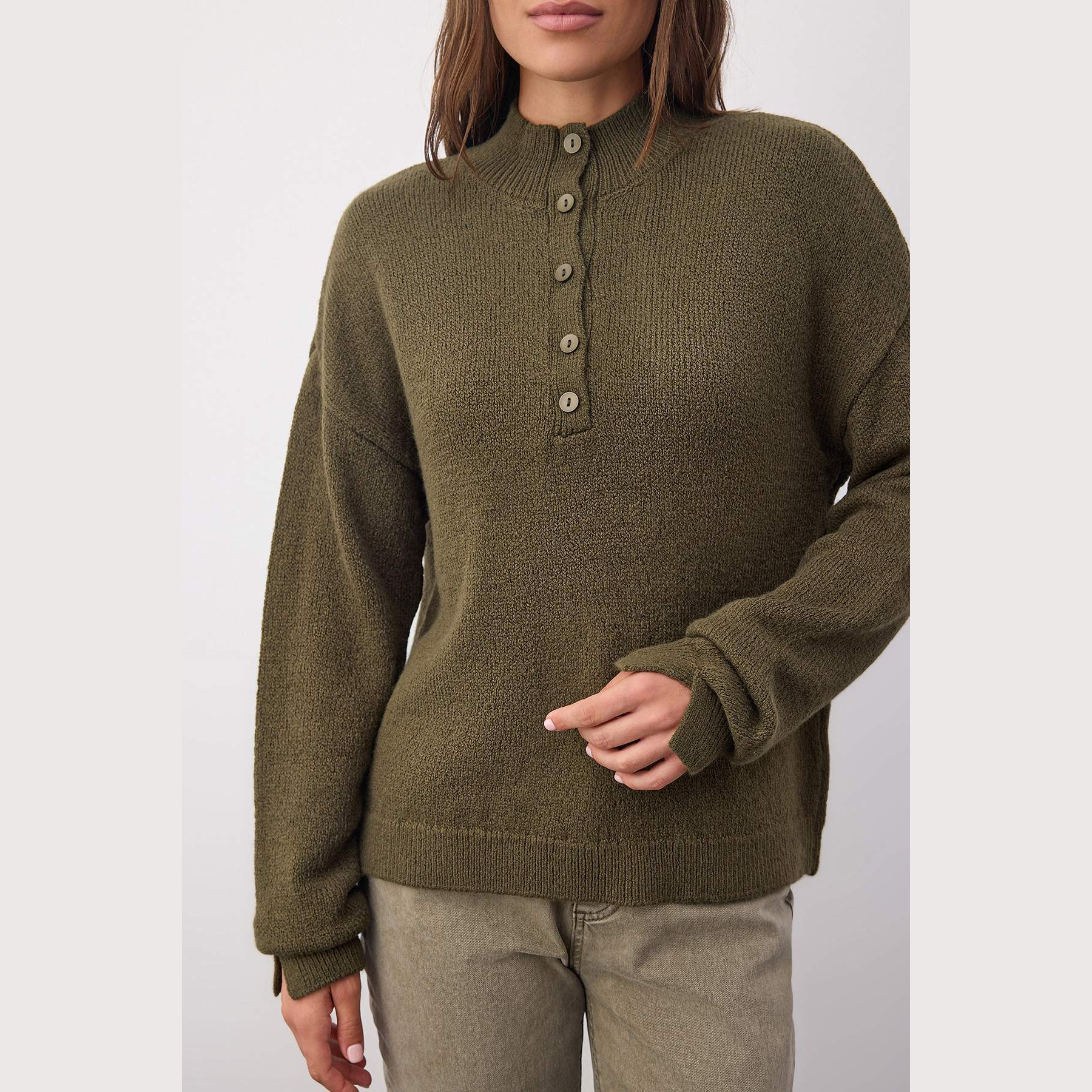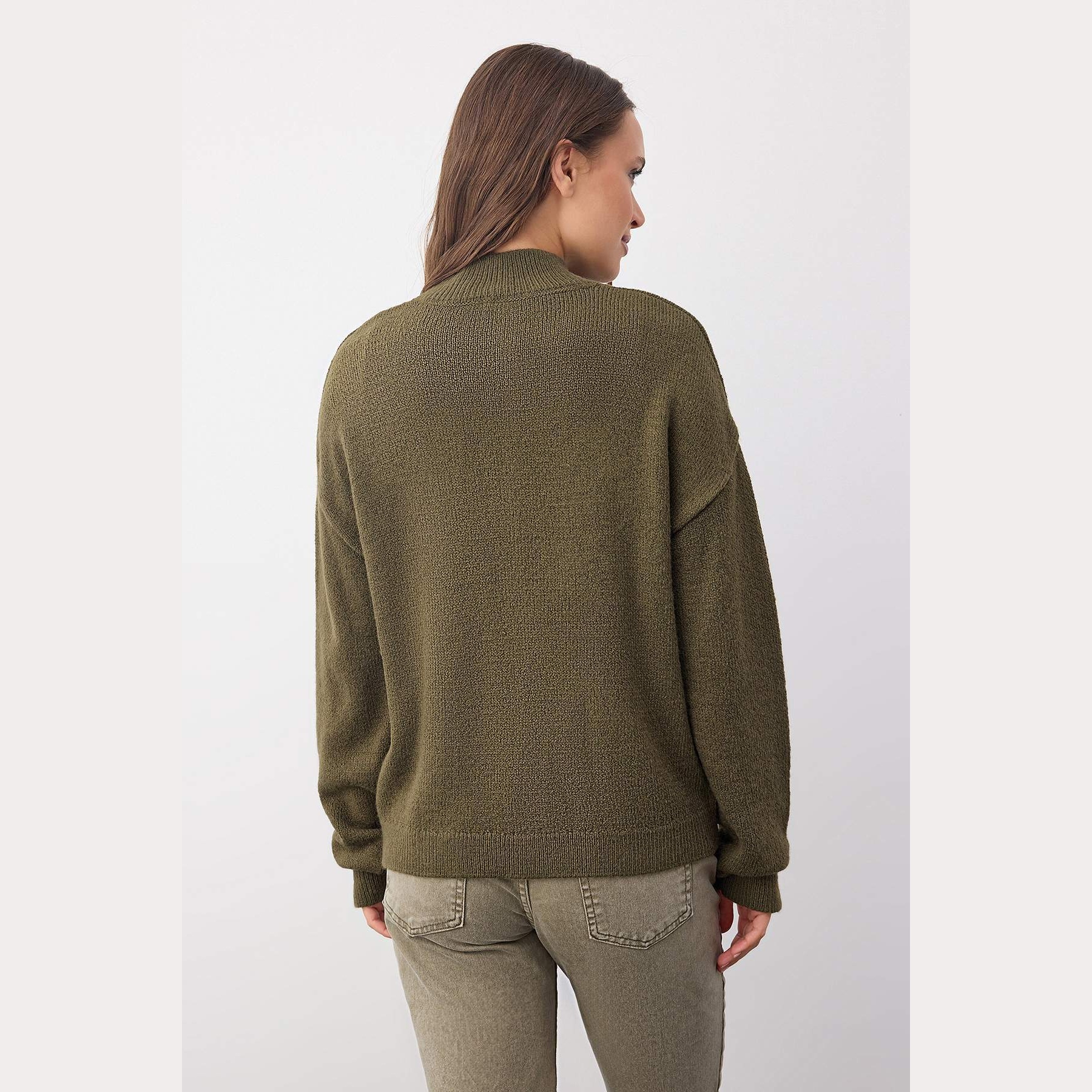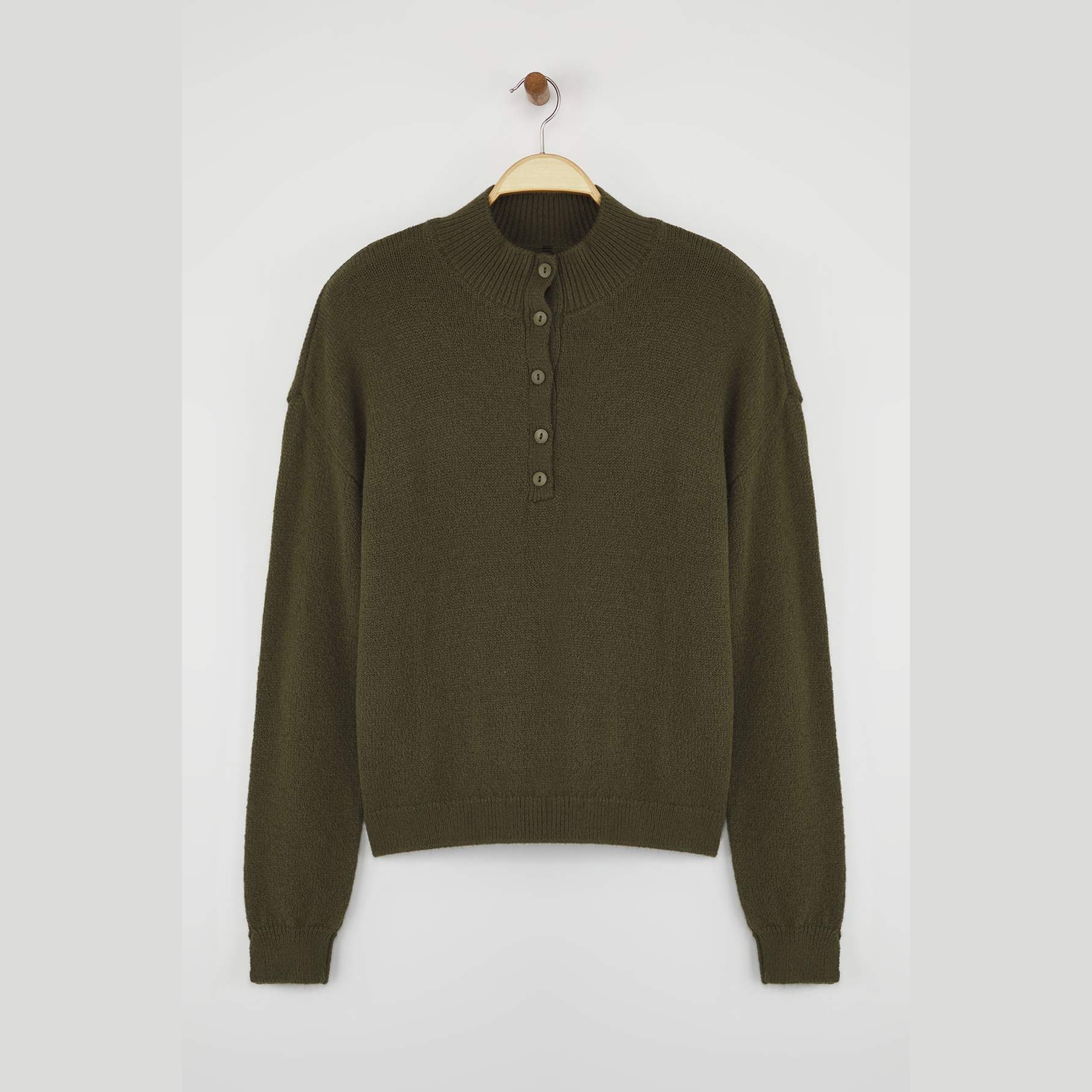 كنزة خريفية بلون هاكي (زيتي هادئ) من مجموعة Wardrobe Essentials – Trendyolmilla، بتصميم أساسي مريح بقصة منتظمة (Regular Fit)، مصنوعة من خامة تريكو ناعمة الملمس توفر دفئًا وراحة مثالية لأيام الخريف والشتاء المعتدل، مع ياقة مستقيمة وأكمام طويلة بكتف منخفض.