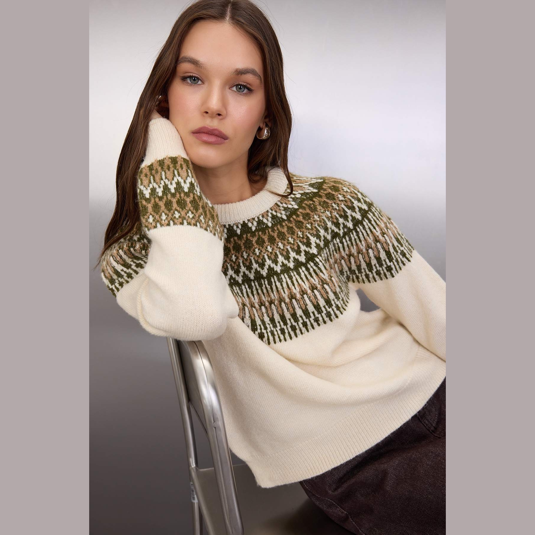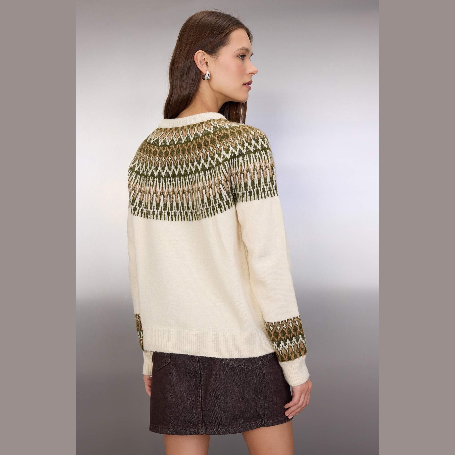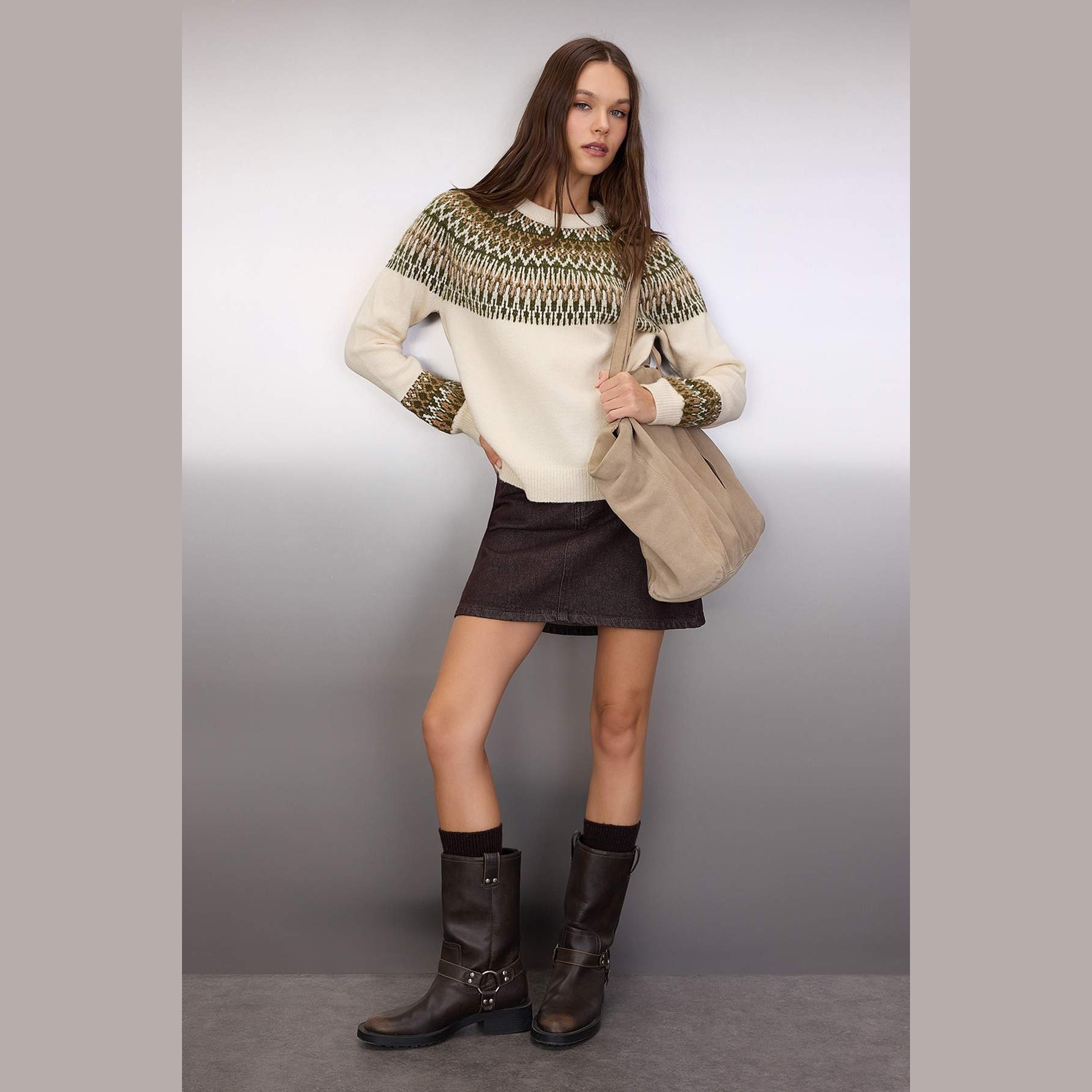 كنزة خريفية بلون رملي هادئ من مجموعة Trendyolmilla – تصميم بنقشة عرقية تضيف طابعًا فلكلوريًا أنيقًا على خامة تريكو ناعمة ومريحة، تتميز بقصة منتظمة (Regular Fit) بطول عملي، مع ياقة مستديرة مغلقة، وأكمام طويلة بستايل Reglan، ما يجعلها مثالية للإطلالات اليومية الخريفية والشتوية المعتدلة.