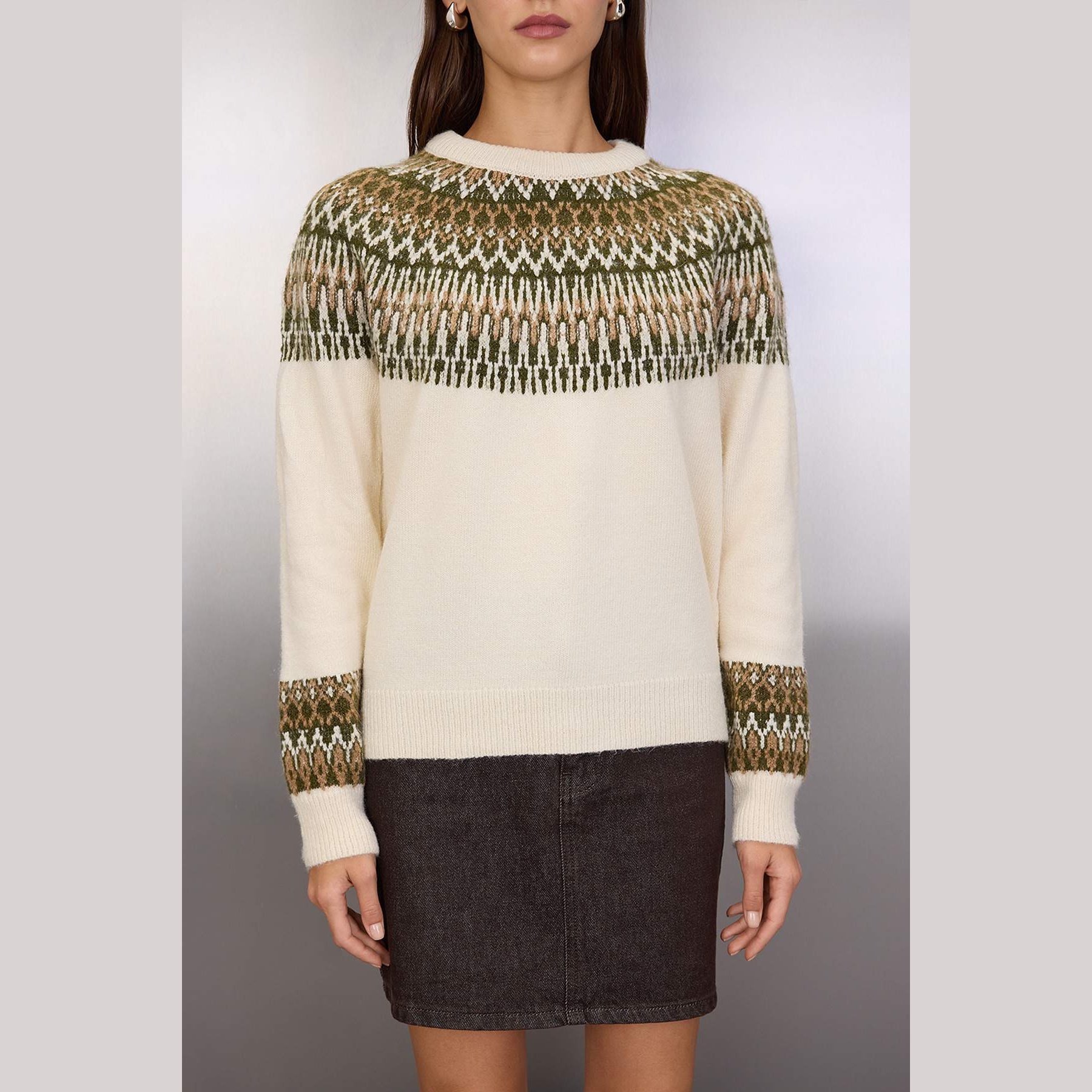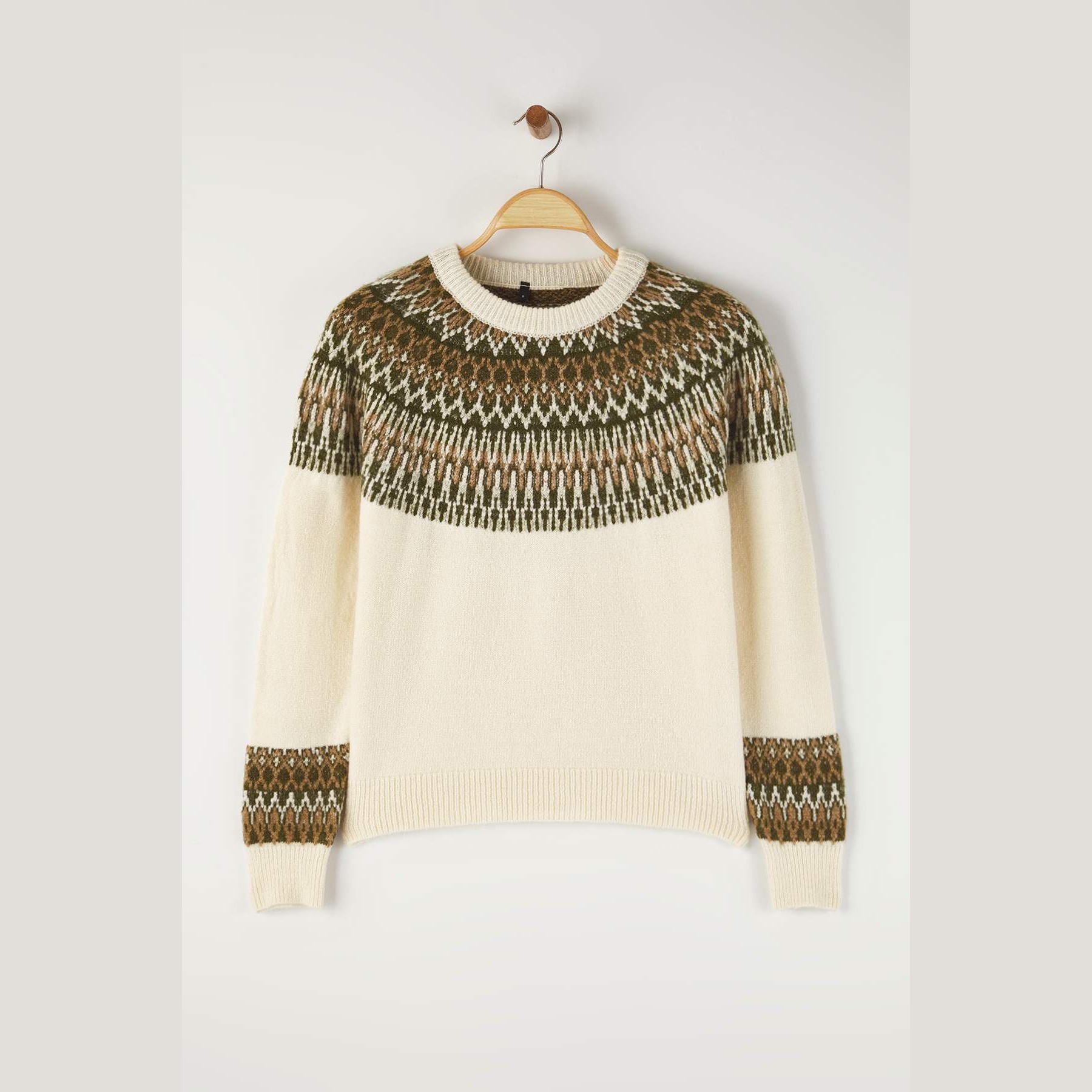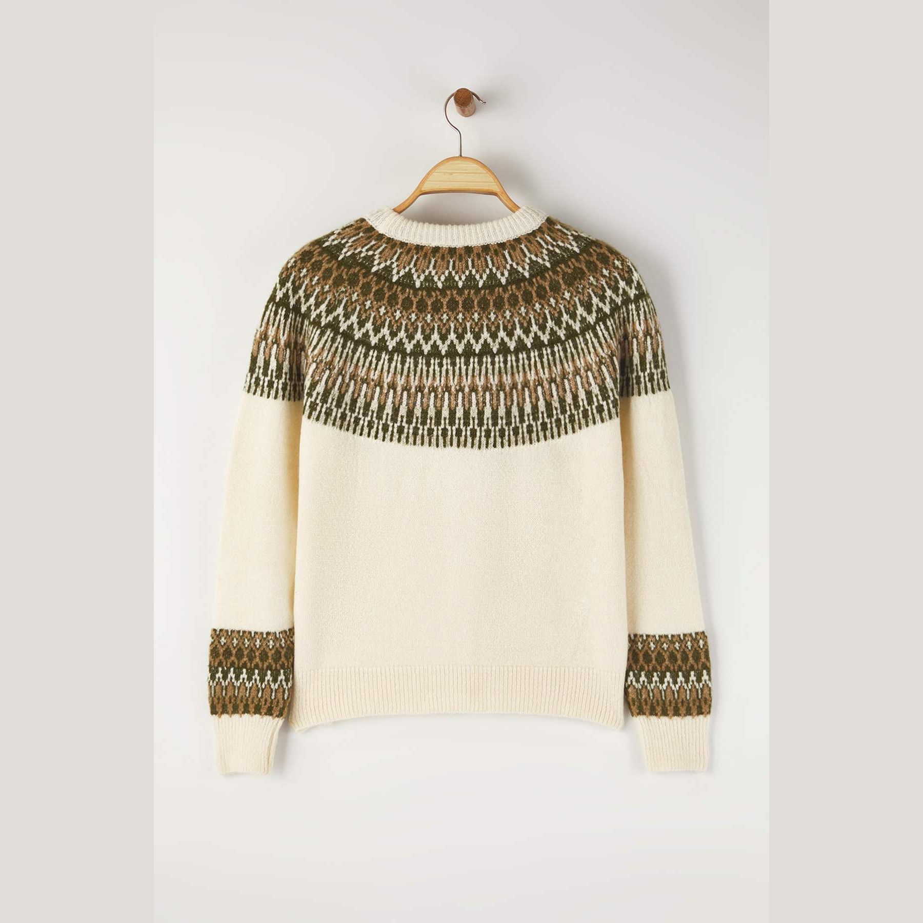 كنزة نسائية – بلون رملي بنقشة عرقية وخامة تريكو ناعمة (ستايل دافئ بلمسة فلكلورية)