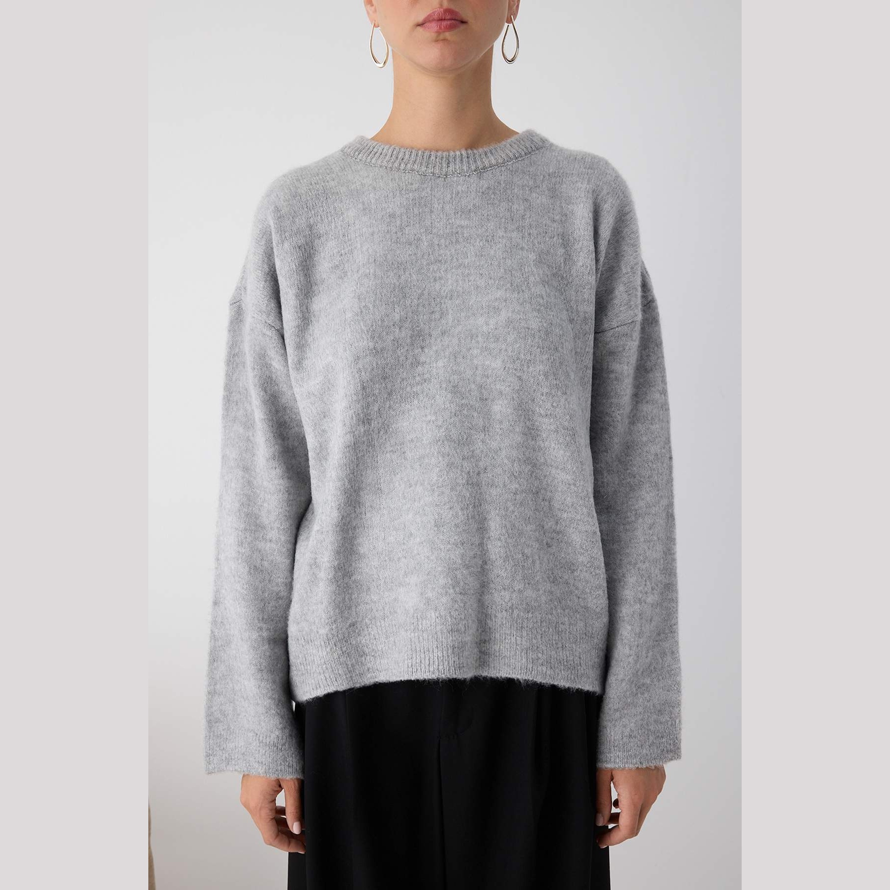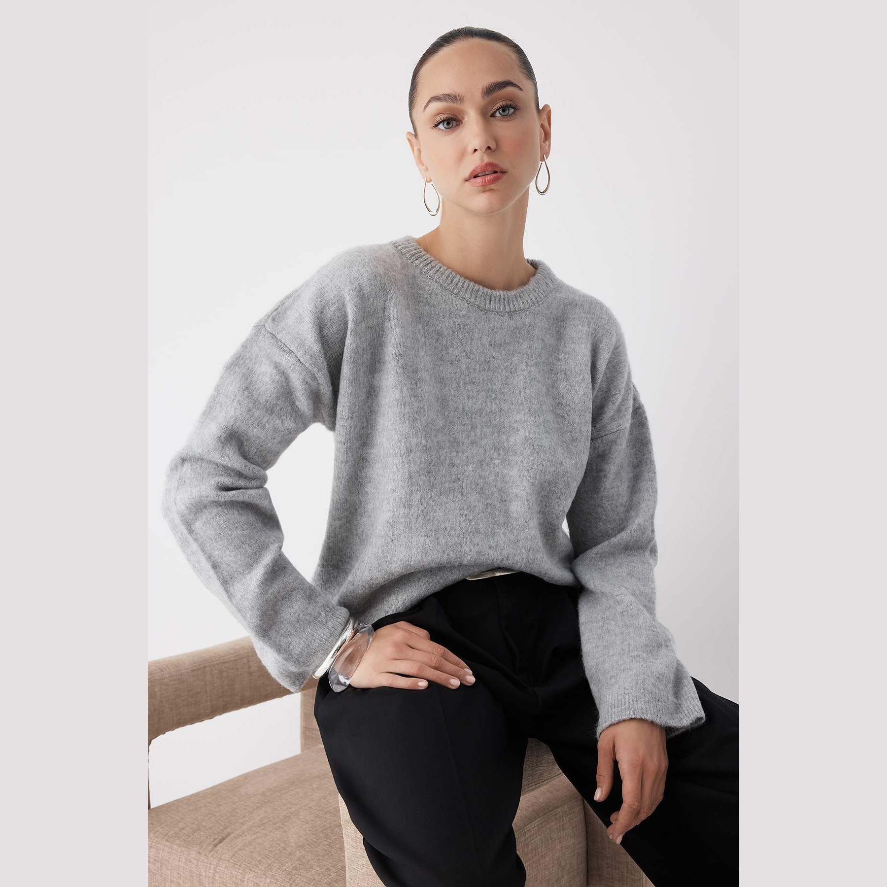 كنزة نسائية – رمادي بقصة واسعة وخامة تريكو ناعمة (راحة يومية بلمسة شتوية ناعمة)