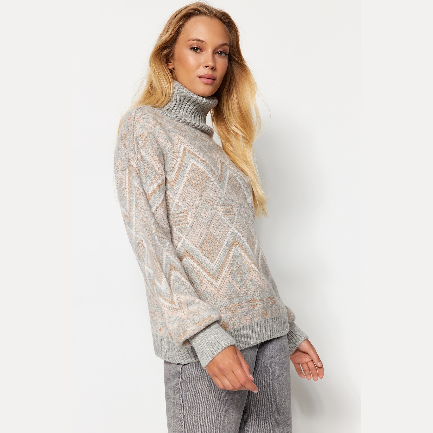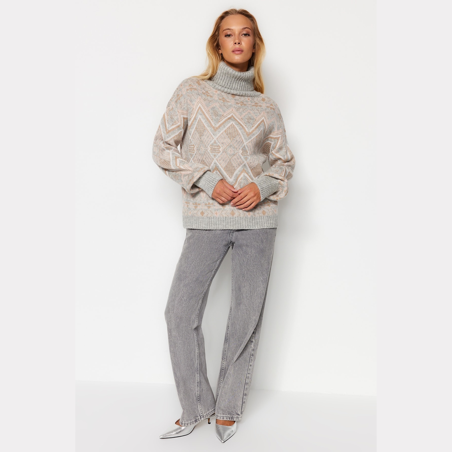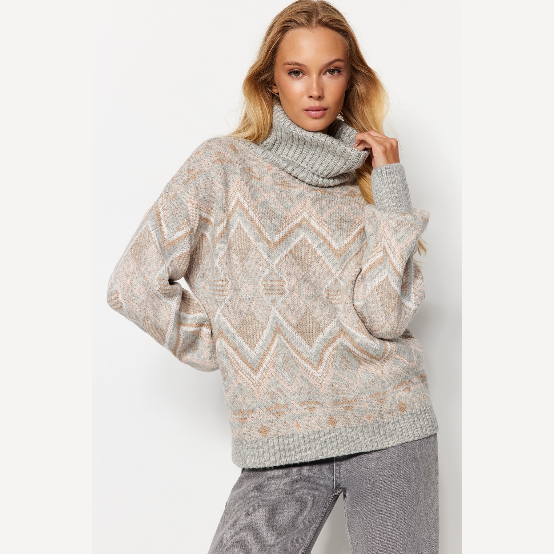 كنزة شتوية بلون رمادي هادئ من مجموعة Trendyolmilla – تصميم بنقشة عرقية تضيف طابعًا فلكلوريًا أنيقًا على خامة تريكو ناعمة ومريحة، مع ياقة عالية تمنح دفئًا إضافيًا، تتميز بقصة واسعة (Oversize Fit) بطول عملي، مع ياقة عالية (Balıkçı Yaka)، وأكمام طويلة بكتف منخفض، ما يجعلها مثالية للإطلالات اليومية الشتوية التي تجمع بين الراحة والتميز.