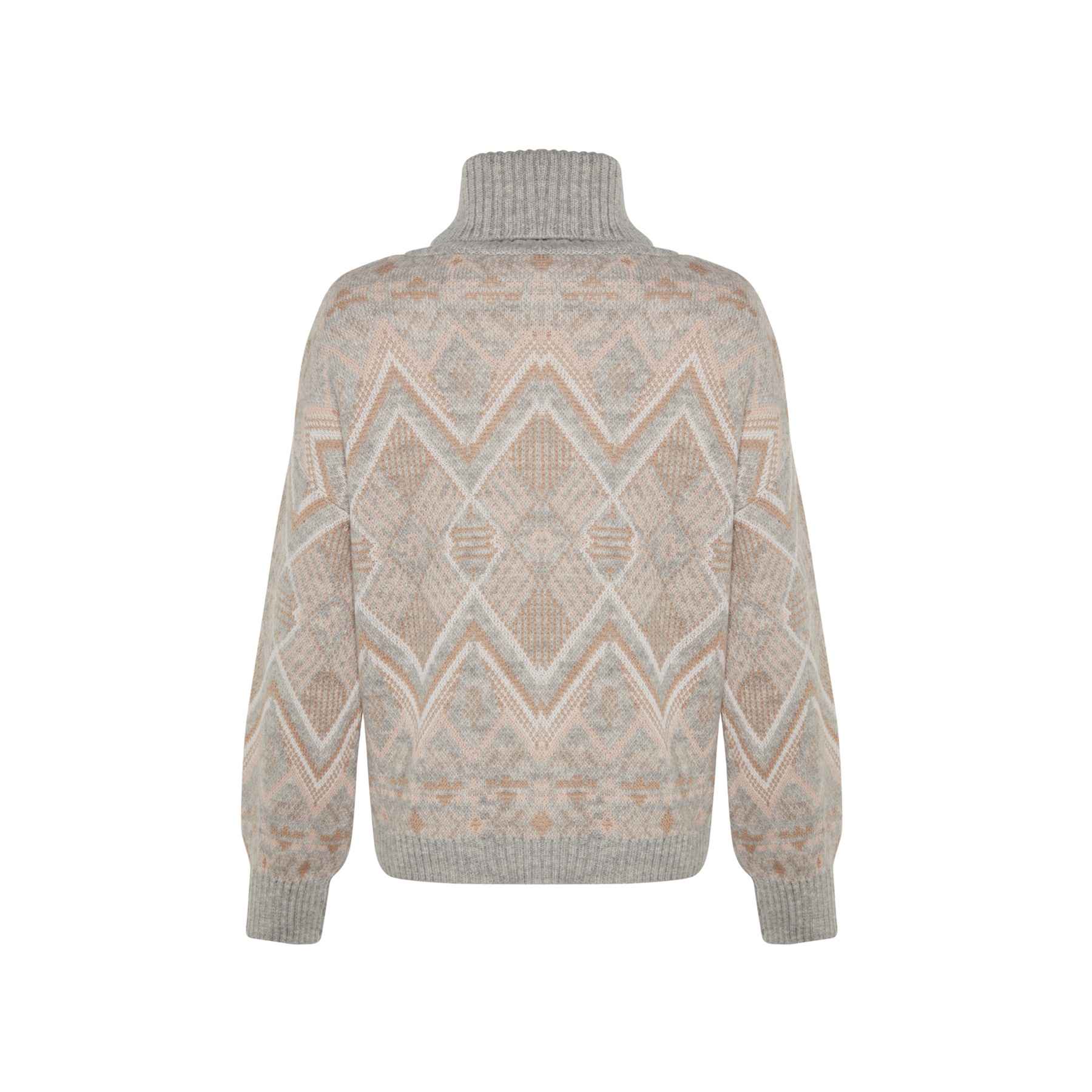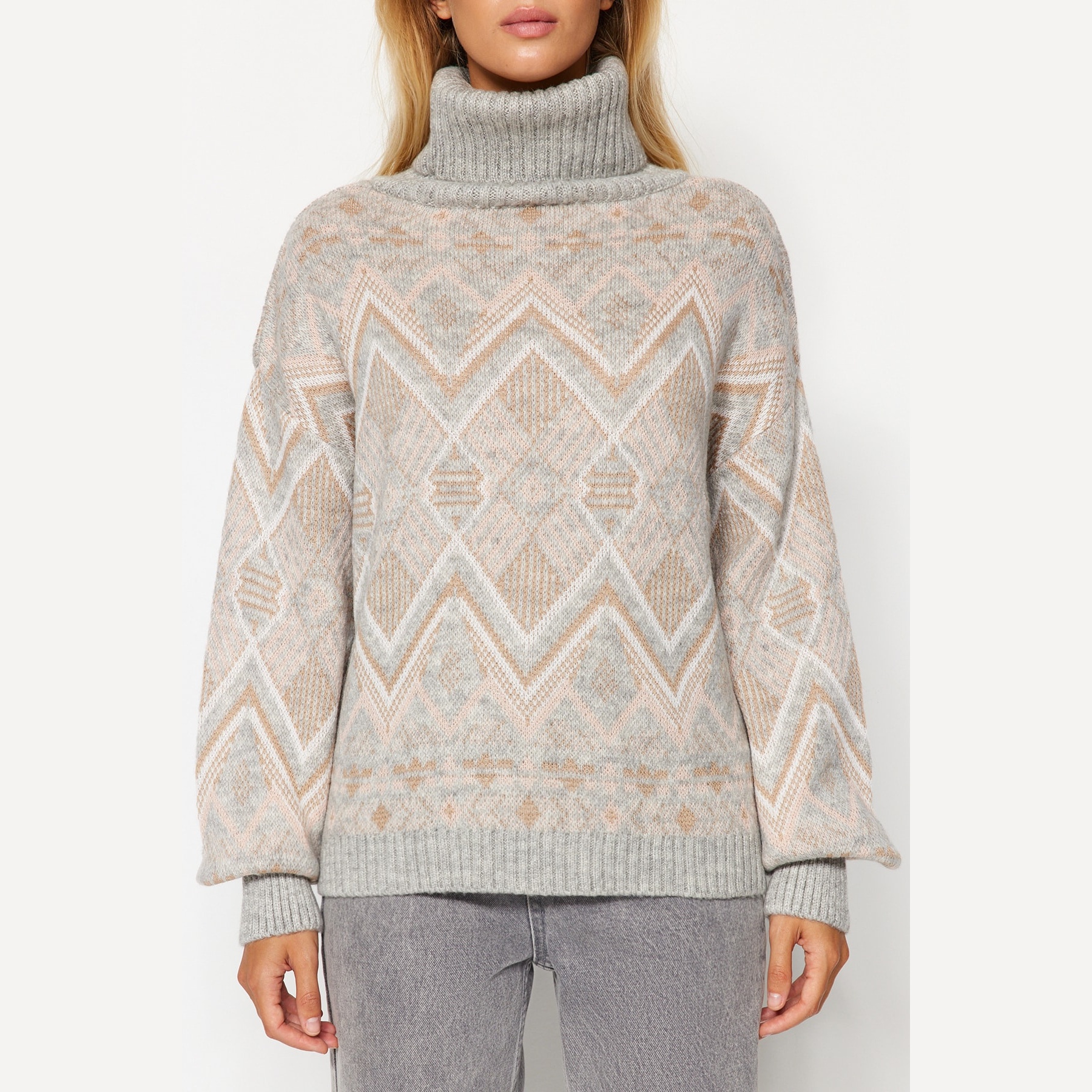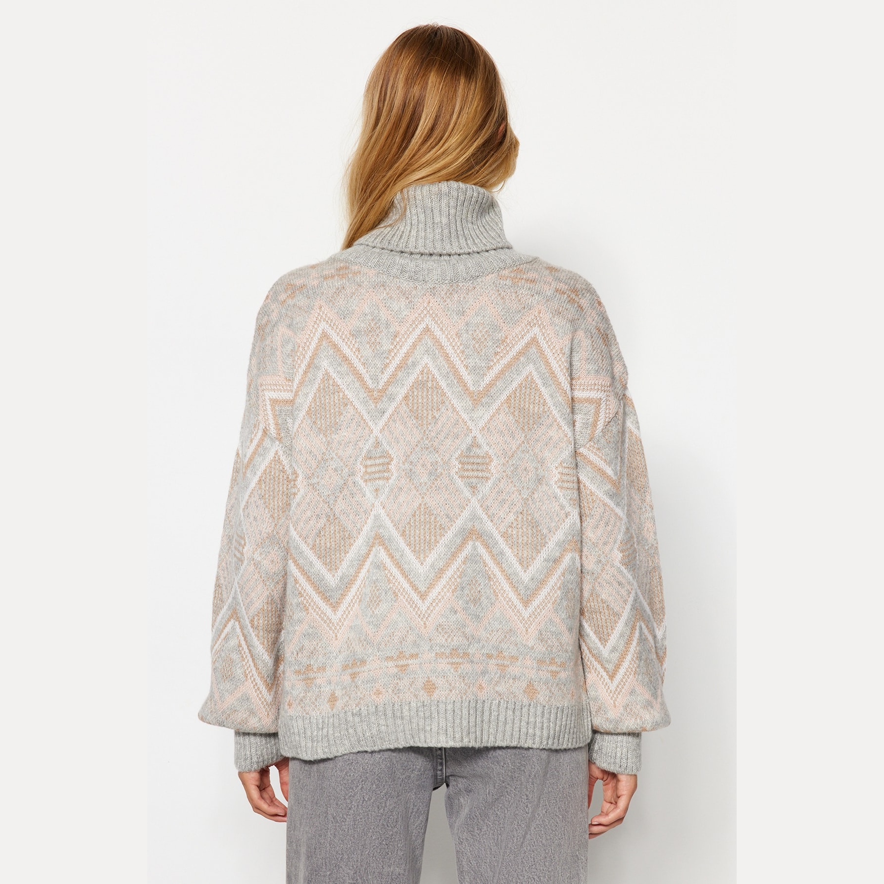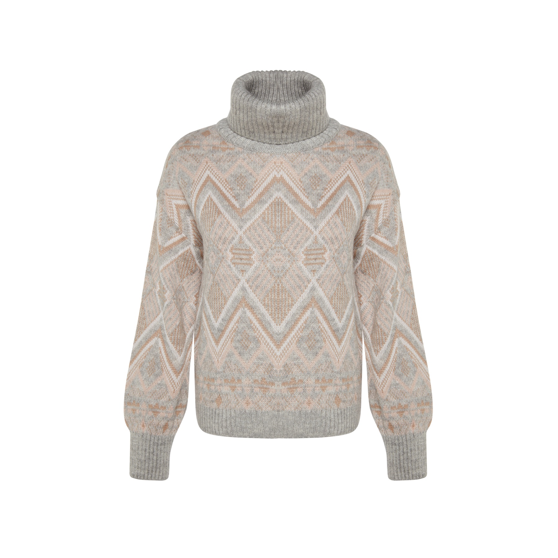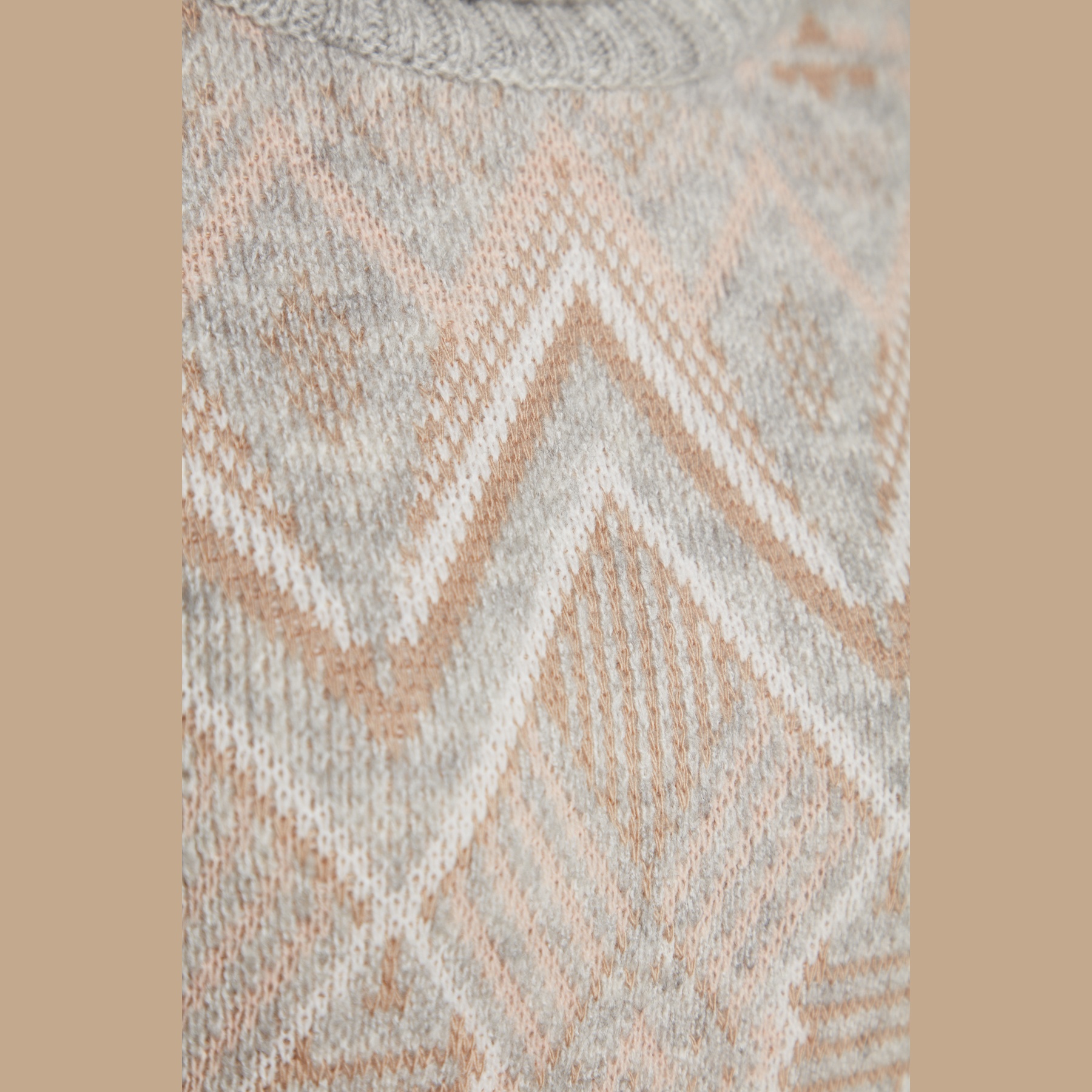 كنزة نسائية – رمادي بنقشة عرقية وخامة تريكو ناعمة مع ياقة عالية (دفء وأناقة بلمسة فلكلورية)