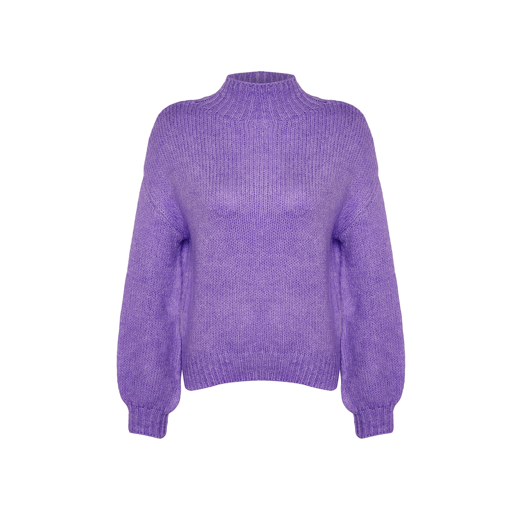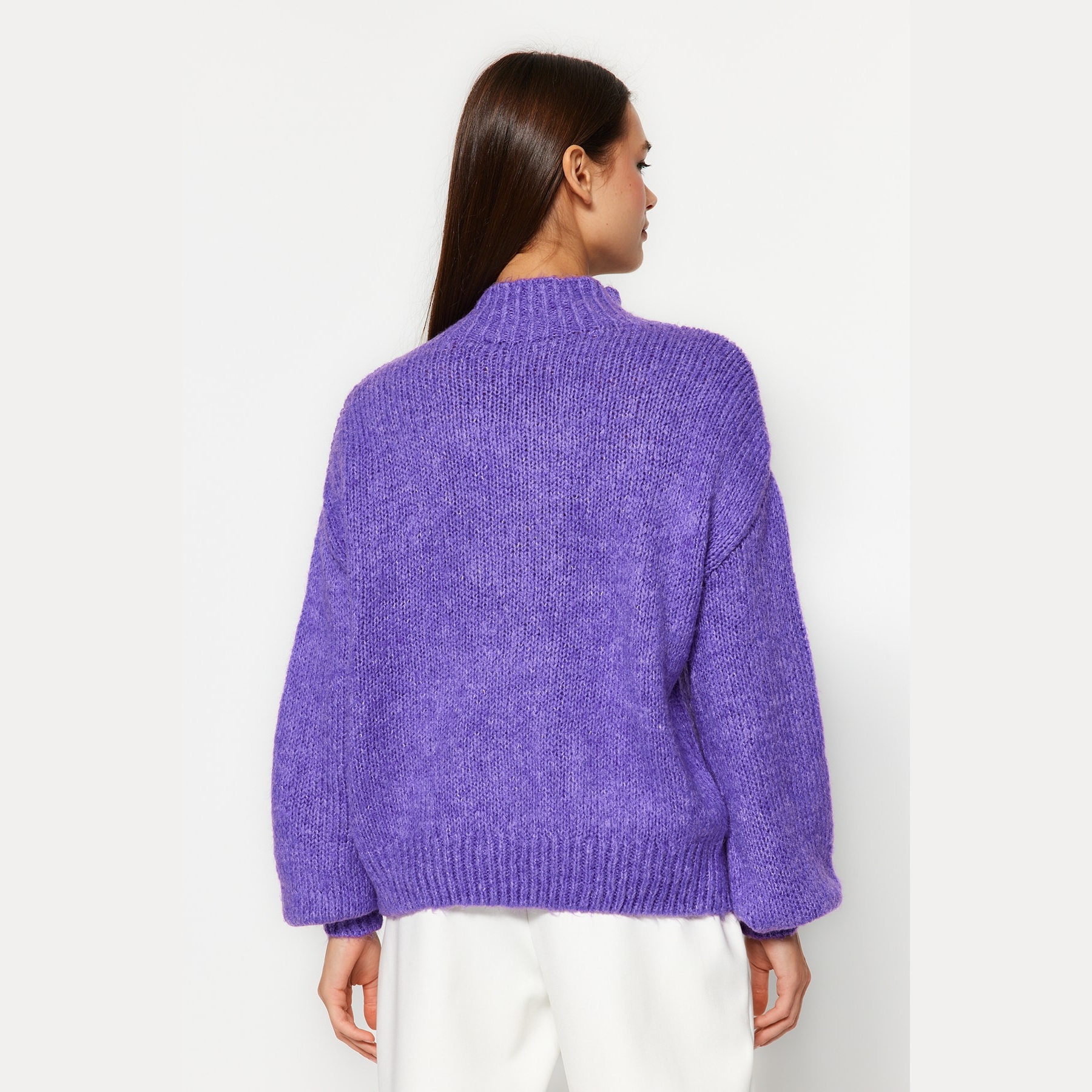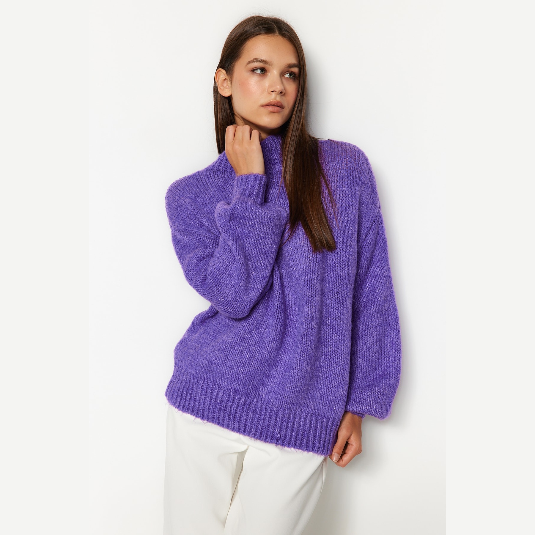 كنزة نسائية – بنفسجي بخامة تريكو سميكة وملمس ناعم مع ياقة مستديرة (دفء وأناقة في إطلالة يومية)
