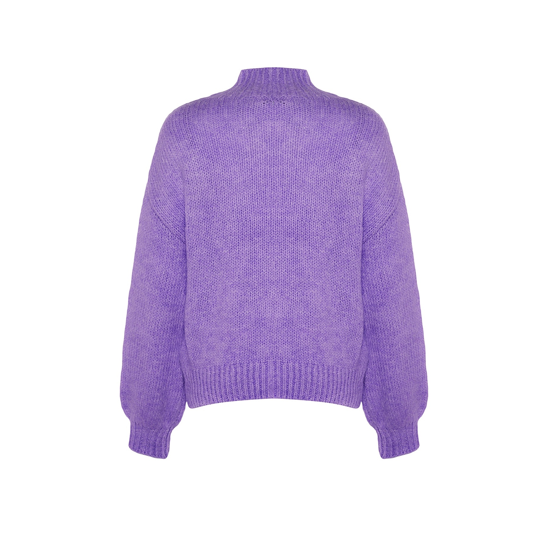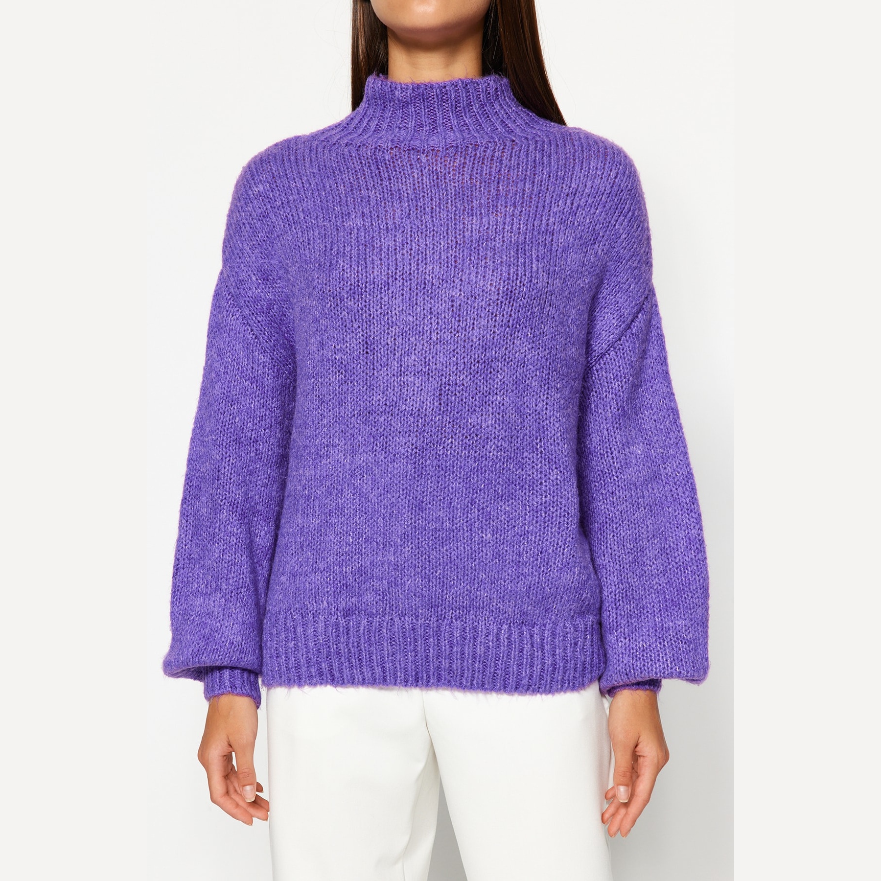 كنزة شتوية بلون بنفسجي غني، مصنوعة من خامة تريكو سميكة وناعمة تمنحك دفئًا مثاليًا في الأجواء الباردة. تتميز بياقة مستديرة مغلقة، وأكمام طويلة، وقصة واسعة تمنحك راحة في الحركة، ما يجعلها خيارًا مثاليًا للإطلالات اليومية الشتوية التي تجمع بين الراحة والأناقة.