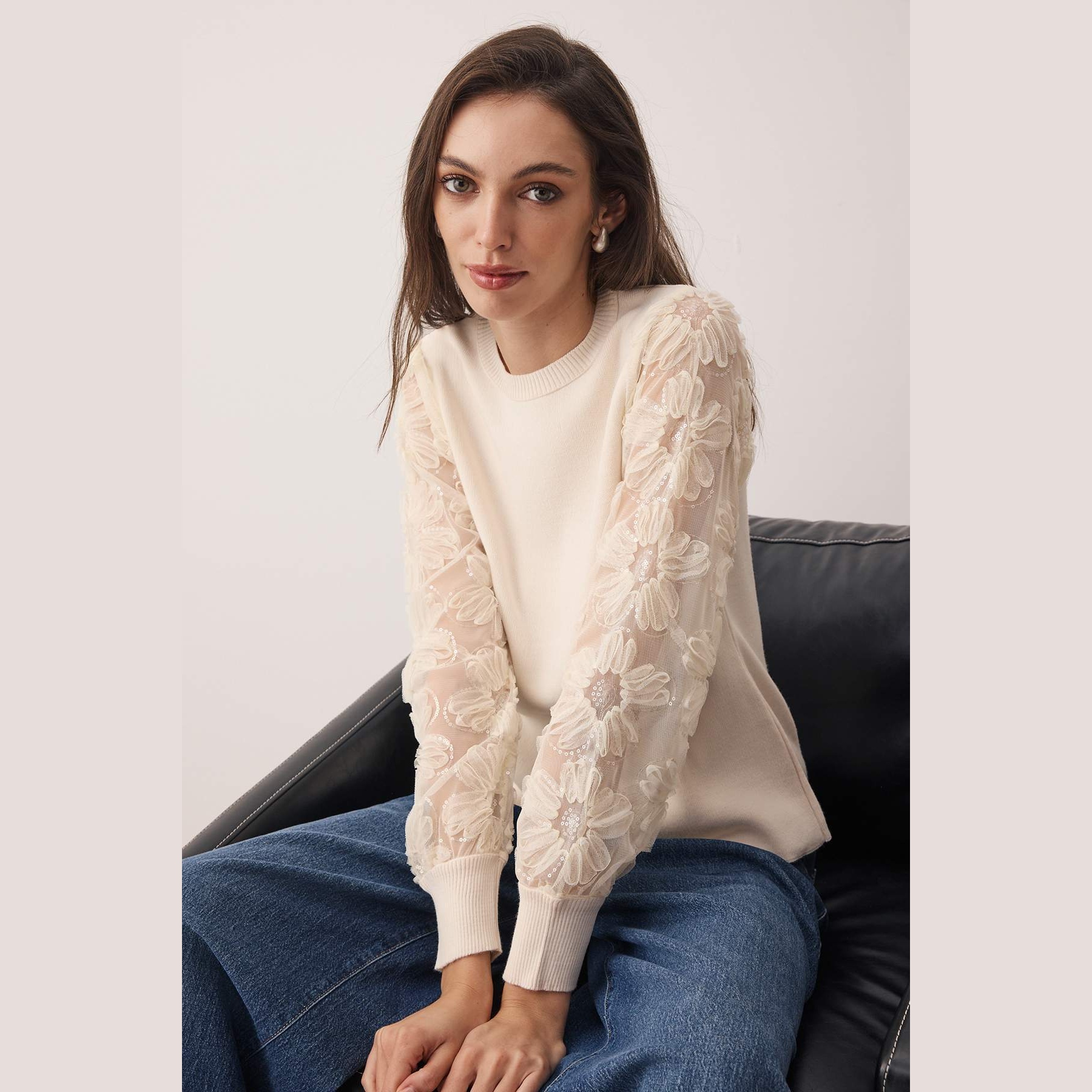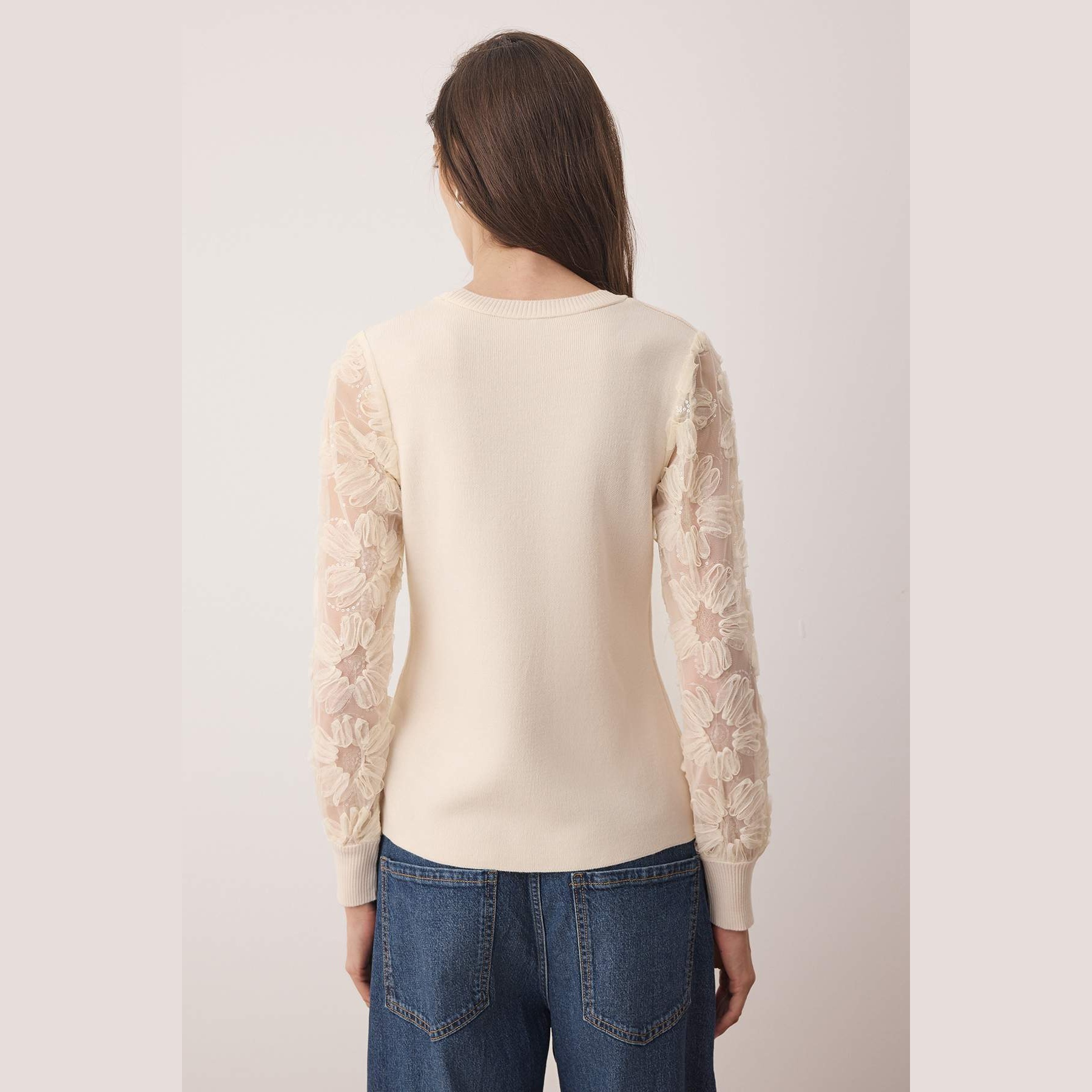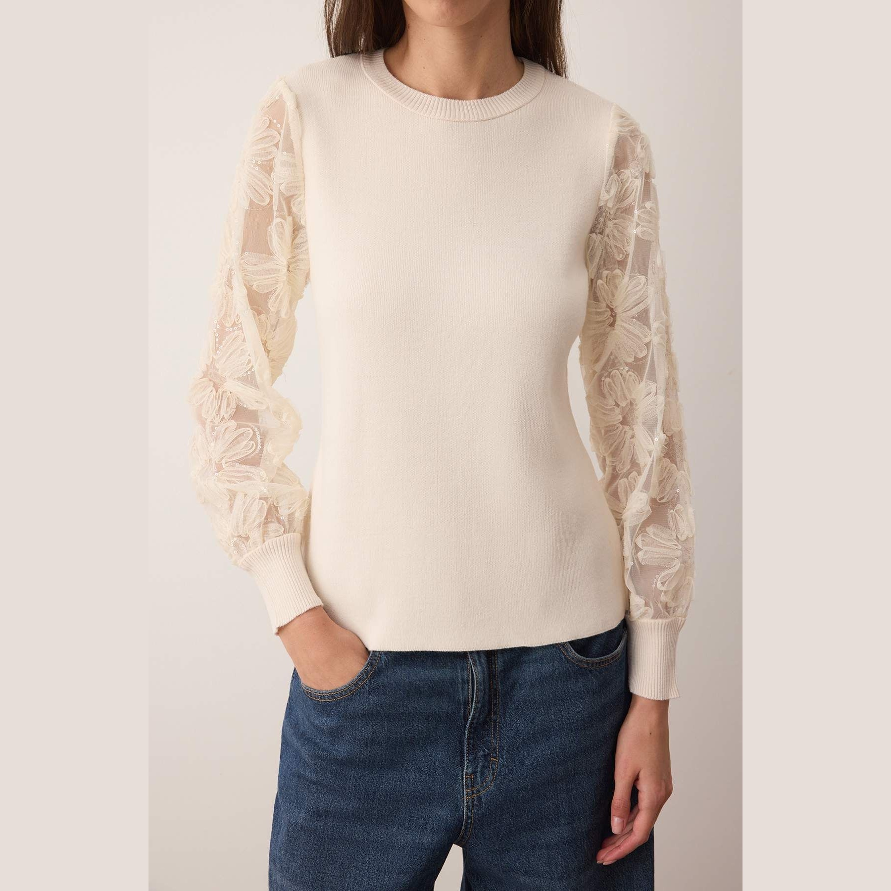 كنزة خريفية بلون إكرُو ناعم، مصممة بخامة تريكو متوسطة السماكة بملمس ناعم، وتفاصيل تول شفافة على الأكمام تضيف لمسة أنثوية أنيقة. تأتي بقصة منتظمة، وياقة مستديرة مغلقة، وأكمام طويلة بكتف منخفض، ما يجعلها مثالية للإطلالات اليومية التي تجمع بين الراحة والرقي.