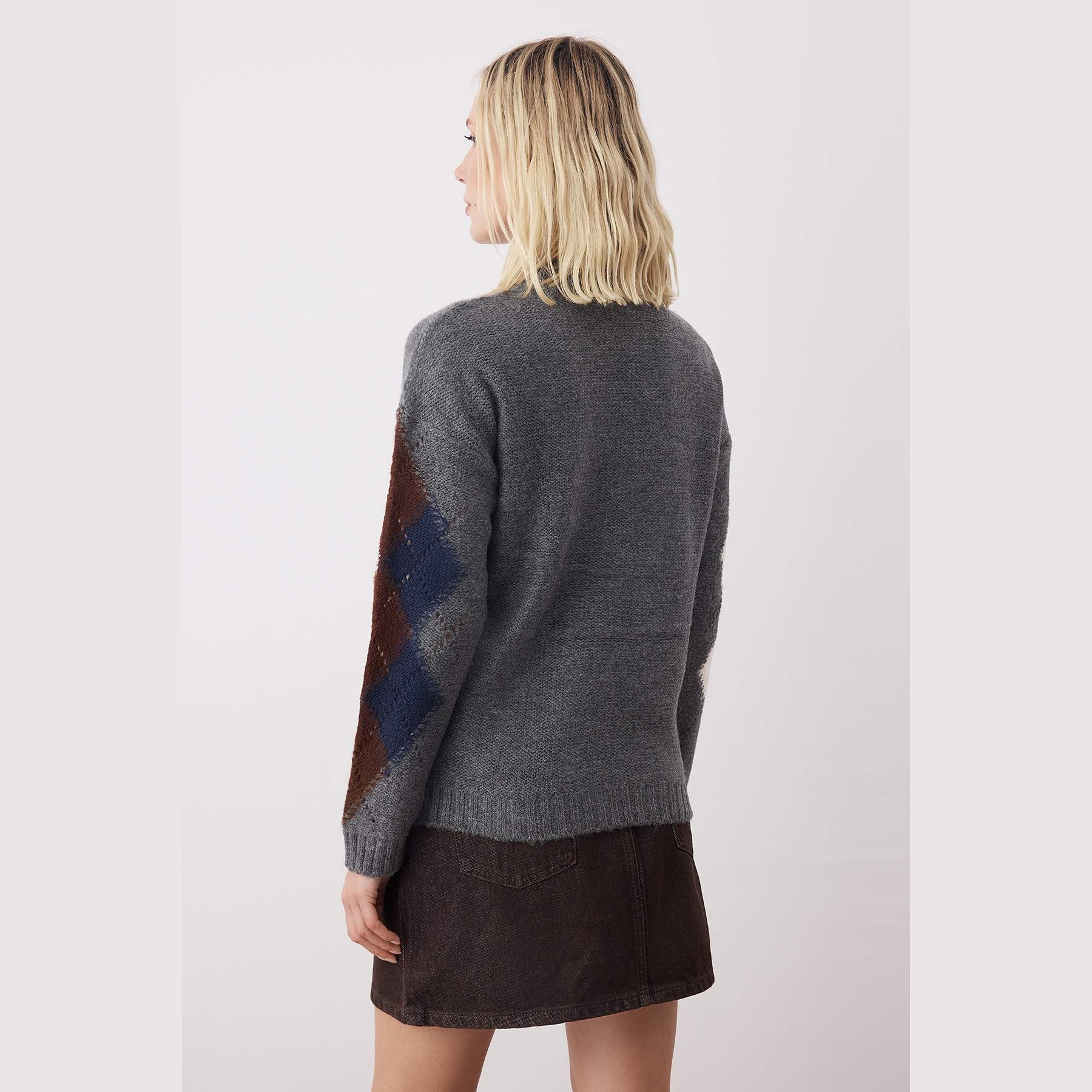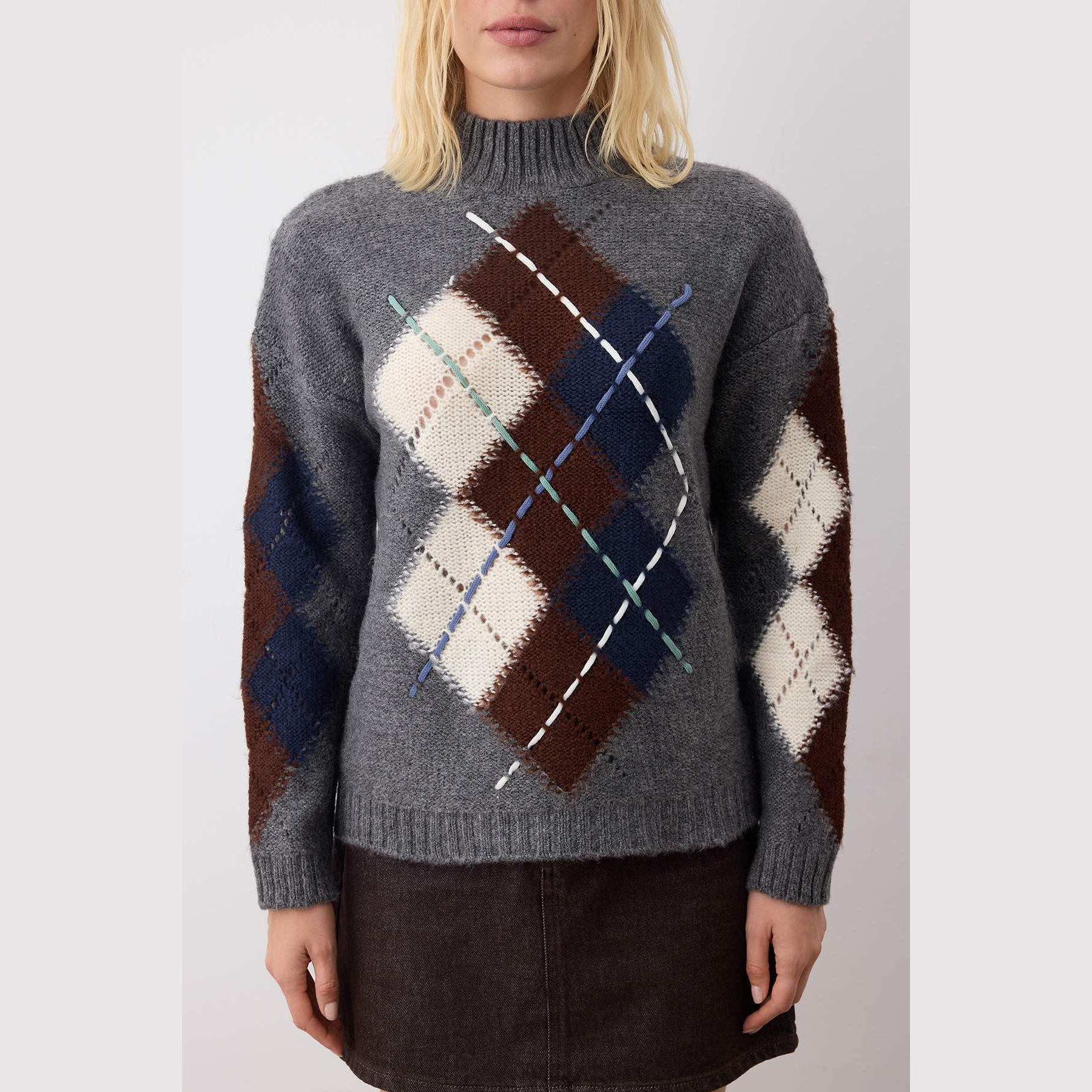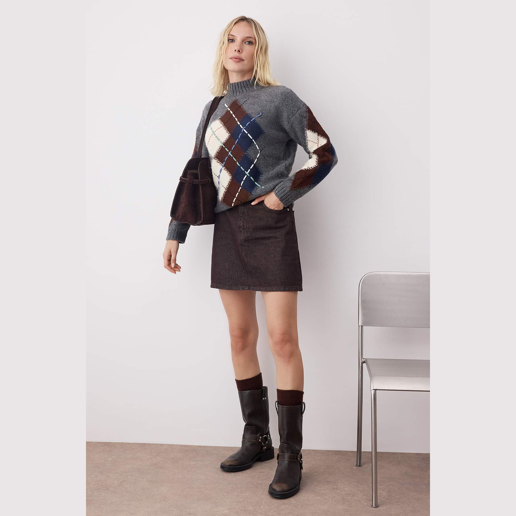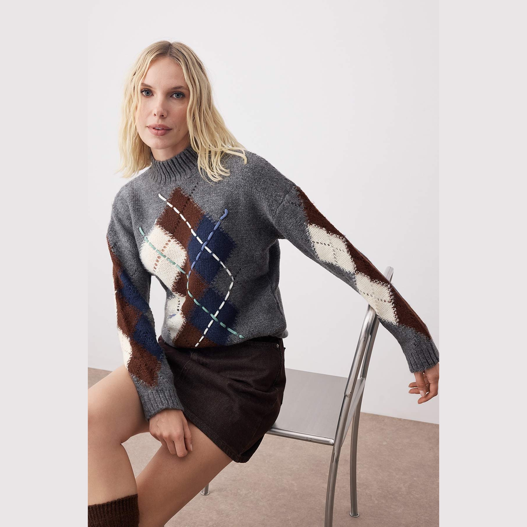 كنزة شتوية بلون رمادي داكن، مصممة بنقشة هندسية تضيف لمسة عصرية على خامة تريكو ناعمة متوسطة السماكة. تأتي بقصة واسعة تمنح راحة مثالية، وياقة مستقيمة مغلقة، وأكمام طويلة بكتف منخفض، ما يجعلها خيارًا مثاليًا للإطلالات اليومية الشتوية التي تجمع بين الراحة والأناقة.