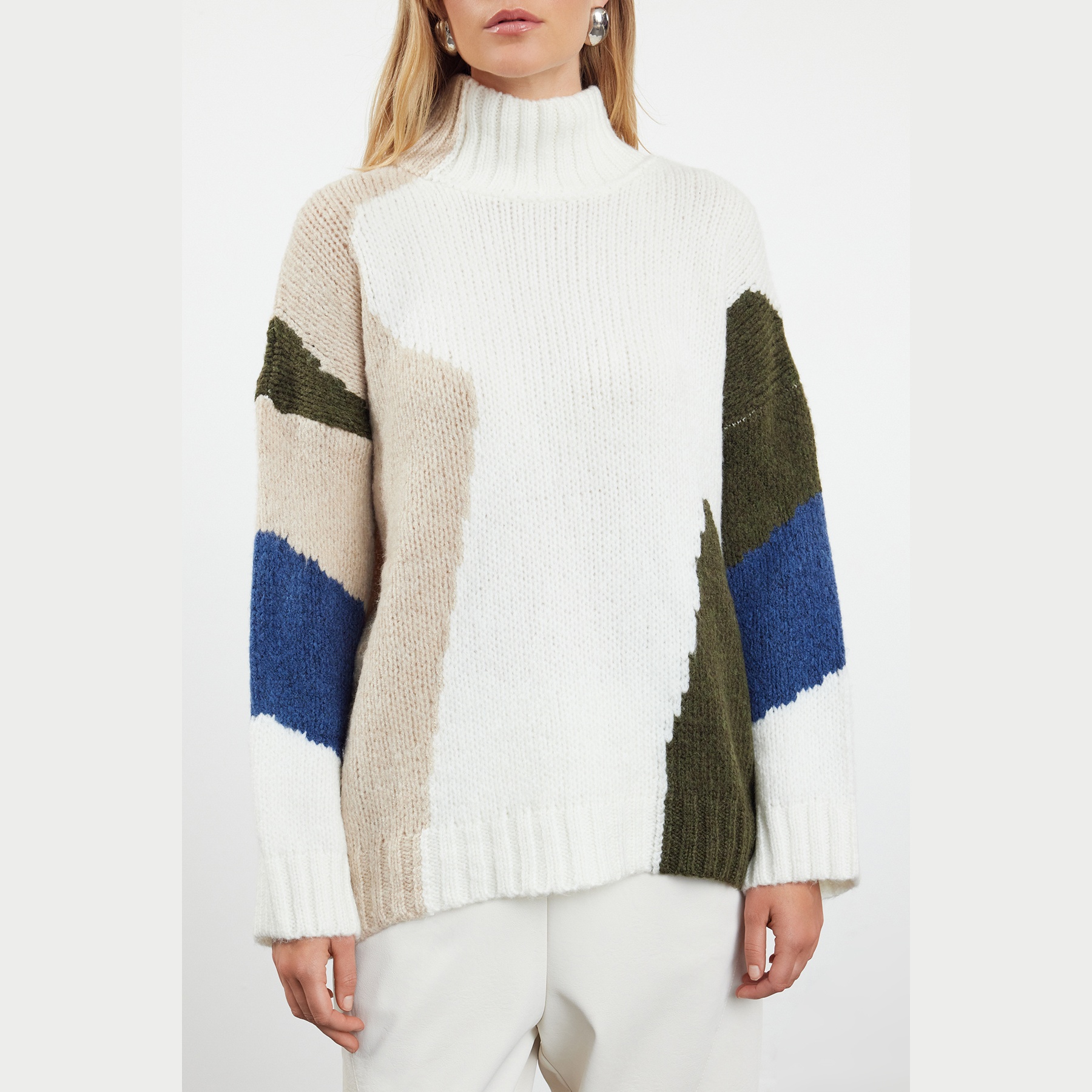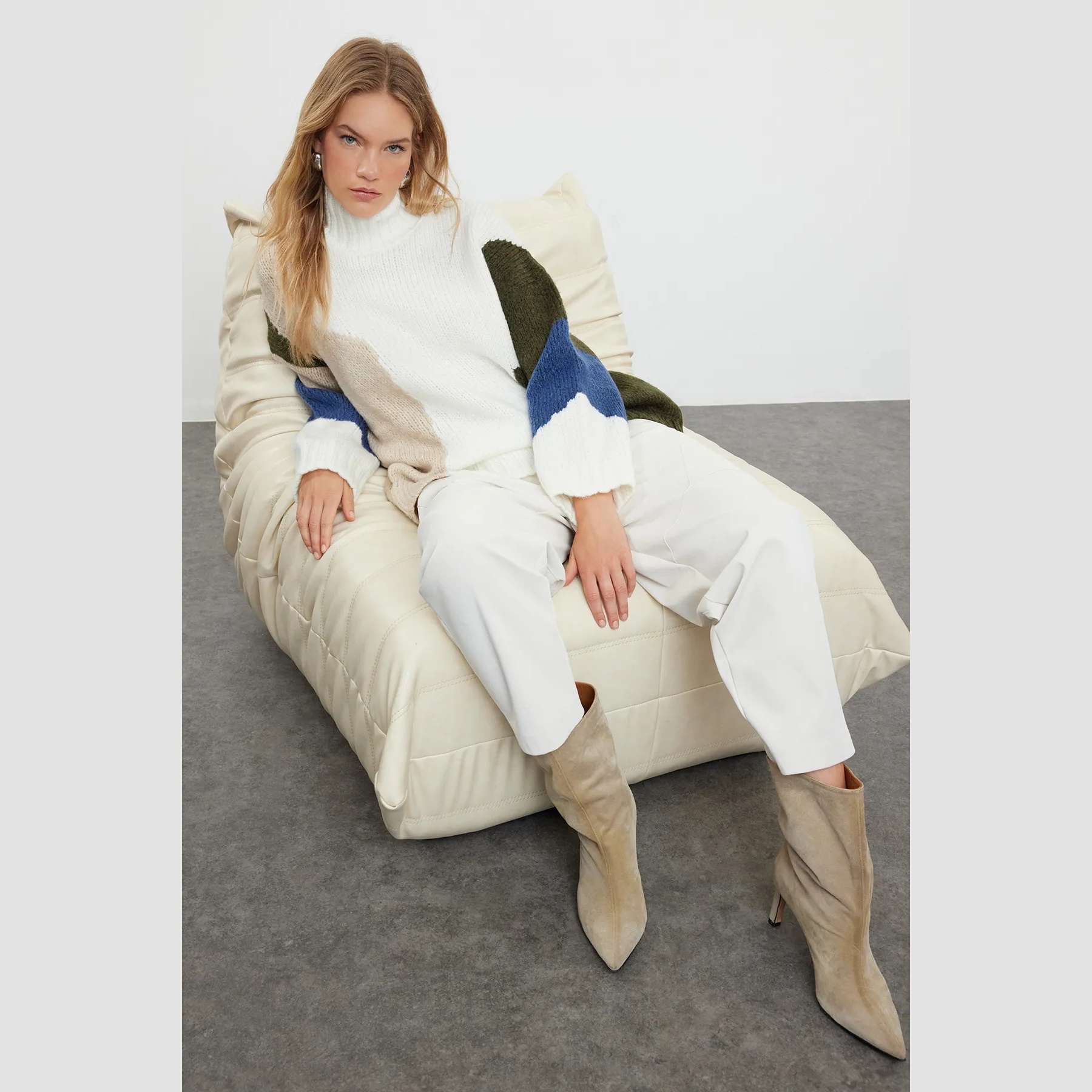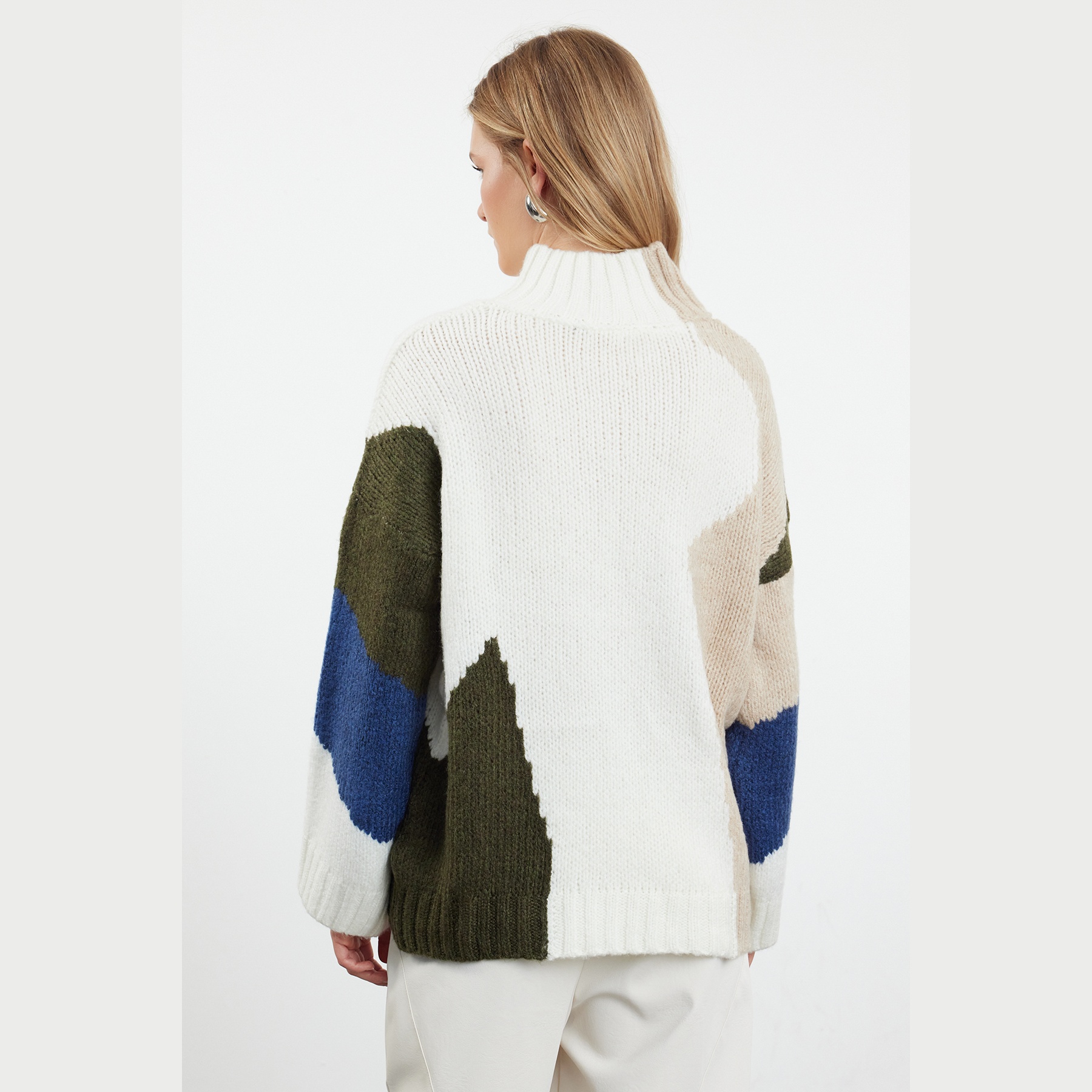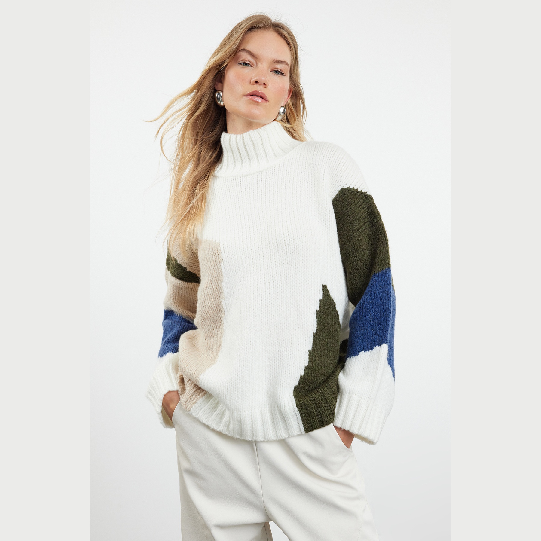 كنزة شتوية بلون إكرُو مع تداخل ألوان أنيق، مصممة بقصة واسعة تمنحك راحة مثالية، وخامة تريكو ناعمة وسميكة توفر دفئًا لطيفًا في الأجواء الباردة. تأتي بياقة مستقيمة مغلقة، وأكمام طويلة بكتف منخفض، ما يجعلها خيارًا مثاليًا للإطلالات اليومية التي تجمع بين الراحة والتميز.