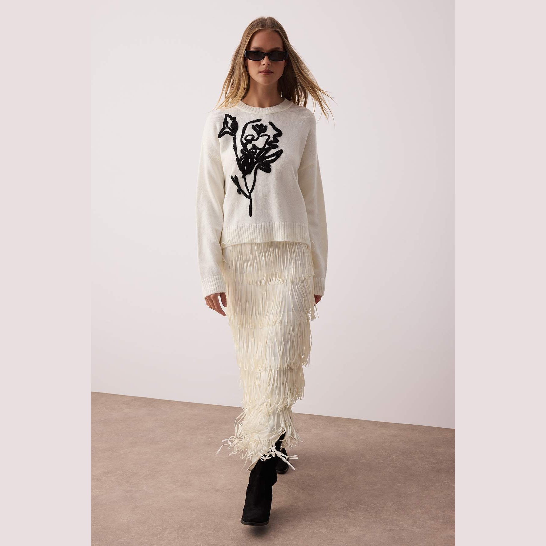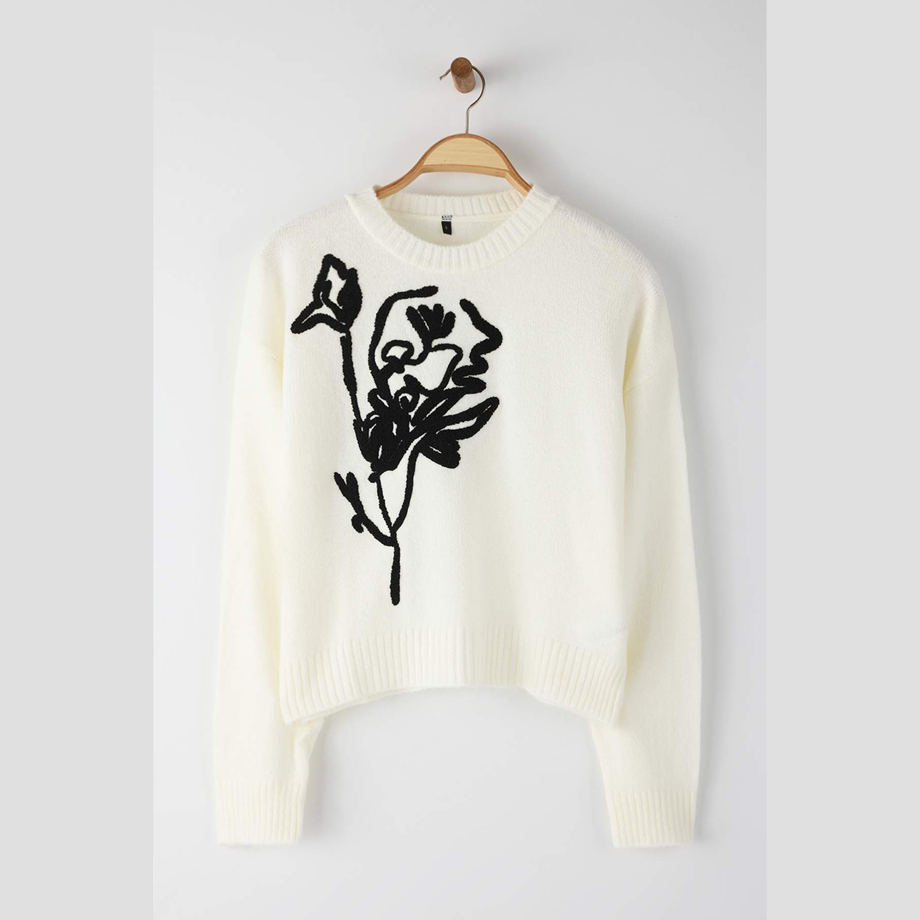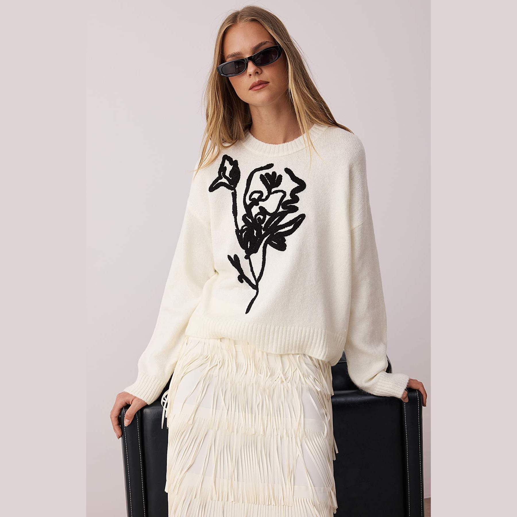 كنزة شتوية بلون إكرُو هادئ، مصممة بخامة تريكو متوسطة السماكة بملمس ناعم، ونقشة مطرزة تضيف لمسة فنية أنيقة. تأتي بقصة واسعة تمنح راحة مثالية، وياقة مستديرة مغلقة، وأكمام طويلة بكتف منخفض، ما يجعلها خيارًا مثاليًا للإطلالات اليومية التي تجمع بين الراحة والرقي.