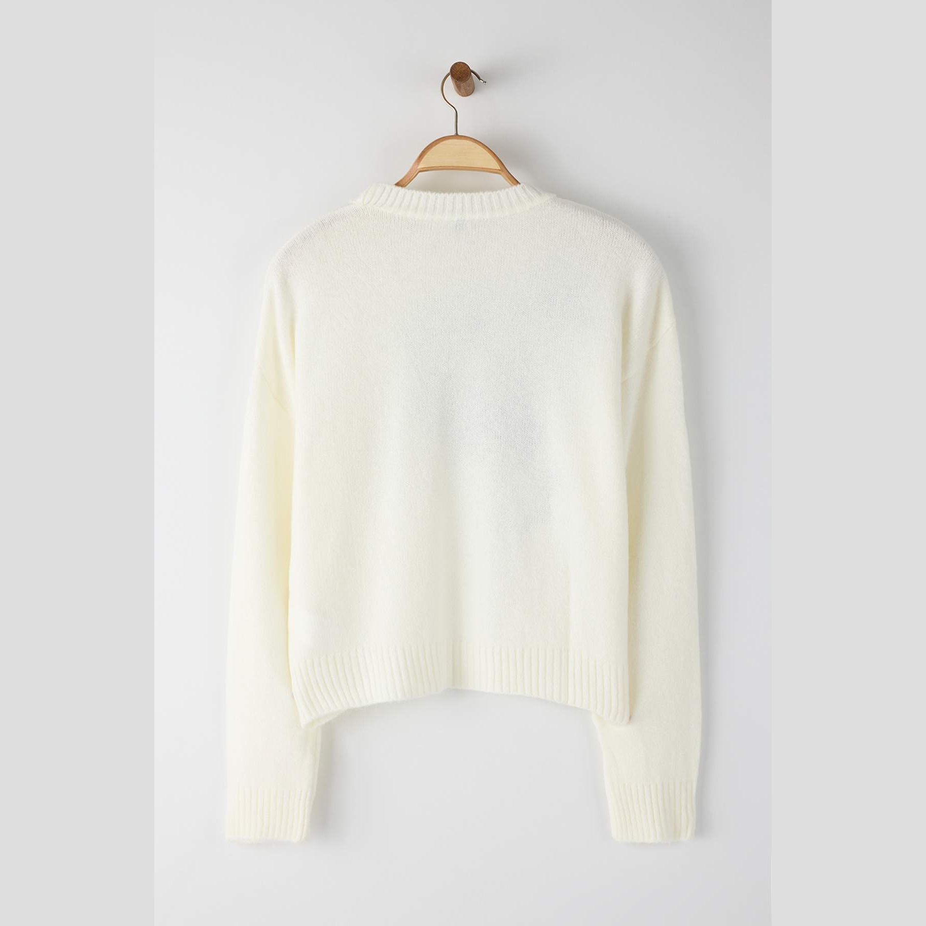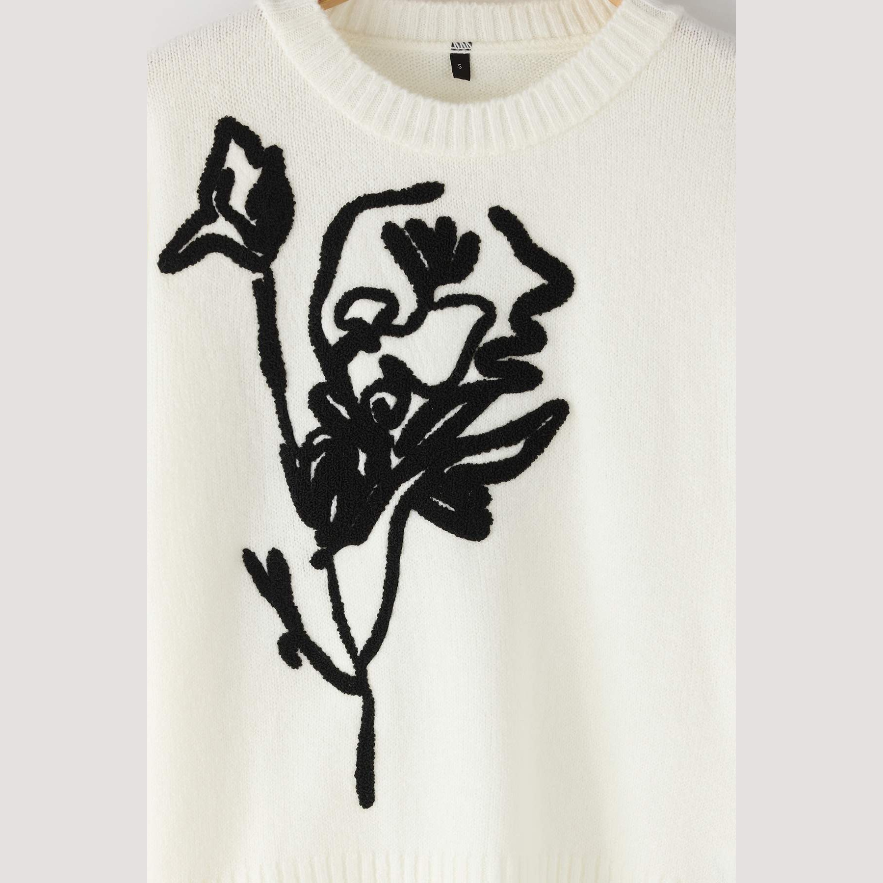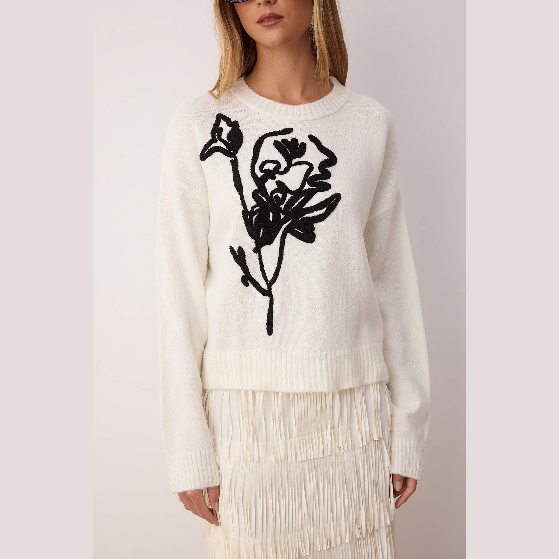 كنزة شتوية بلون إكرُو هادئ، مصممة بخامة تريكو متوسطة السماكة بملمس ناعم، ونقشة مطرزة تضيف لمسة فنية أنيقة. تأتي بقصة واسعة تمنح راحة مثالية، وياقة مستديرة مغلقة، وأكمام طويلة بكتف منخفض، ما يجعلها خيارًا مثاليًا للإطلالات اليومية التي تجمع بين الراحة والرقي.