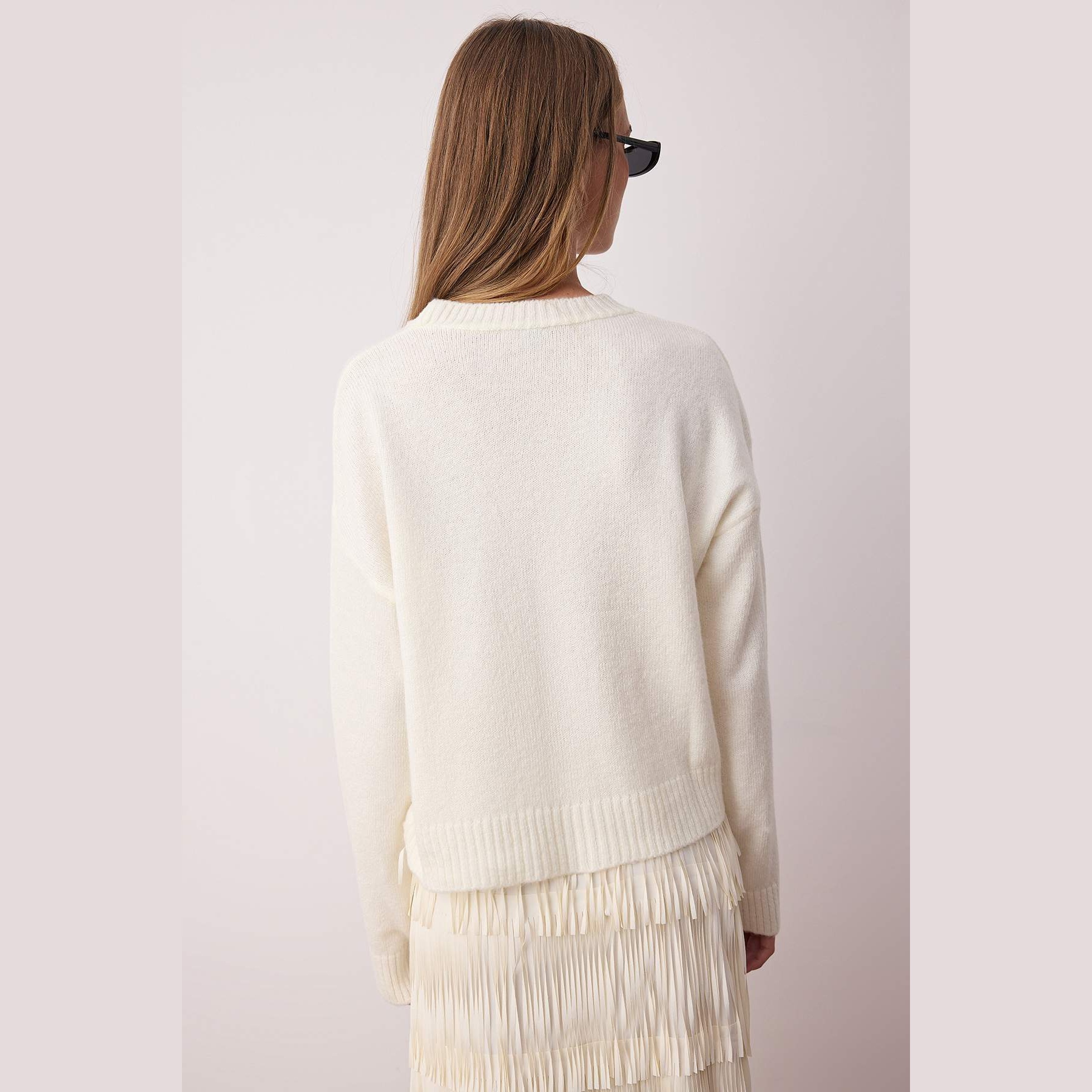 كنزة نسائية – إكرُو بخامة تريكو ناعمة ونقشة مطرزة وقصة واسعة (دفء وأناقة بلمسة فنية)