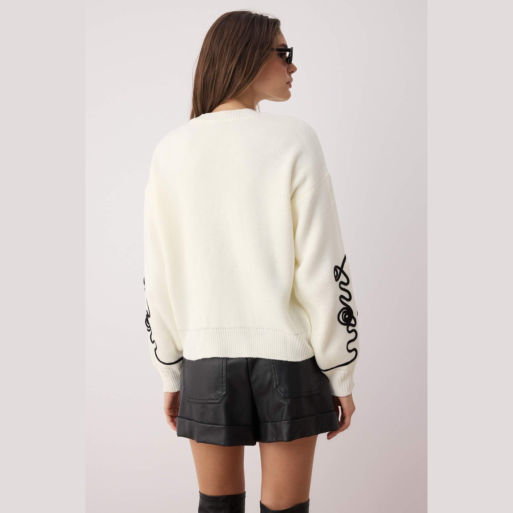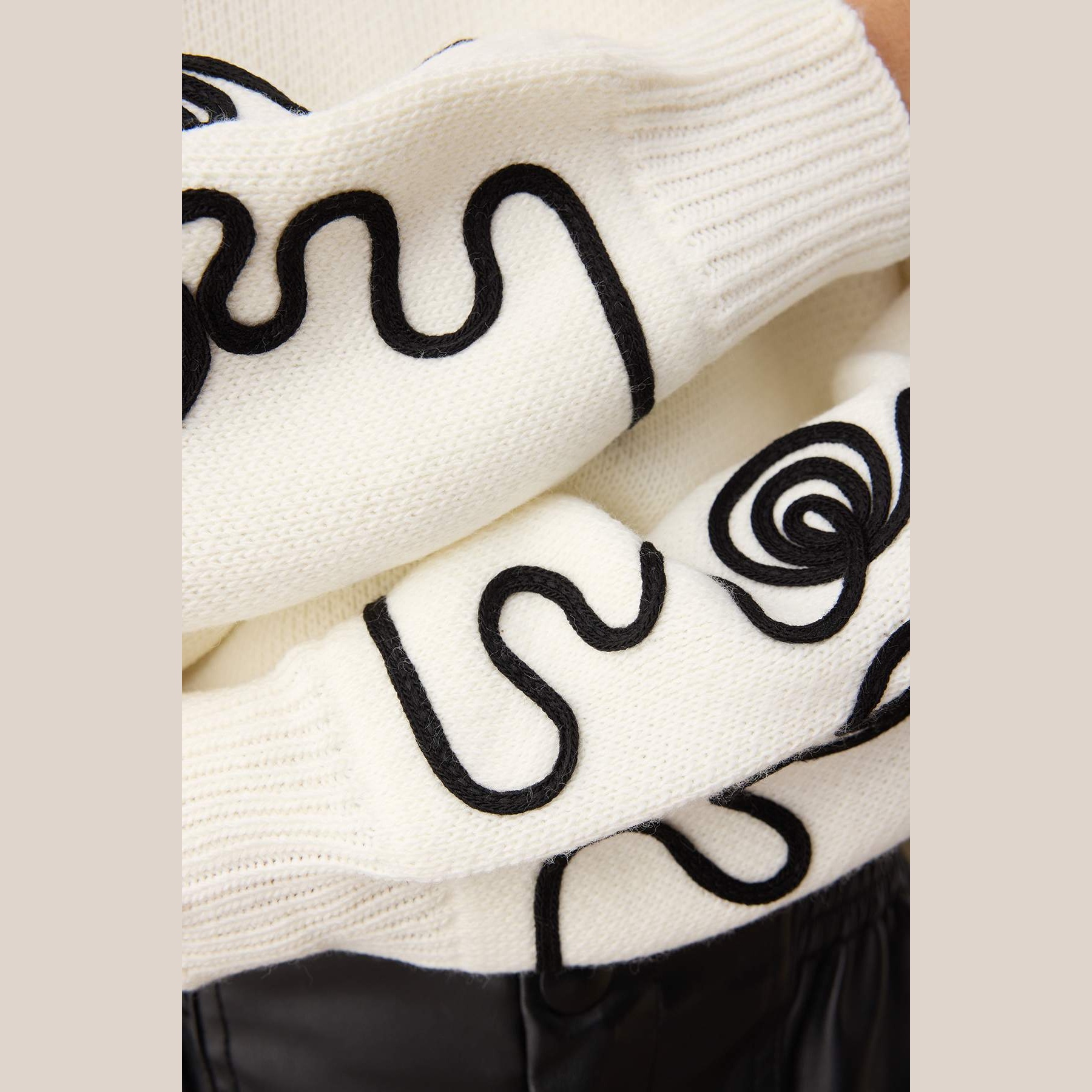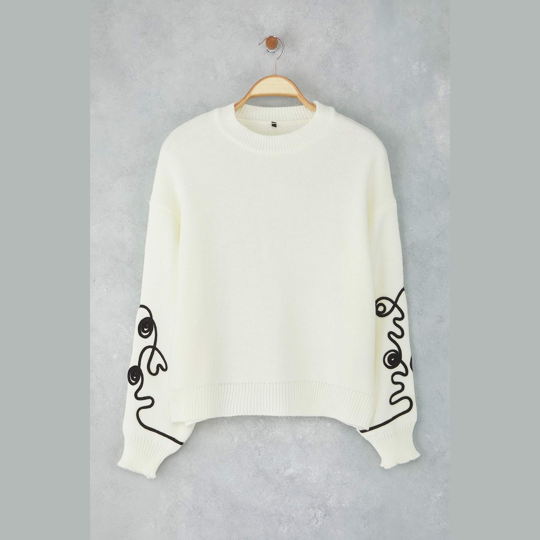 كنزة شتوية بلون إكرُو هادئ، مصممة بقصة واسعة تمنحك راحة مثالية، مع خامة تريكو متوسطة السماكة بملمس ناعم وتفاصيل مطرزة على الأكمام تضيف لمسة فنية أنيقة. تأتي بياقة مستديرة مغلقة، وأكمام طويلة بكتف منخفض، ما يجعلها خيارًا مثاليًا للإطلالات اليومية الشتوية التي تجمع بين الراحة والرقي.