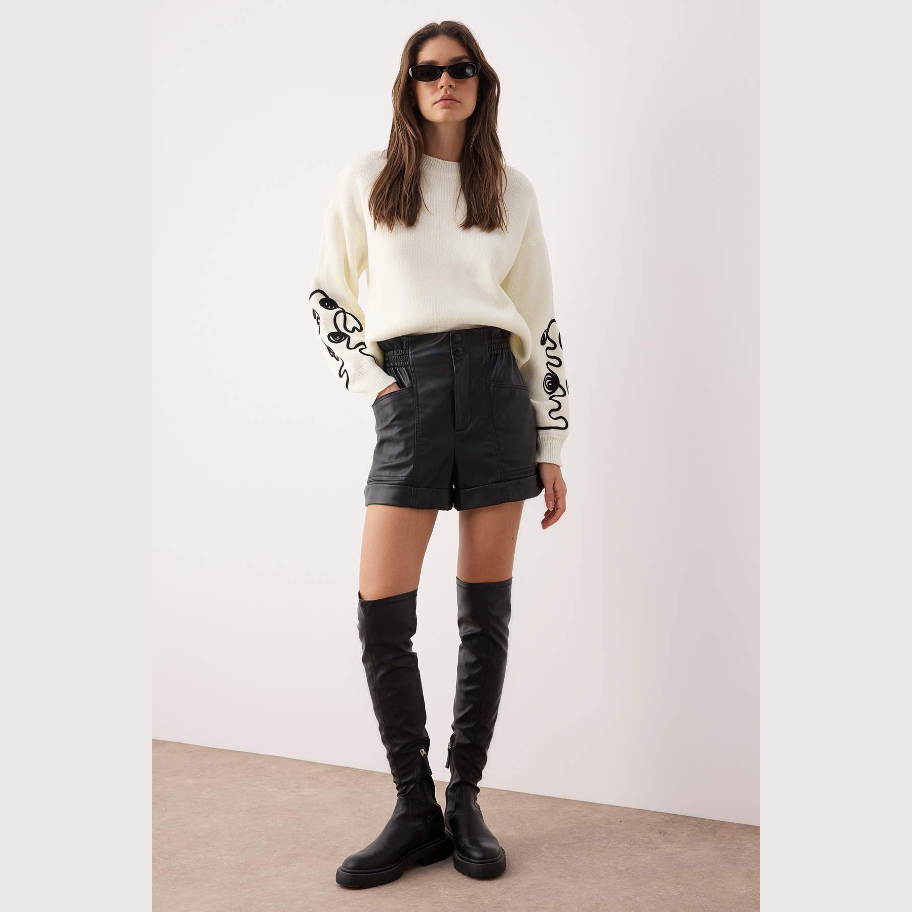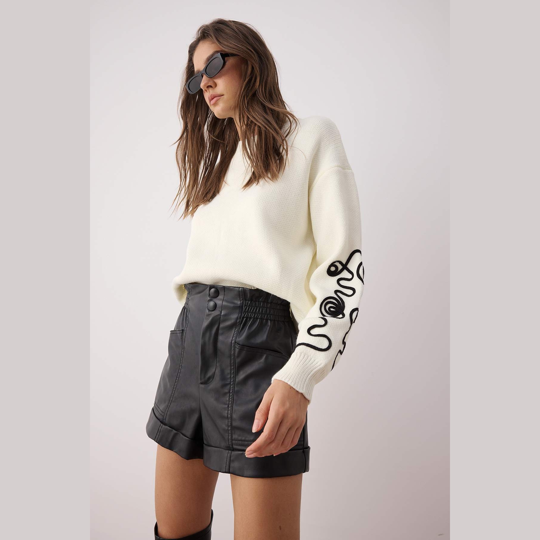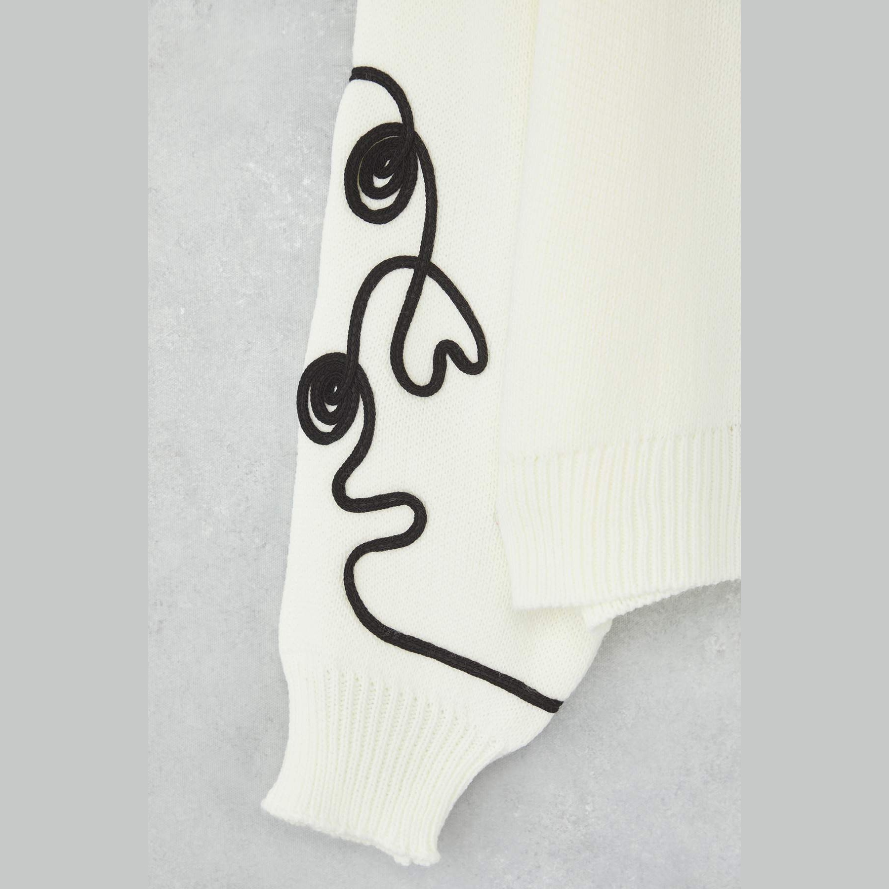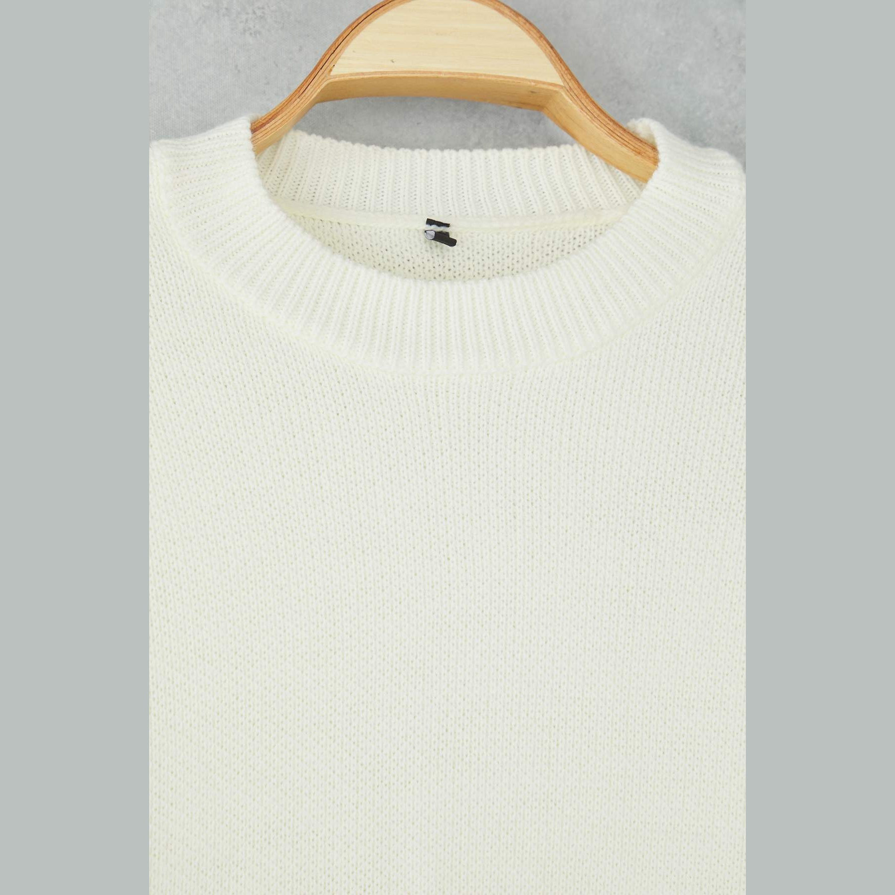 كنزة شتوية بلون إكرُو هادئ، مصممة بقصة واسعة تمنحك راحة مثالية، مع خامة تريكو متوسطة السماكة بملمس ناعم وتفاصيل مطرزة على الأكمام تضيف لمسة فنية أنيقة. تأتي بياقة مستديرة مغلقة، وأكمام طويلة بكتف منخفض، ما يجعلها خيارًا مثاليًا للإطلالات اليومية الشتوية التي تجمع بين الراحة والرقي.