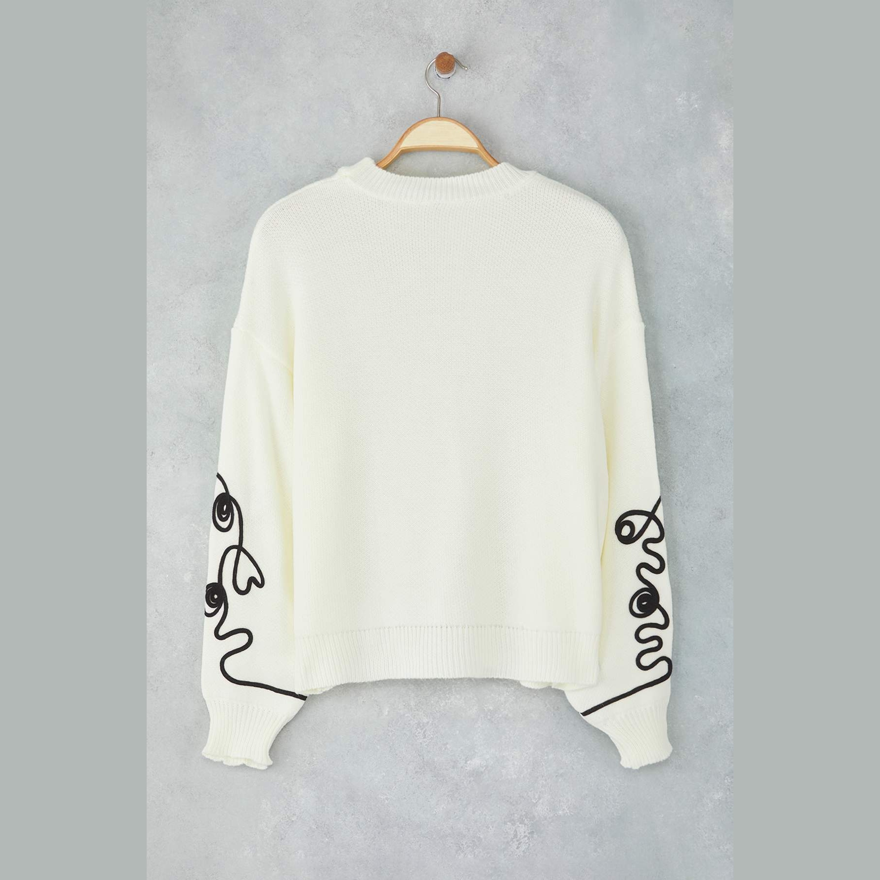 كنزة نسائية – إكرُو بقصة واسعة وتطريز على الأكمام من خامة تريكو ناعمة (دفء وأناقة بلمسة فنية)
