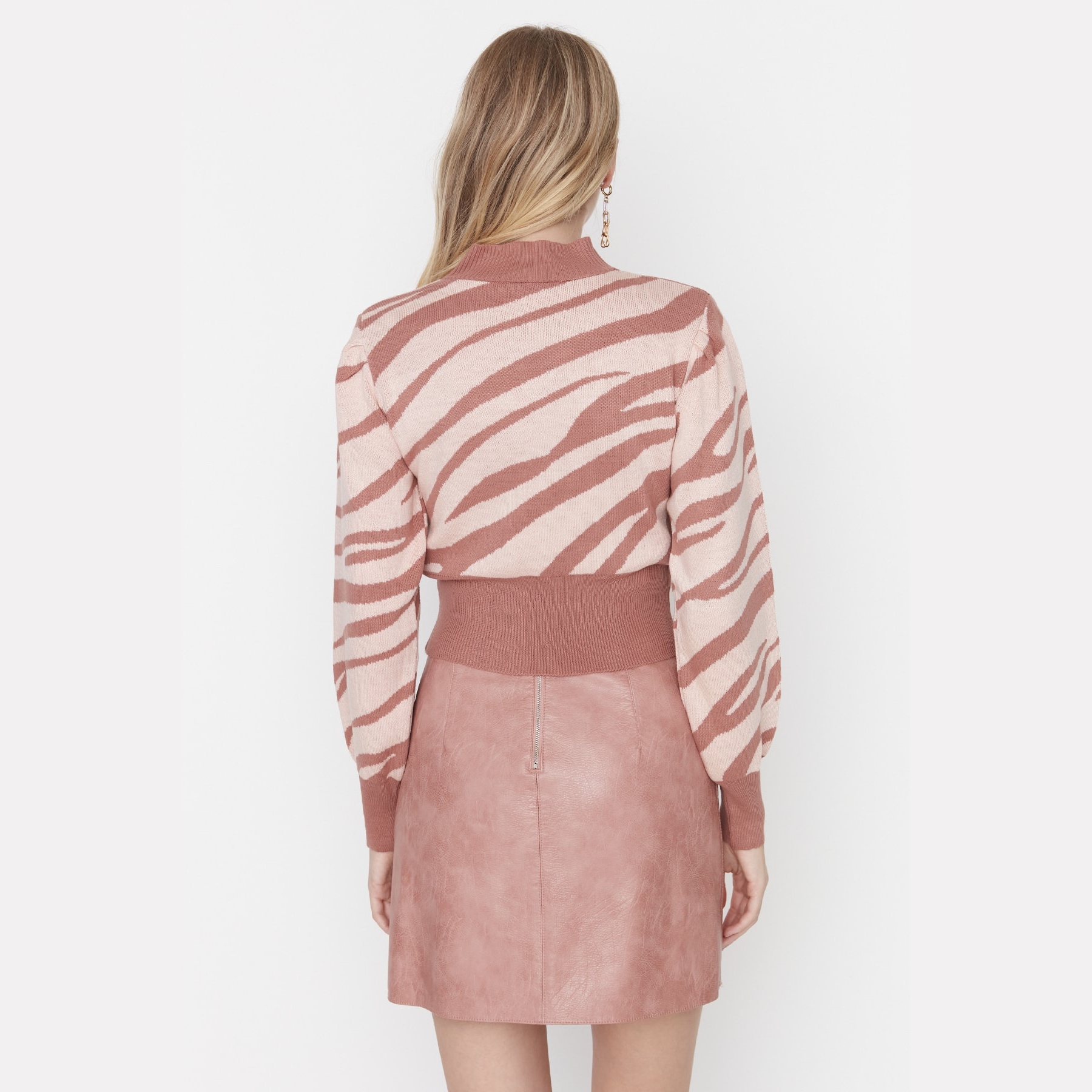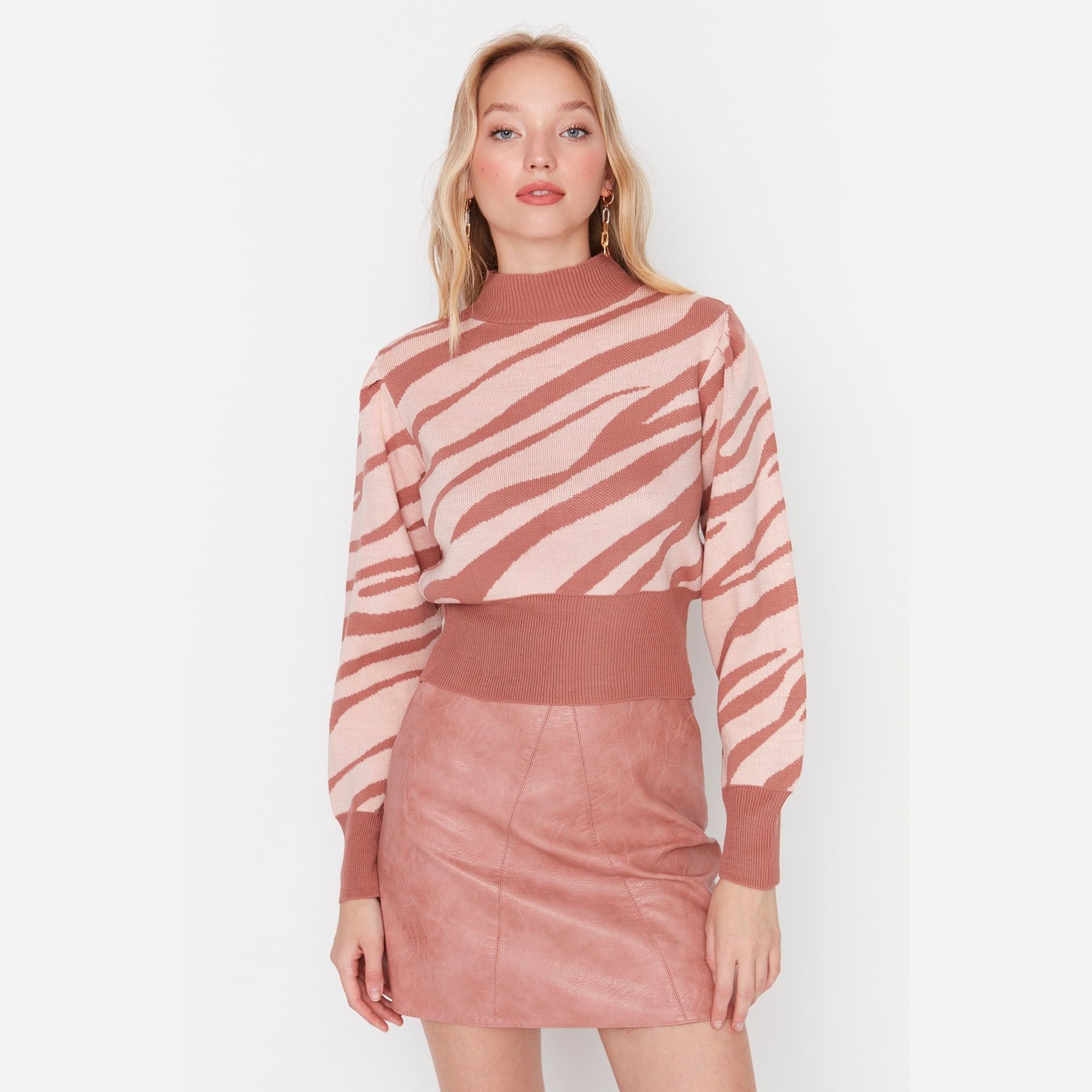 كنزة نسائية – وردي بنقشة حيوانية وقصة قصيرة من خامة تريكو ناعمة (إطلالة ملفتة بلمسة شبابية)