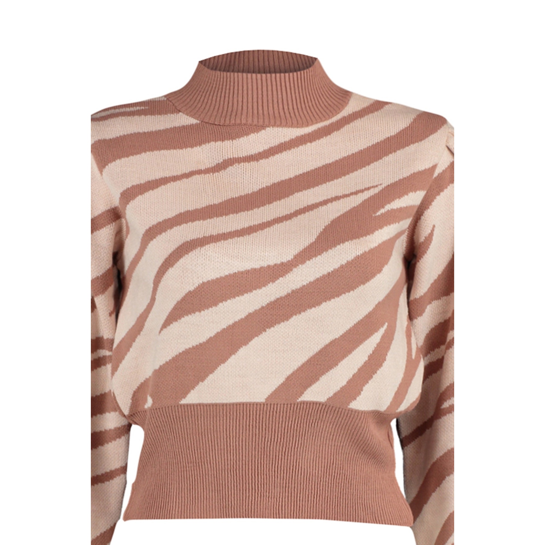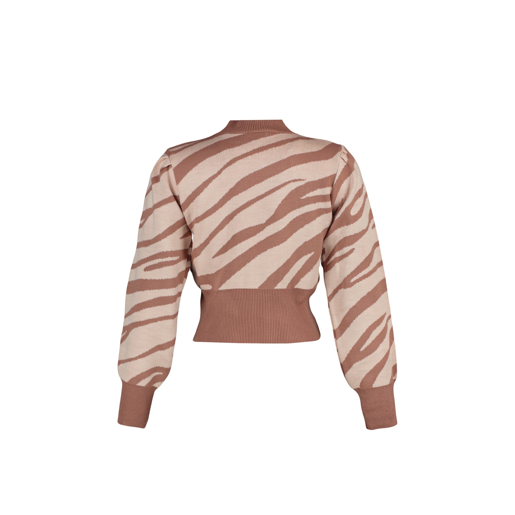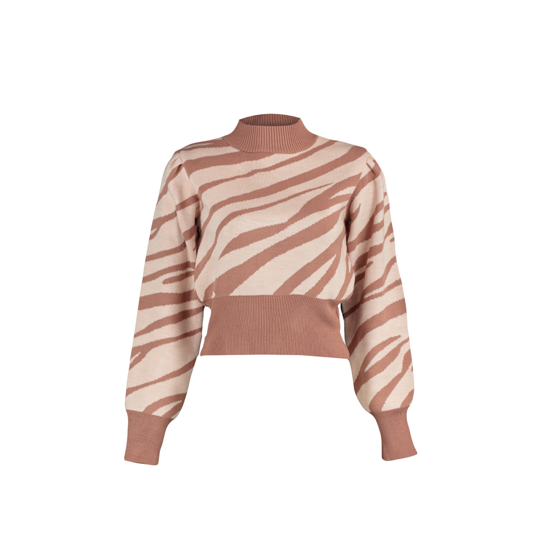 كنزة شتوية بلون وردي هادئ، مصممة بنقشة حيوانية تضيف طابعًا عصريًا جريئًا، مع خامة تريكو متوسطة السماكة بملمس ناعم. تأتي بقصة قصيرة، وياقة مستقيمة مغلقة، وأكمام طويلة بكتف قياسي، ما يجعلها مثالية للإطلالات اليومية التي تجمع بين الراحة والتميز.