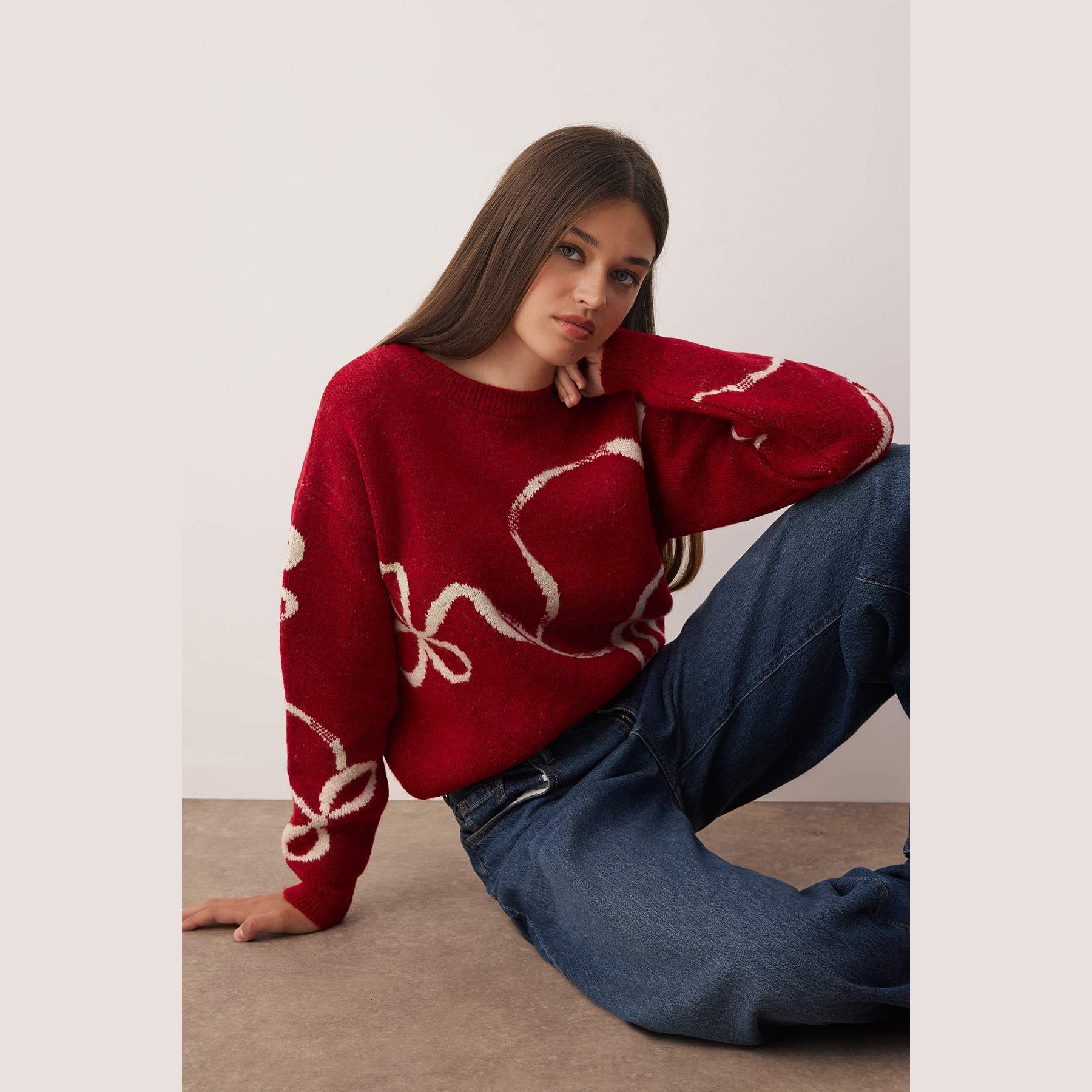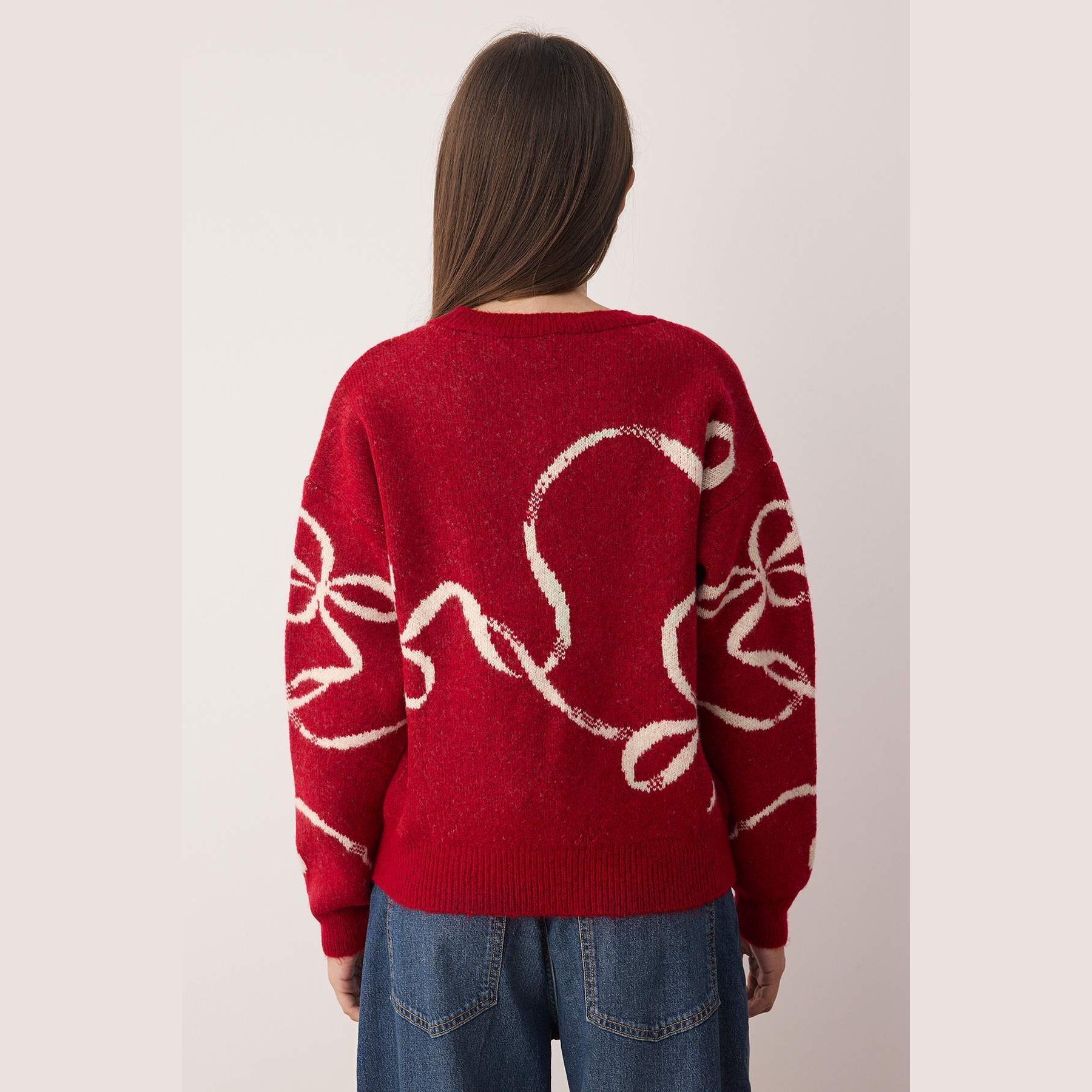 كنزة نسائية – أحمر بتصميم عيد الميلاد وخامة تريكو ناعمة مزينة بخيوط لامعة (أجواء احتفالية بلمسة دافئة ومبهجة)
