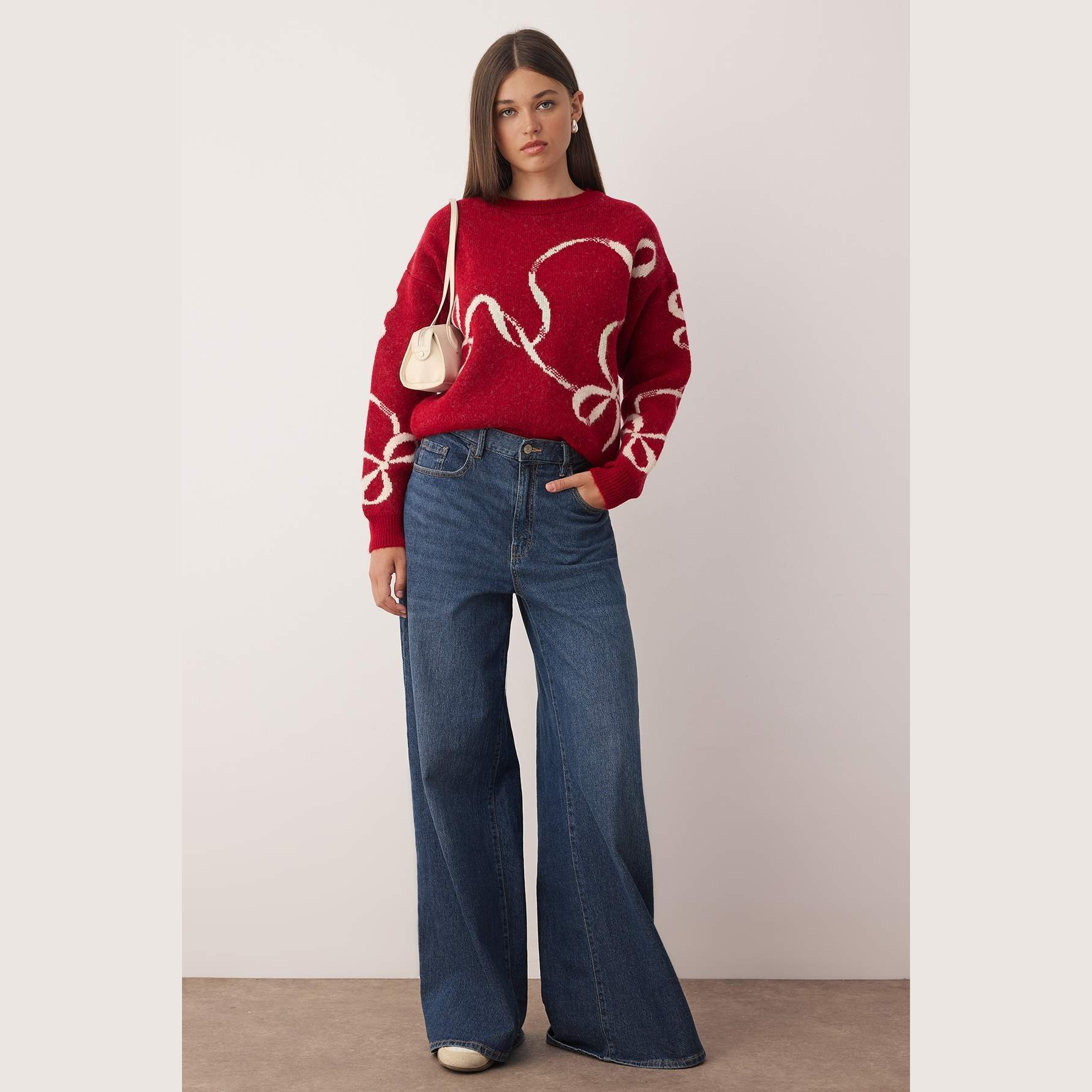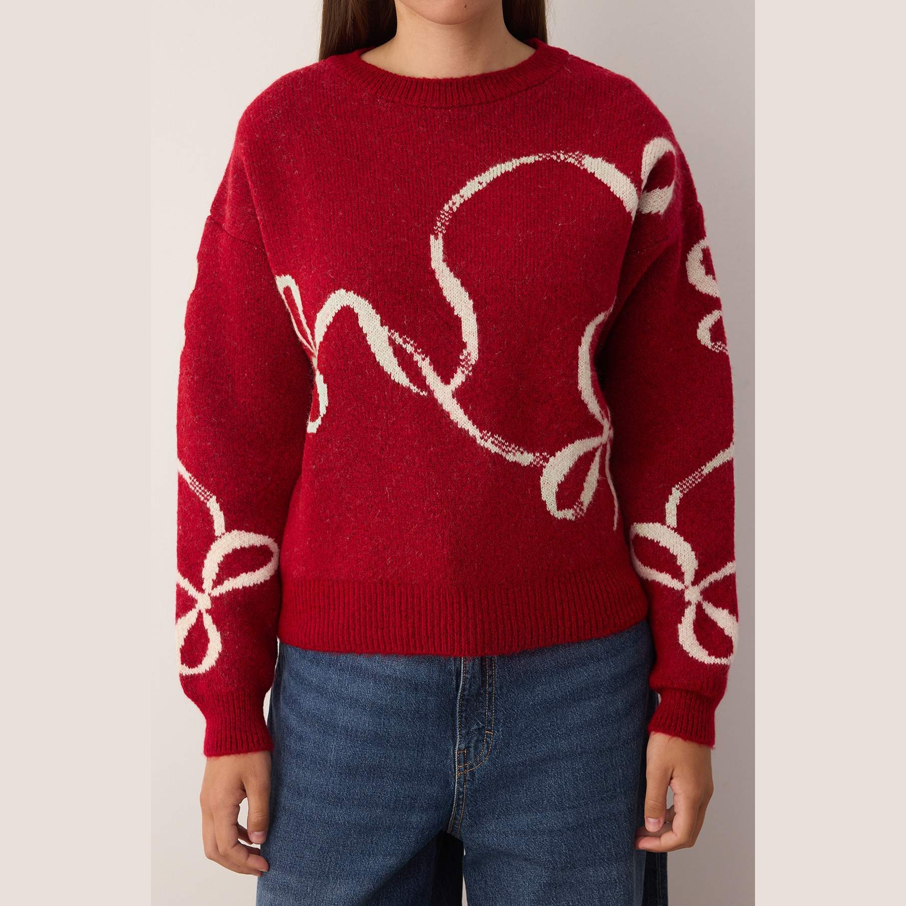 كنزة شتوية بلون أحمر زاهي، مصممة خصيصًا لأجواء عيد الميلاد، بخامة تريكو ناعمة متوسطة السماكة مزينة بخيوط لامعة تضيف لمسة احتفالية مبهجة. تأتي بقصة منتظمة، وياقة مستديرة مغلقة، وأكمام طويلة بكتف قياسي، ما يجعلها مثالية للإطلالات الشتوية المريحة والمليئة بالبهجة.