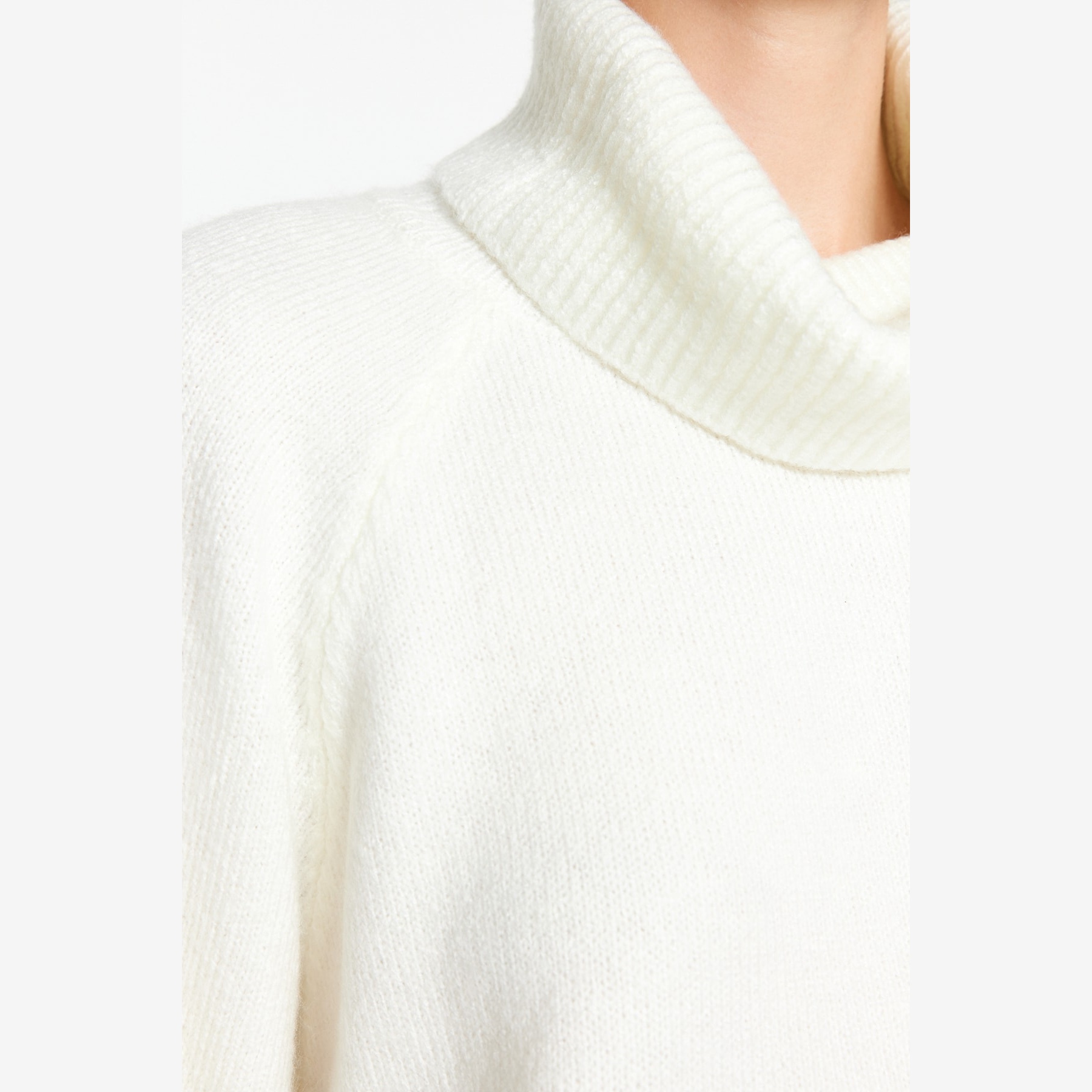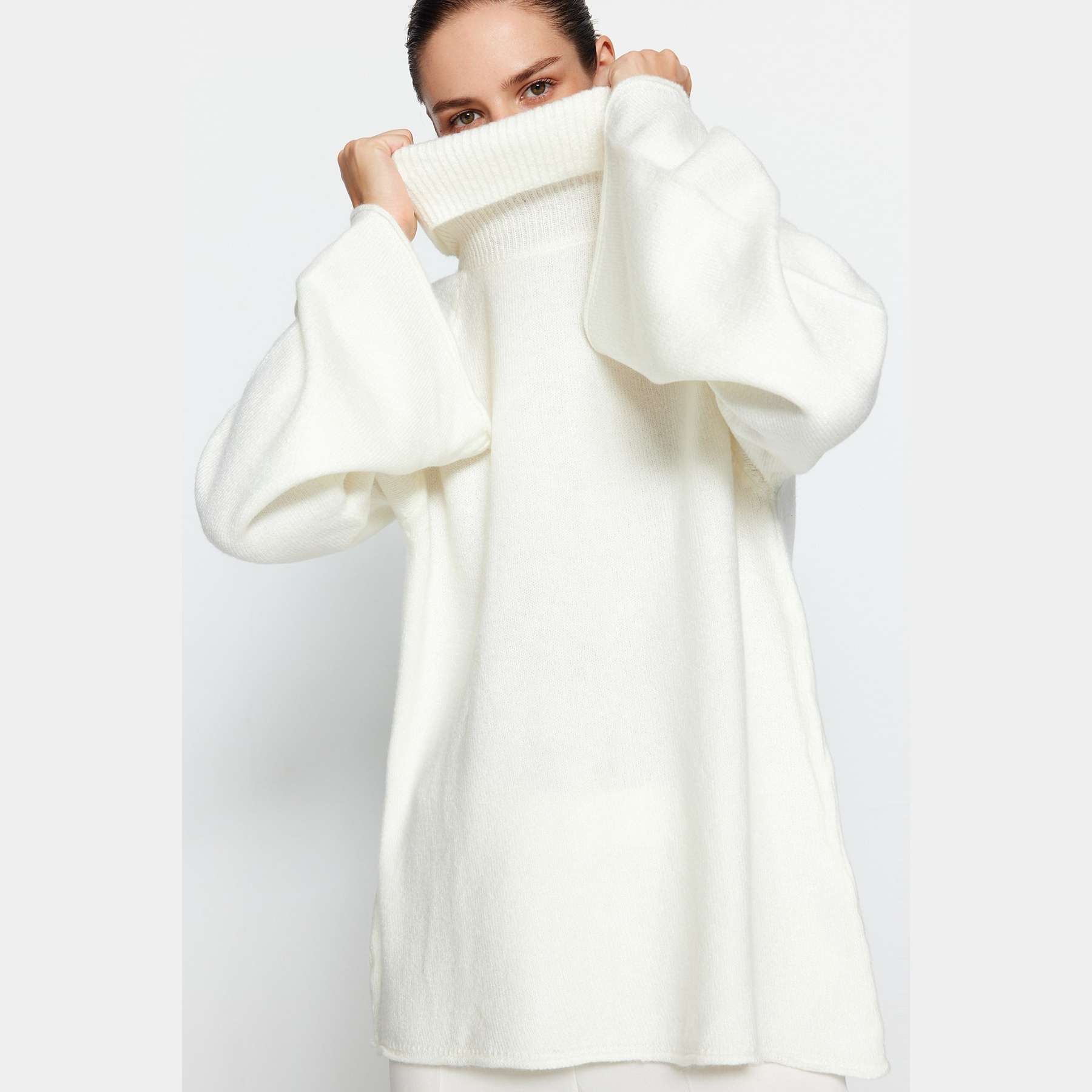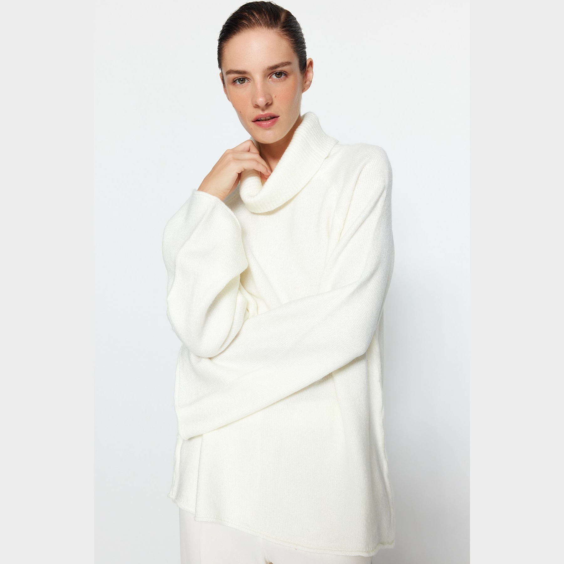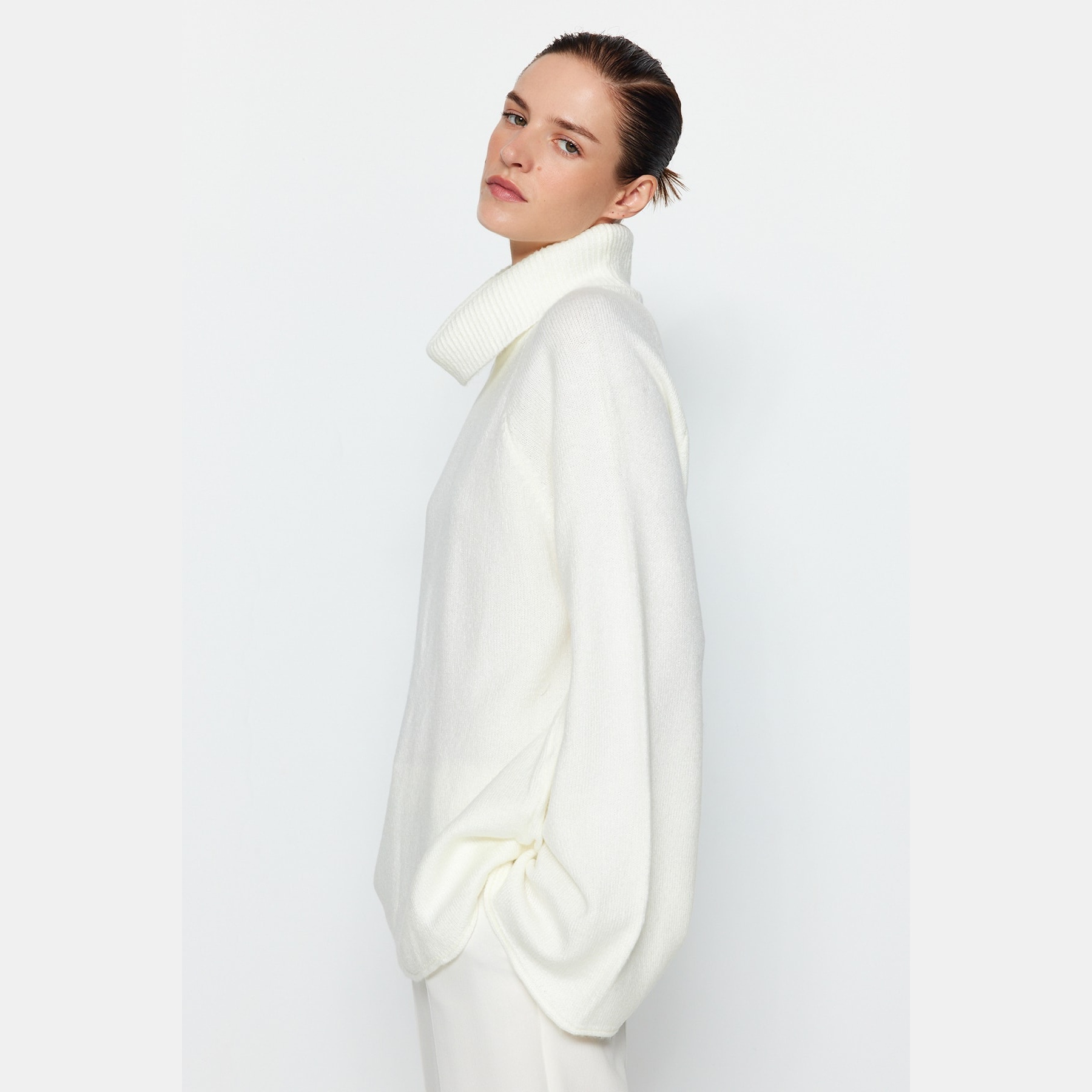 كنزة شتوية بلون إكرُو ناعم، مصممة بقصة واسعة تمنحك راحة مثالية، مع خامة تريكو متوسطة السماكة بملمس ناعم، وياقة عالية تغطي الرقبة بالكامل لتوفير دفء إضافي. تأتي بأكمام طويلة وكتف منخفض، ما يجعلها خيارًا مثاليًا للإطلالات اليومية الشتوية التي تجمع بين الراحة والبساطة.