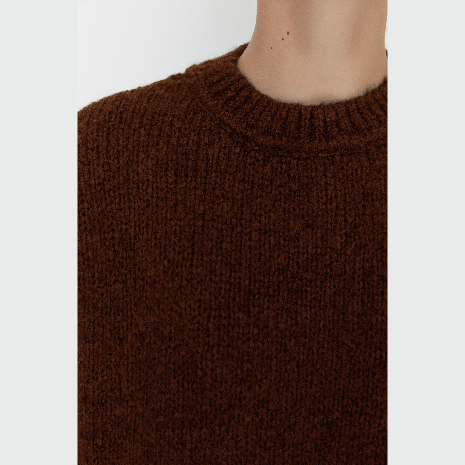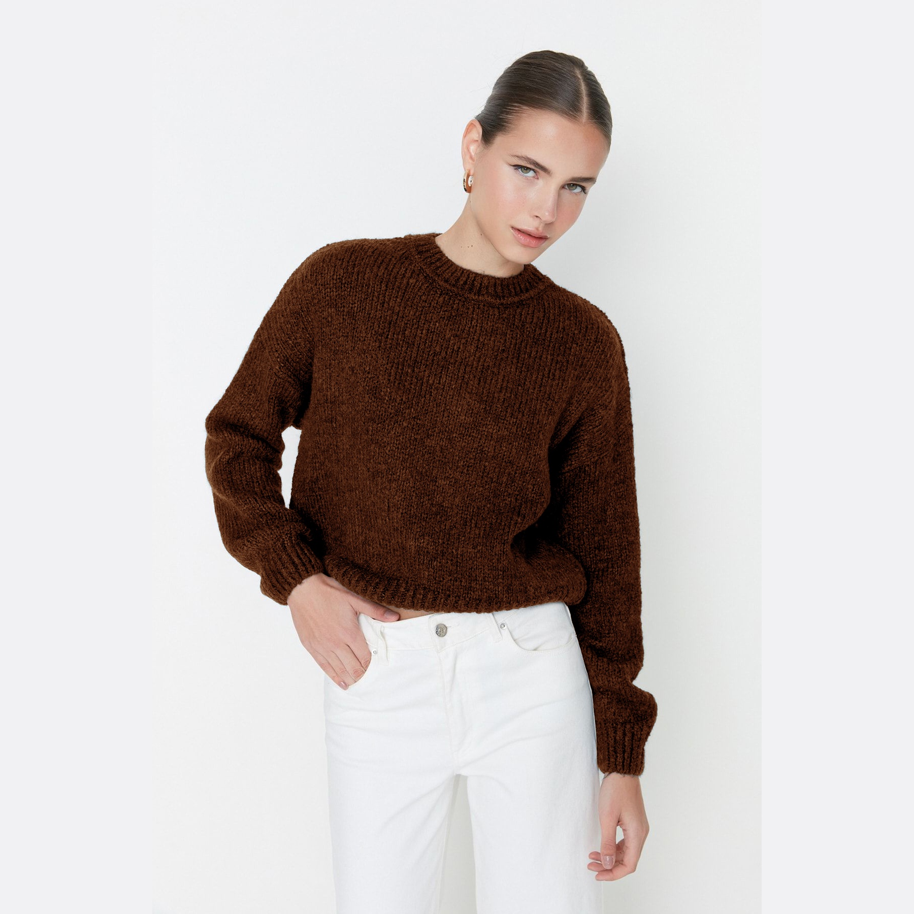 كنزة شتوية بلون بني دافئ، مصممة بقصة واسعة تمنحك حرية في الحركة وراحة مثالية، مع خامة تريكو سميكة وملمس ناعم يناسب الأجواء الباردة. تأتي بياقة مستديرة مغلقة، وأكمام طويلة بكتف منخفض، ما يجعلها خيارًا مثاليًا للإطلالات اليومية البسيطة والدافئة.