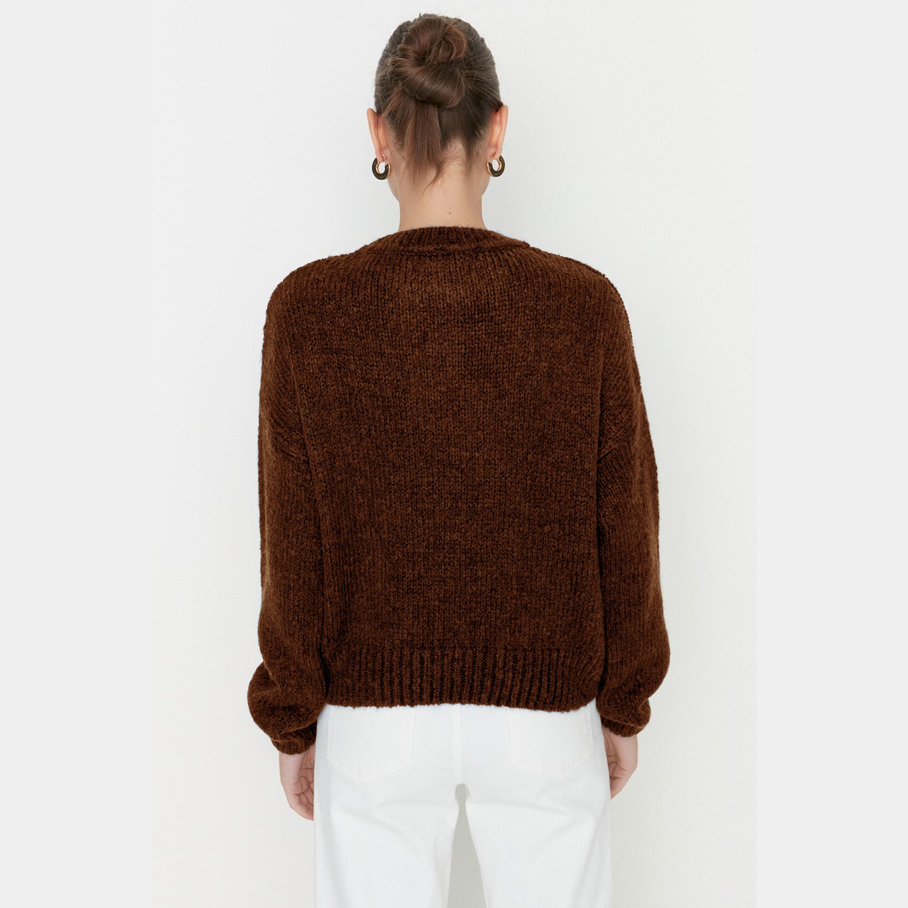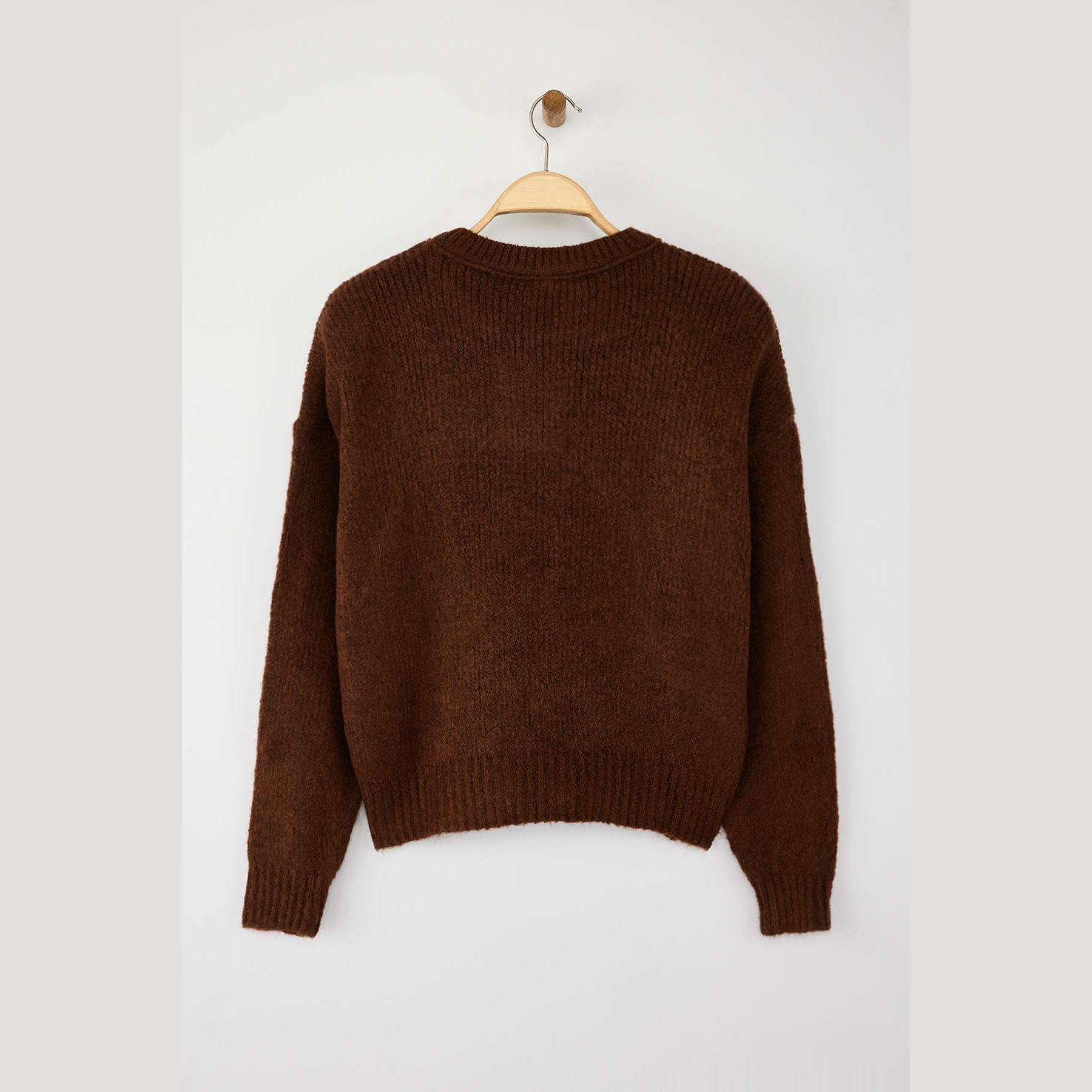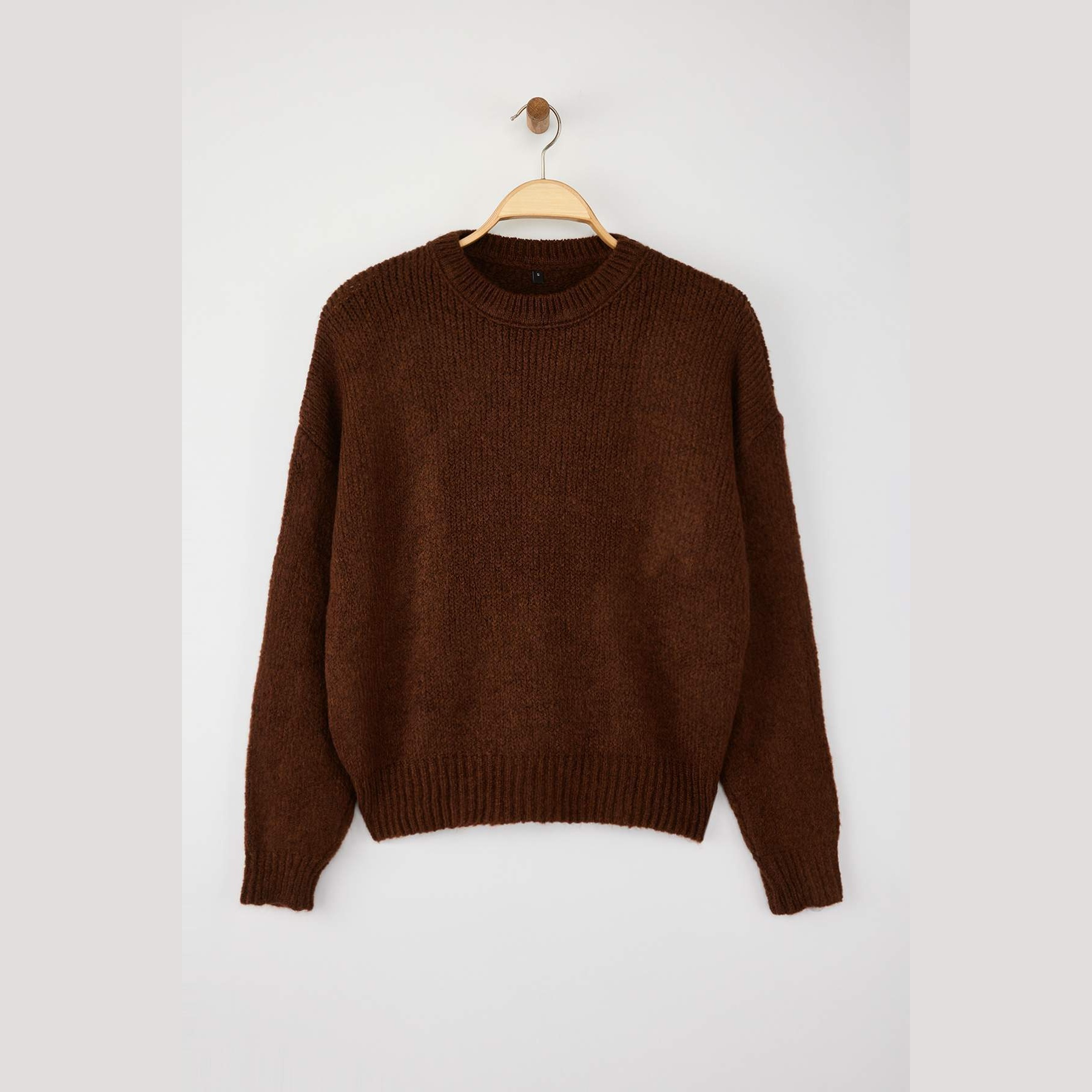 كنزة نسائية – بني بقصة واسعة وخامة تريكو ناعمة (تصميم أساسي دافئ لإطلالة يومية مريحة)